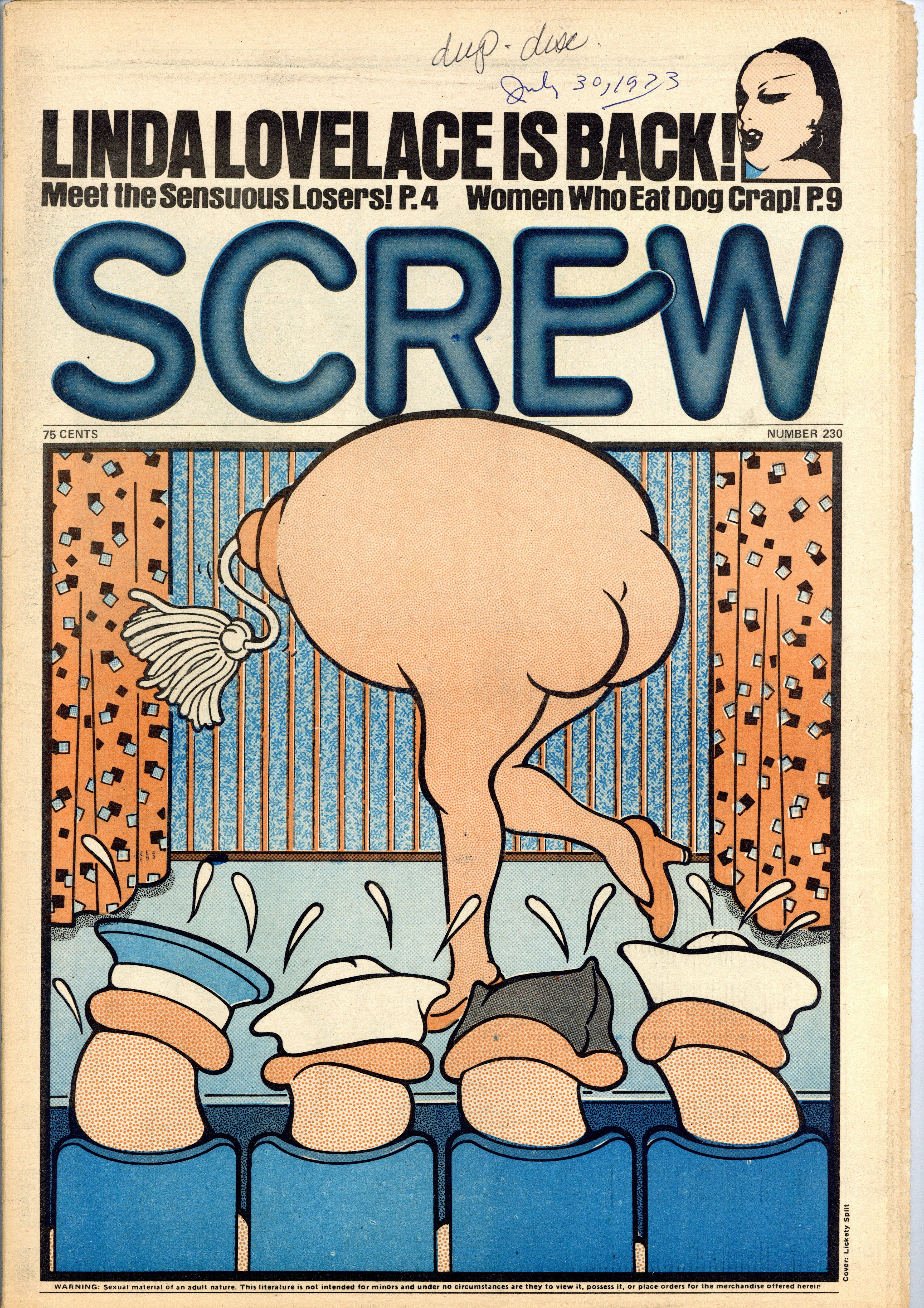 Published Jul 1973 by Milky Way Productions.$4.20Screw was a weekly tabloid newspaper published and edited by Al Goldstein and his Milky Way Productions. This New York based publication was notable for being a pioneer in bringing hardcore pornography into the American mainstream during the late 1960s and early 1970s. Cover by Lickety Split. Tabloid format, 11.5" x 16.75", 40 pages, B&W. ADULT MATERIAL Cover price $0.75.