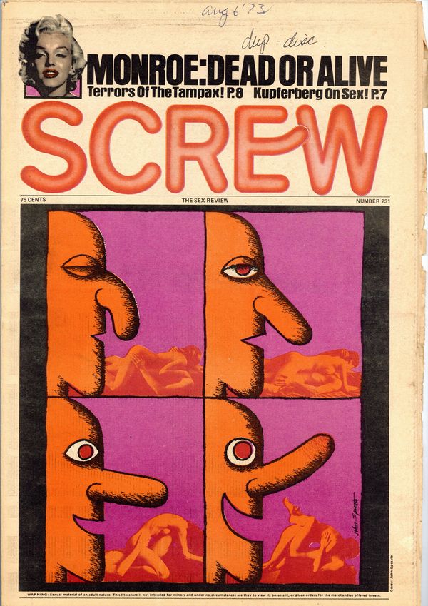Published Aug 1973 by Milky Way Productions.$4.20Screw was a weekly tabloid newspaper published and edited by Al Goldstein and his Milky Way Productions. This New York based publication was notable for being a pioneer in bringing hardcore pornography into the American mainstream during the late 1960s and early 1970s. Cover by John Sposato. Tabloid format, 11.5" x 16.75", 40 pages, B&W. ADULT MATERIAL Cover price $0.75.