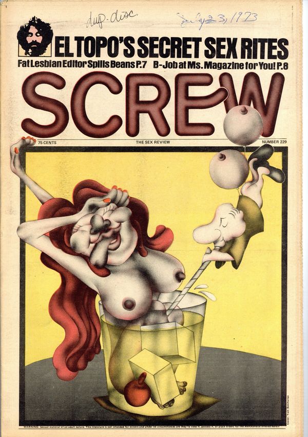 Published Jul 1973 by Milky Way Productions.$14.25Screw was a weekly tabloid newspaper published and edited by Al Goldstein and his Milky Way Productions. This New York based publication was notable for being a pioneer in bringing hardcore pornography into the American mainstream during the late 1960s and early 1970s. Cover by Tom Balchunas. Tabloid format, 11.5" x 16.75", 40 pages, B&W. ADULT MATERIAL Cover price $0.75.