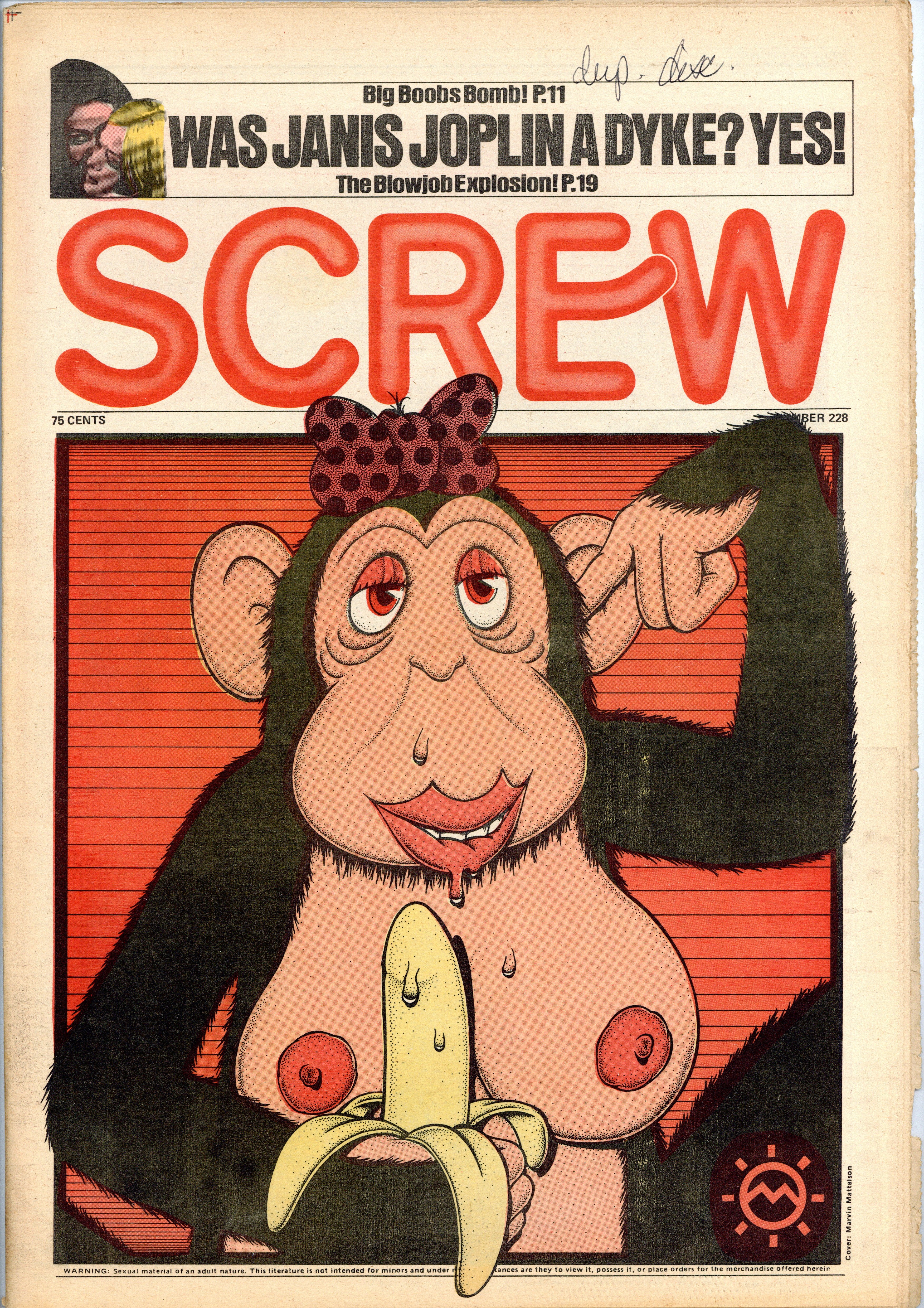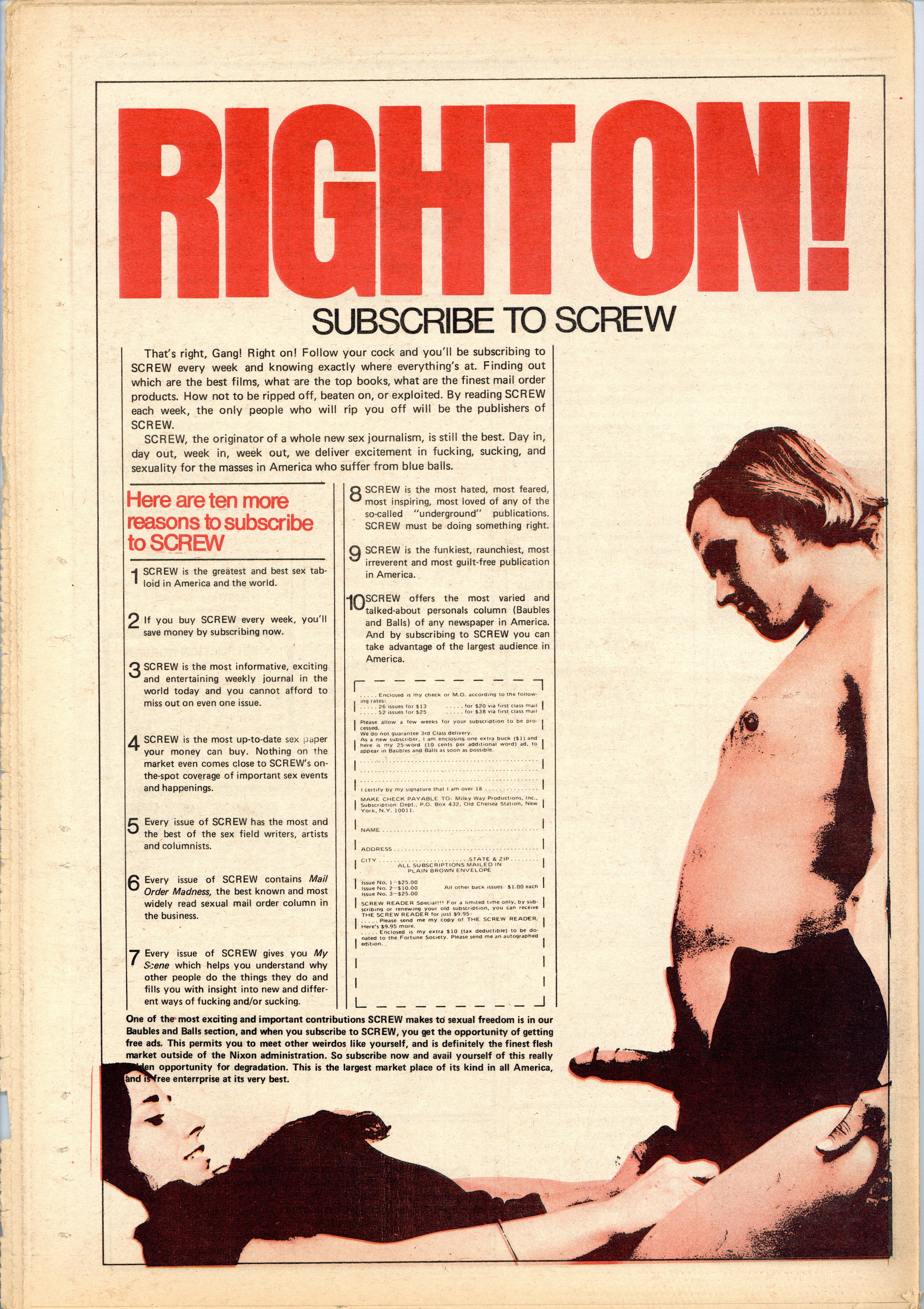Published Jul 1973 by Milky Way Productions.$9.00Screw was a weekly tabloid newspaper published and edited by Al Goldstein and his Milky Way Productions. This New York based publication was notable for being a pioneer in bringing hardcore pornography into the American mainstream during the late 1960s and early 1970s. Cover by Marvin Mattelson. Tabloid format, 11.5" x 16.75", 40 pages, B&W. ADULT MATERIAL Cover price $0.75.