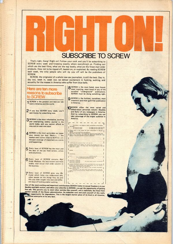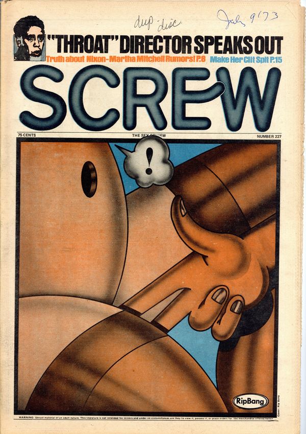 Published Jul 1973 by Milky Way Productions.$7.20Screw was a weekly tabloid newspaper published and edited by Al Goldstein and his Milky Way Productions. This New York based publication was notable for being a pioneer in bringing hardcore pornography into the American mainstream during the late 1960s and early 1970s. Cover by Rip Bang. Tabloid format, 11.5" x 16.75", 40 pages, B&W. ADULT MATERIAL Cover price $0.75.