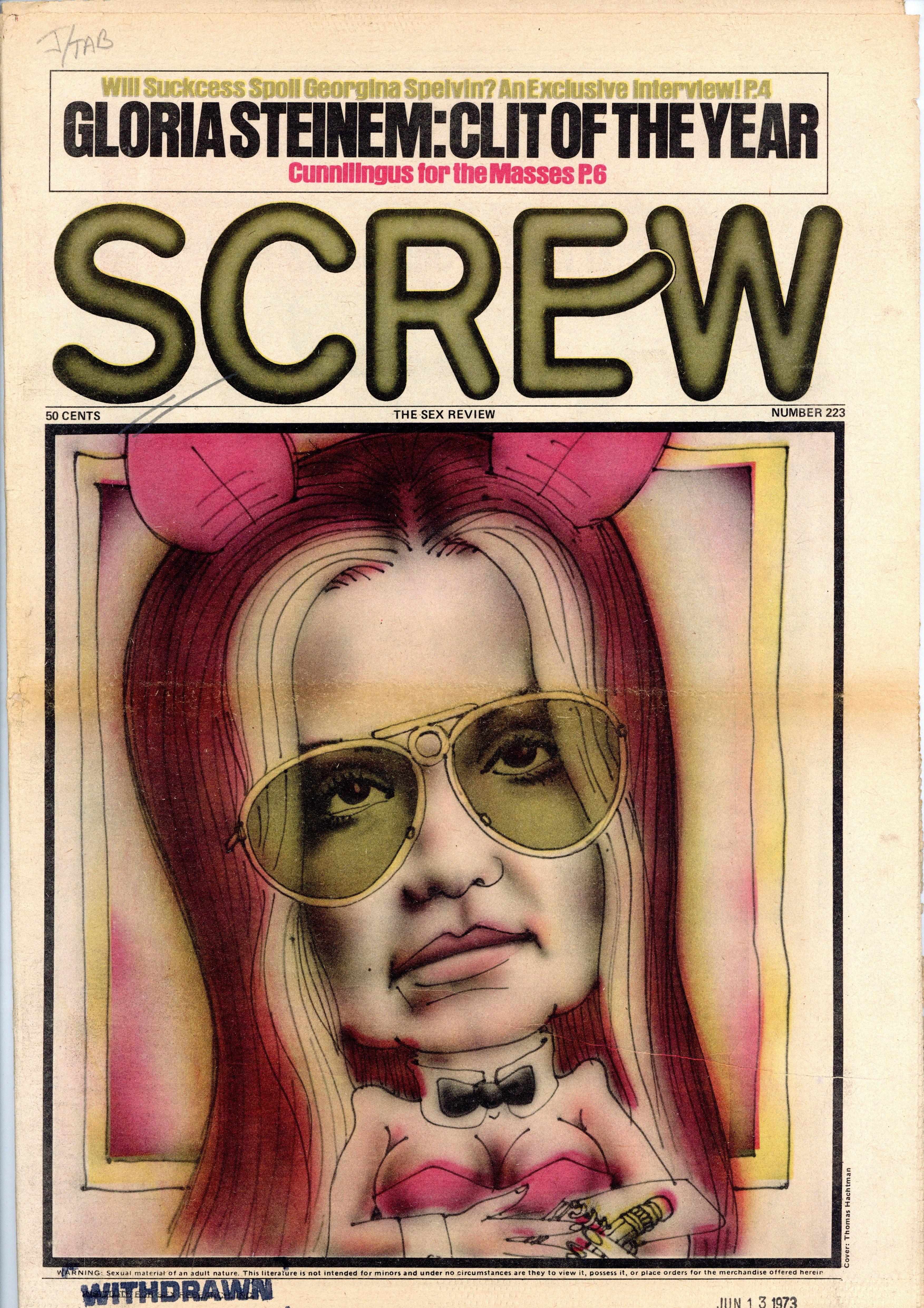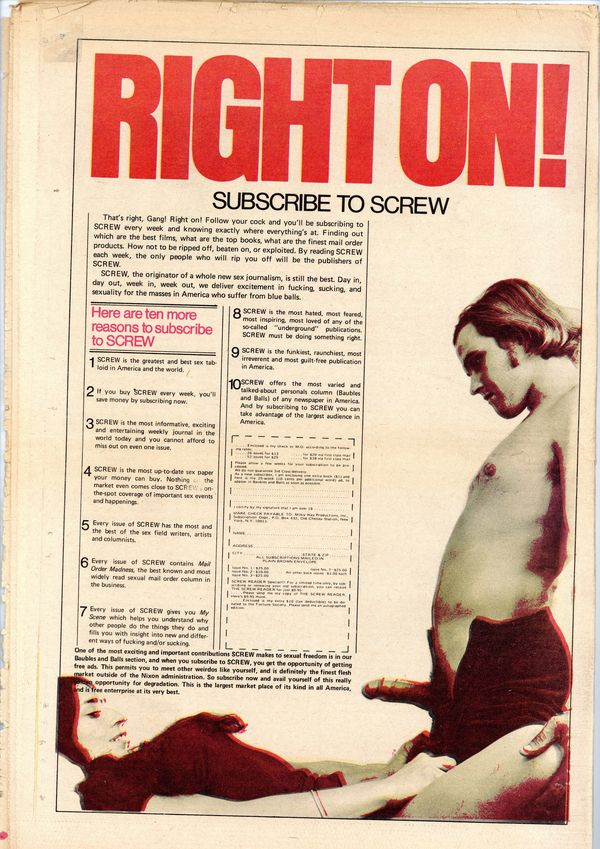 Published Jun 1973 by Milky Way Productions.$3.00Screw was a weekly tabloid newspaper published and edited by Al Goldstein and his Milky Way Productions. This New York based publication was notable for being a pioneer in bringing hardcore pornography into the American mainstream during the late 1960s and early 1970s. Cover by Thomas Hachtman. Tabloid format, 11.5" x 16.75", 32 pages, B&W. ADULT MATERIAL Cover price $0.50.