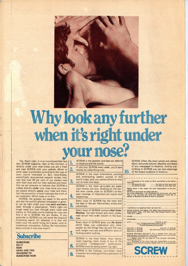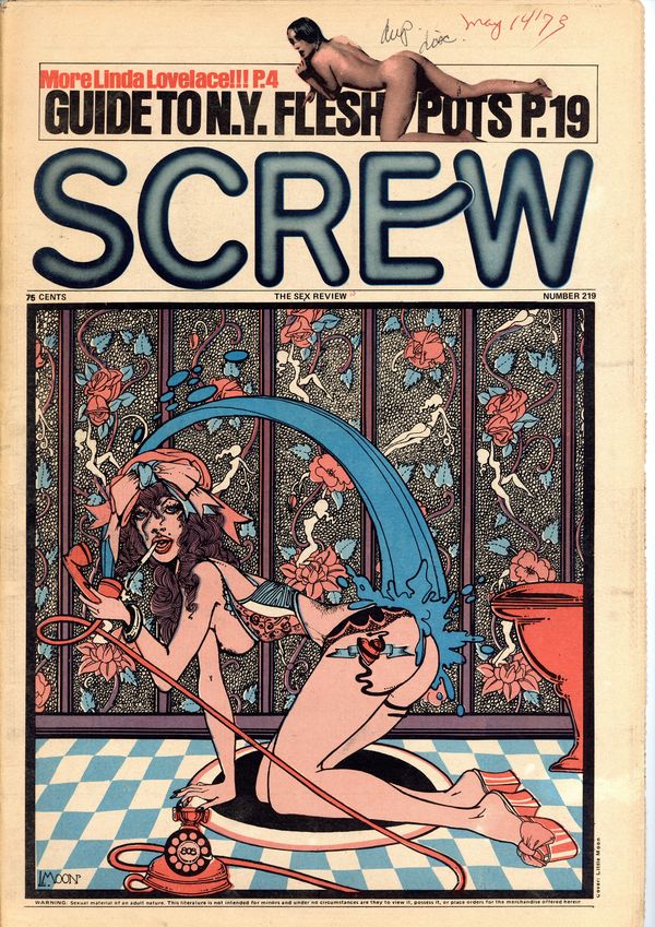 Published May 1973 by Milky Way Productions.$9.00Screw was a weekly tabloid newspaper published and edited by Al Goldstein and his Milky Way Productions. This New York based publication was notable for being a pioneer in bringing hardcore pornography into the American mainstream during the late 1960s and early 1970s. Cover by Little Moon. Tabloid format, 11.5" x 16.75", 32 pages, B&W. ADULT MATERIAL Cover price $0.75.