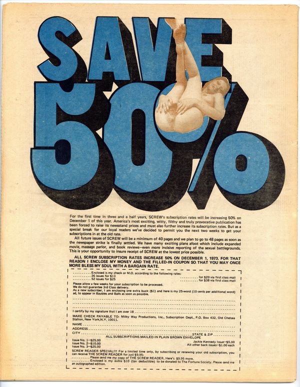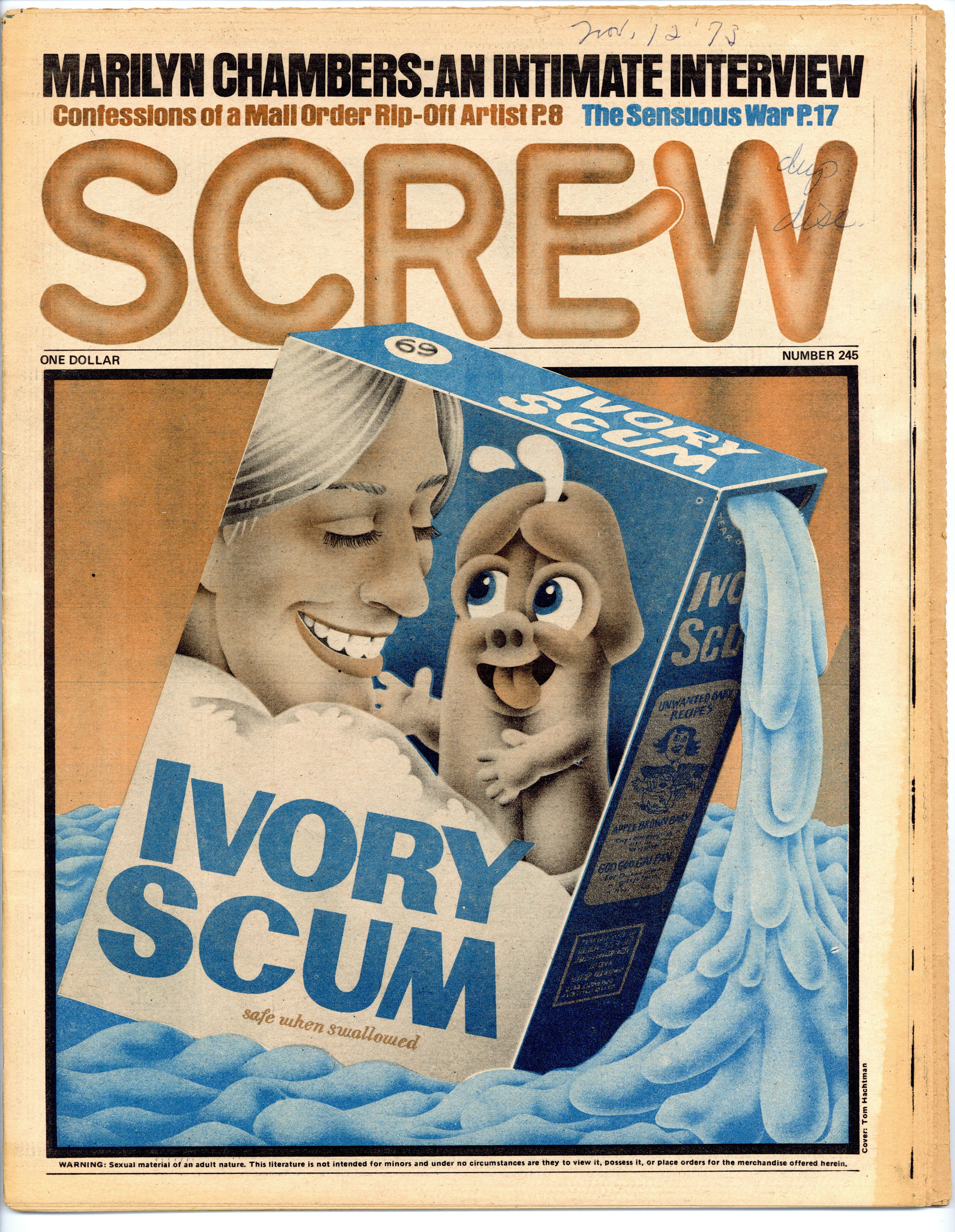 Published Nov 1973 by Milky Way Productions.$8.10Screw was a weekly tabloid newspaper published and edited by Al Goldstein and his Milky Way Productions. This New York based publication was notable for being a pioneer in bringing hardcore pornography into the American mainstream during the late 1960s and early 1970s. Cover by Tom Hachtman. Tabloid format, 11.5" x 14.75", 40 pages, B&W. ADULT MATERIAL Cover price $1.00.