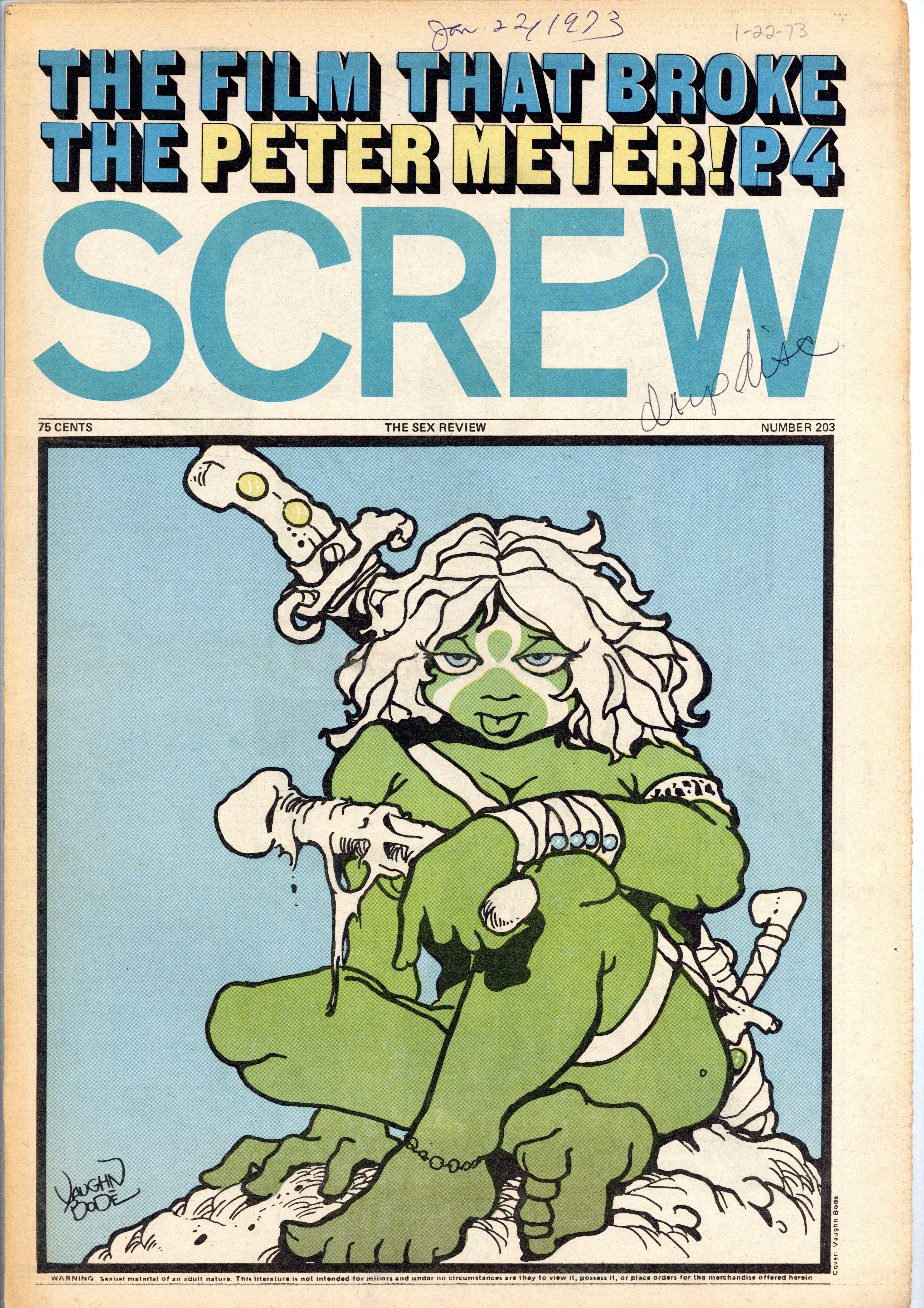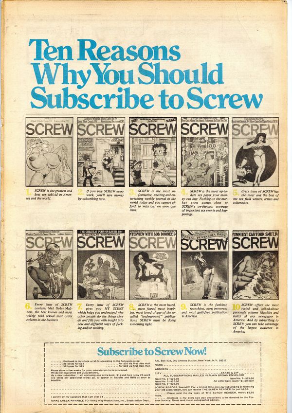 Published Jan 1973 by Milky Way Productions.$54.00Screw was a weekly tabloid newspaper published and edited by Al Goldstein and his Milky Way Productions. This New York based publication was notable for being a pioneer in bringing hardcore pornography into the American mainstream during the late 1960s and early 1970s. Cover by Vaughn Bode. Tabloid format, 11.5" x 16.75", 32 pages, B&W. ADULT MATERIAL Cover price $0.75.