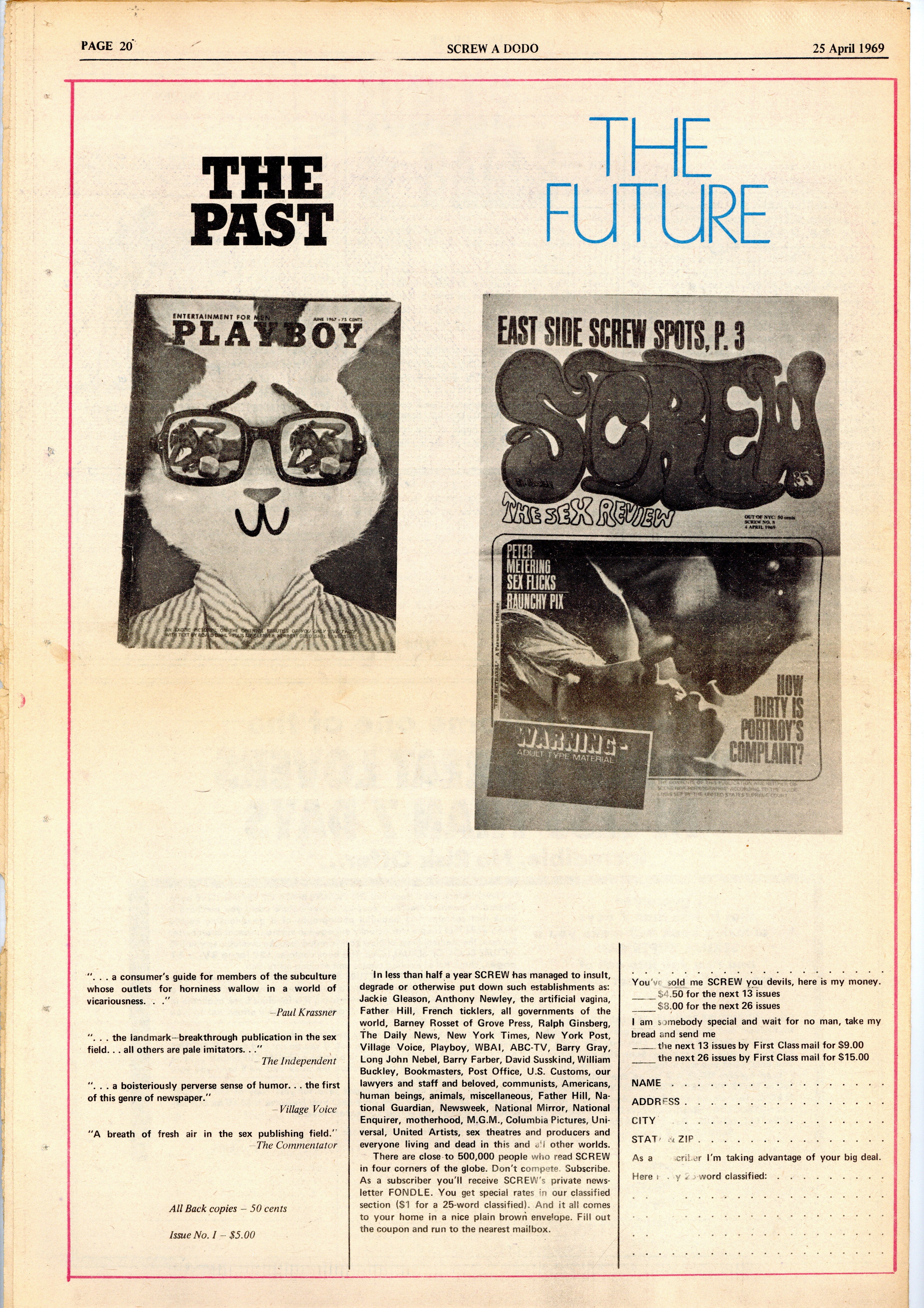 Published Apr 1969 by Milky Way Productions.$12.25Screw was a weekly tabloid newspaper published and edited by Al Goldstein and his Milky Way Productions. This New York based publication was notable for being a pioneer in bringing hardcore pornography into the American mainstream during the late 1960s and early 1970s. Tabloid format, 11.5" x 16.75", 20 pages, B&W. ADULT MATERIAL Cover price $0.35.