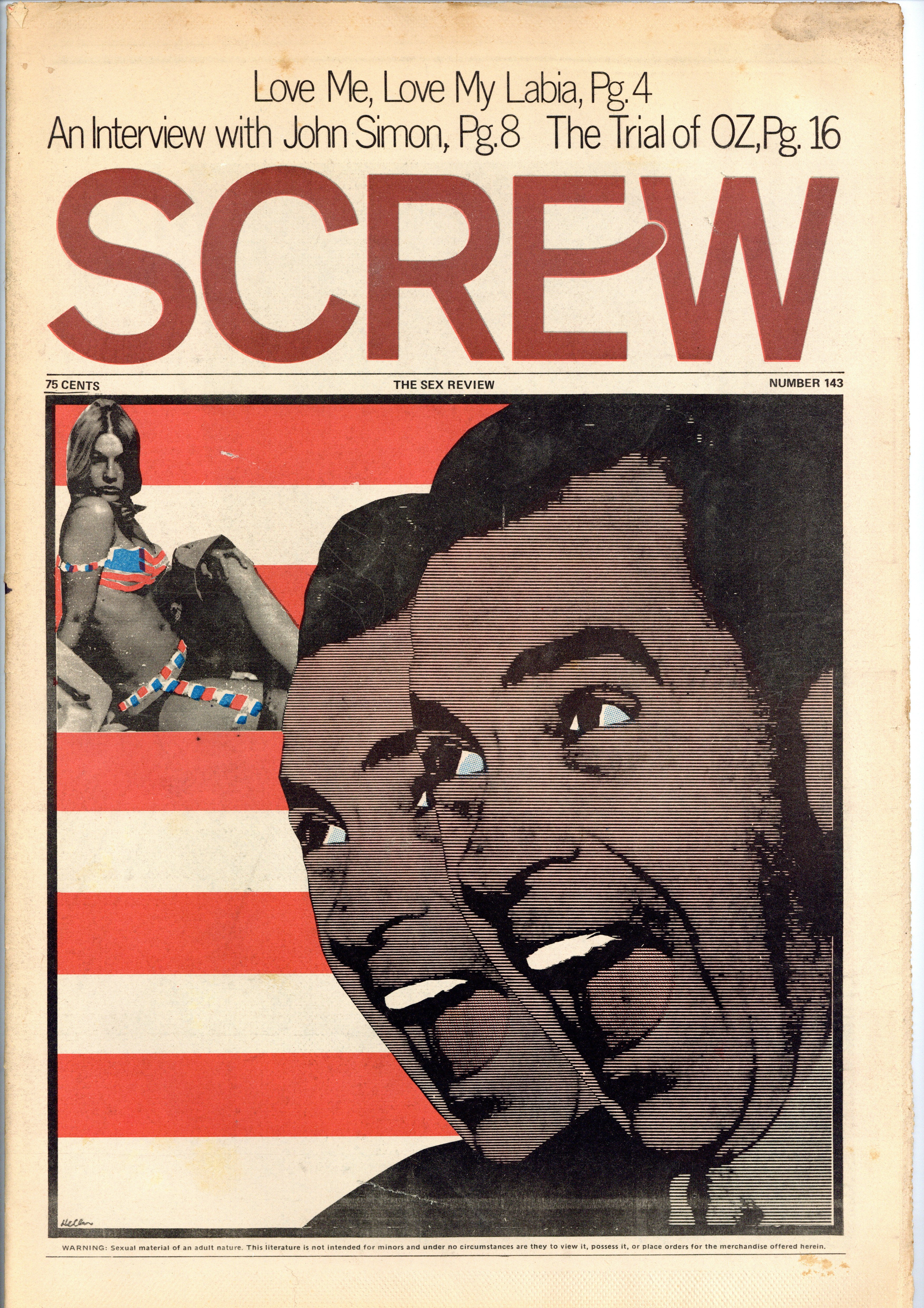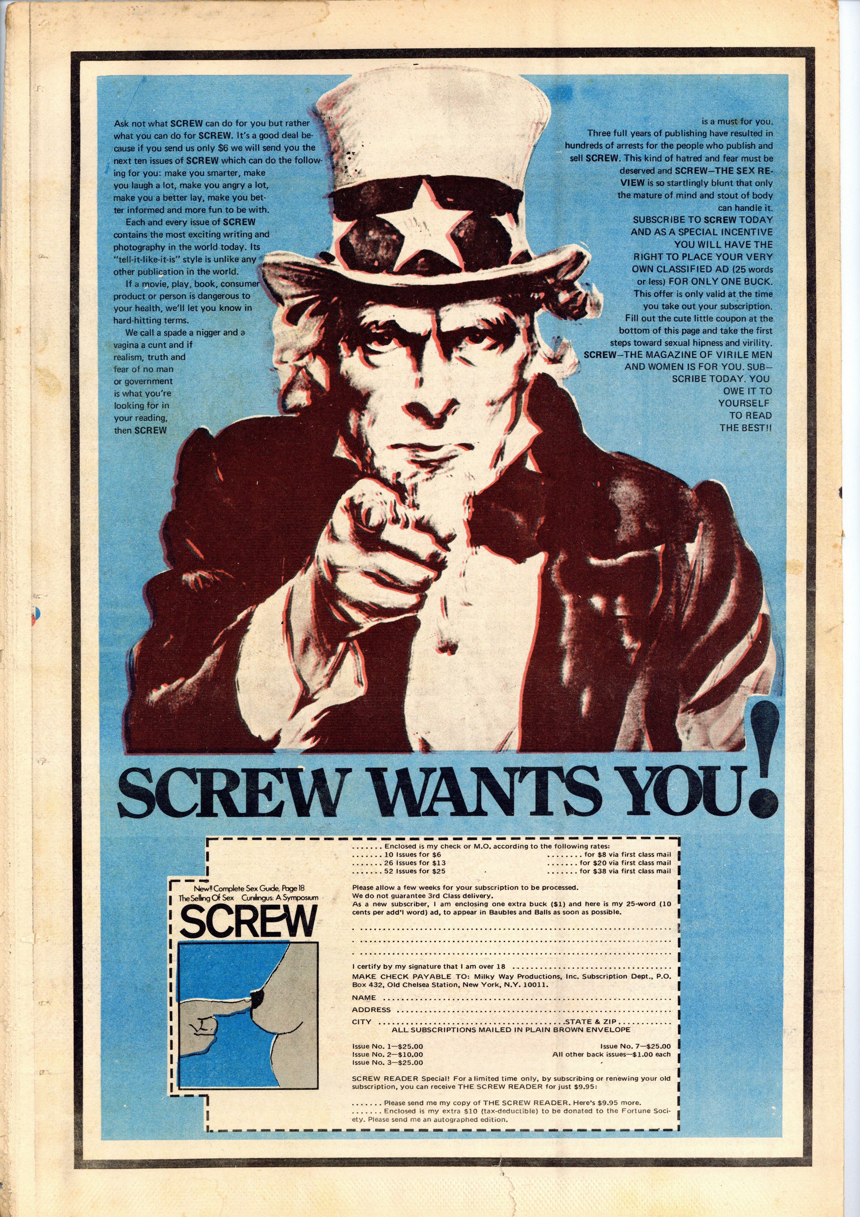 Screw was a weekly tabloid newspaper published and edited by Al Goldstein and his Milky Way Productions. This New York based publication was notable for being a pioneer in bringing hardcore pornography into the American mainstream during the late 1960s and early 1970s. Tabloid format, 11.5" x 16.75", 36 pages, B&W. ADULT MATERIAL Cover price $0.75.