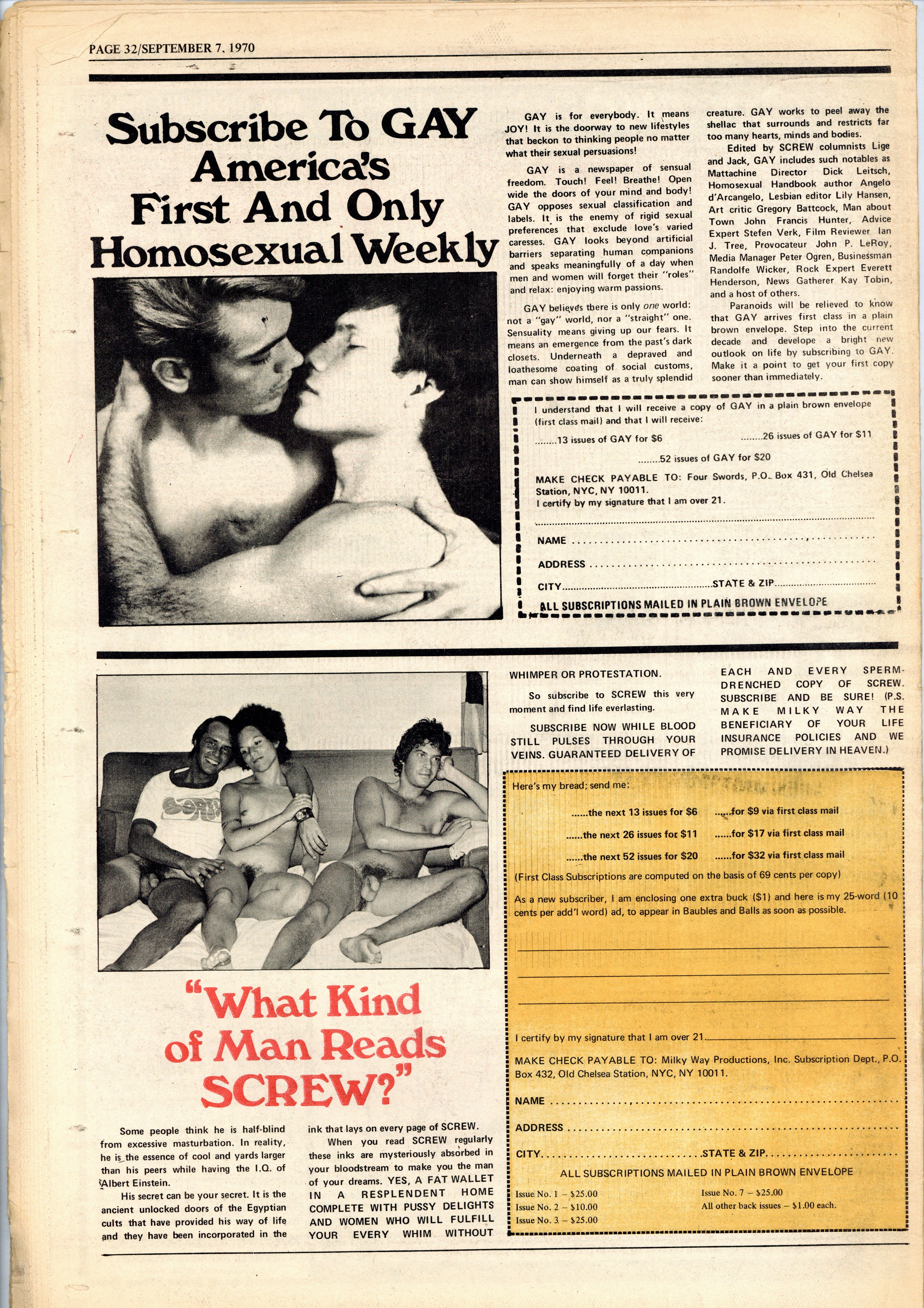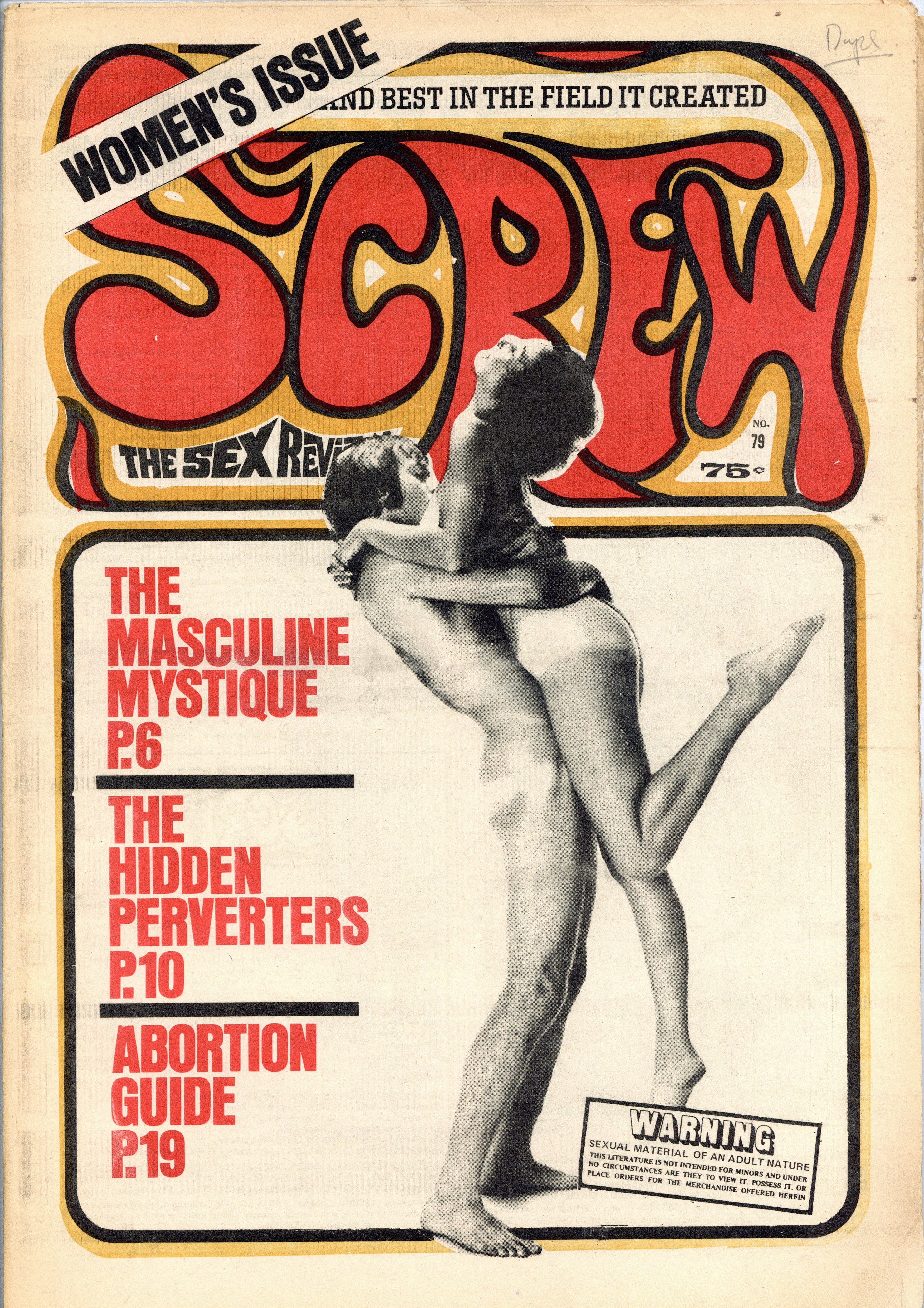 Published Sep 1970 by Milky Way Productions.$12.00Screw was a weekly tabloid newspaper published and edited by Al Goldstein and his Milky Way Productions. This New York based publication was notable for being a pioneer in bringing hardcore pornography into the American mainstream during the late 1960s and early 1970s. Tabloid format, 11.5" x 16.75", 32 pages, B&W. ADULT MATERIAL Cover price $0.75.