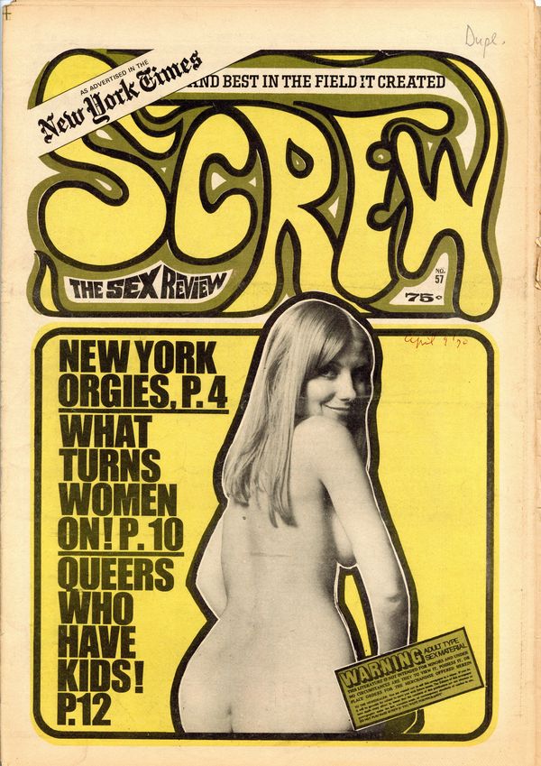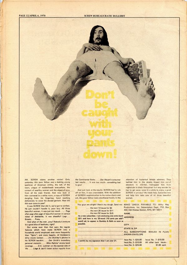 Published Apr 1970 by Milky Way Productions.$7.30Screw was a weekly tabloid newspaper published and edited by Al Goldstein and his Milky Way Productions. This New York based publication was notable for being a pioneer in bringing hardcore pornography into the American mainstream during the late 1960s and early 1970s. Tabloid format, 11.5" x 16.75", 32 pages, B&W. ADULT MATERIAL Cover price $0.75.