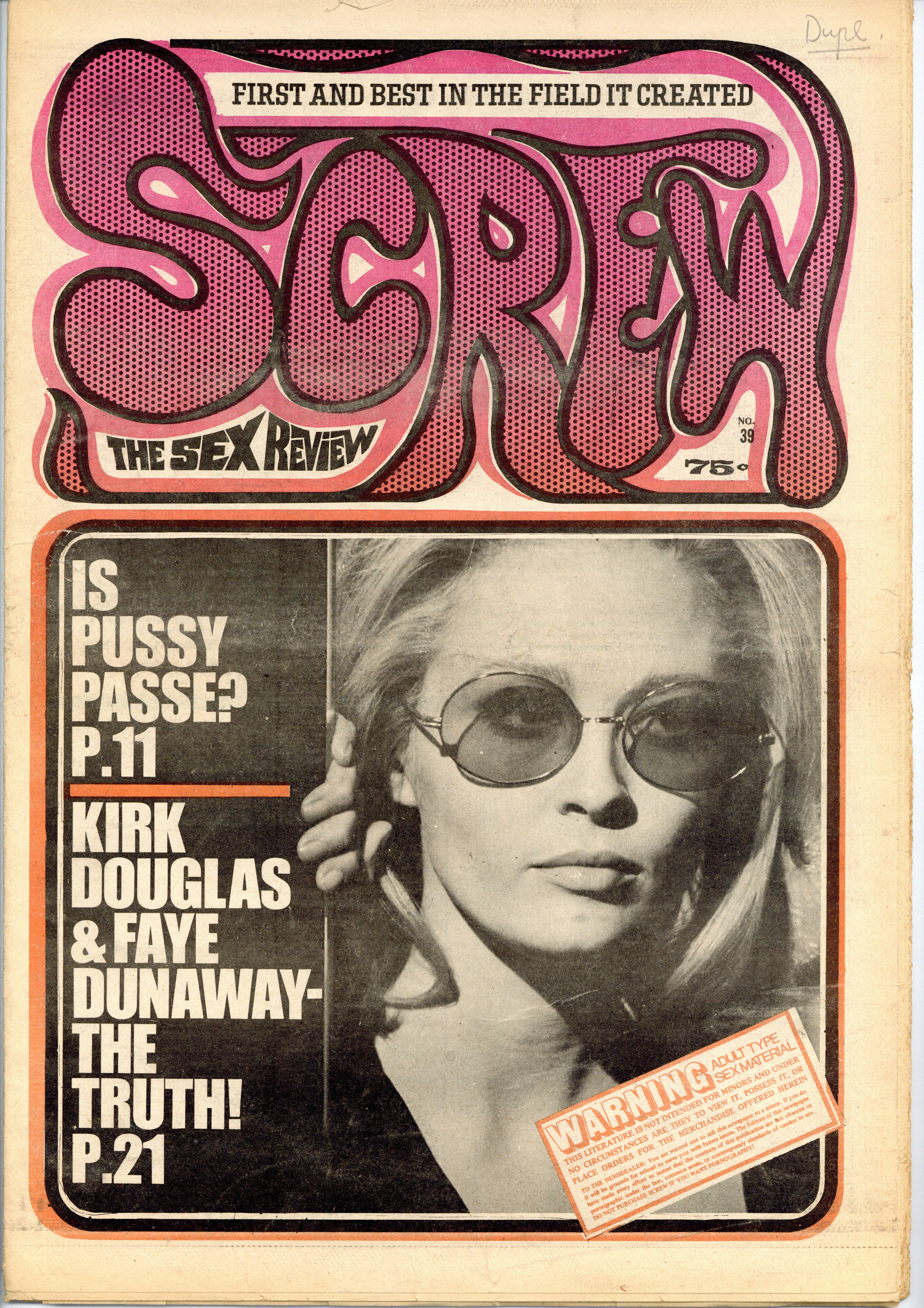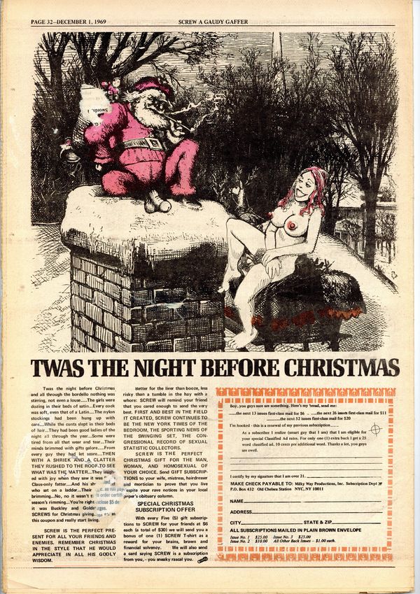 Published Dec 1969 by Milky Way Productions.$9.60Screw was a weekly tabloid newspaper published and edited by Al Goldstein and his Milky Way Productions. This New York based publication was notable for being a pioneer in bringing hardcore pornography into the American mainstream during the late 1960s and early 1970s. Tabloid format, 11.5" x 16.75", 32 pages, B&W. ADULT MATERIAL Cover price $0.75.
