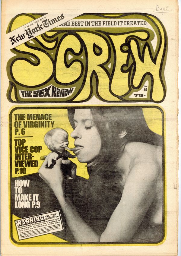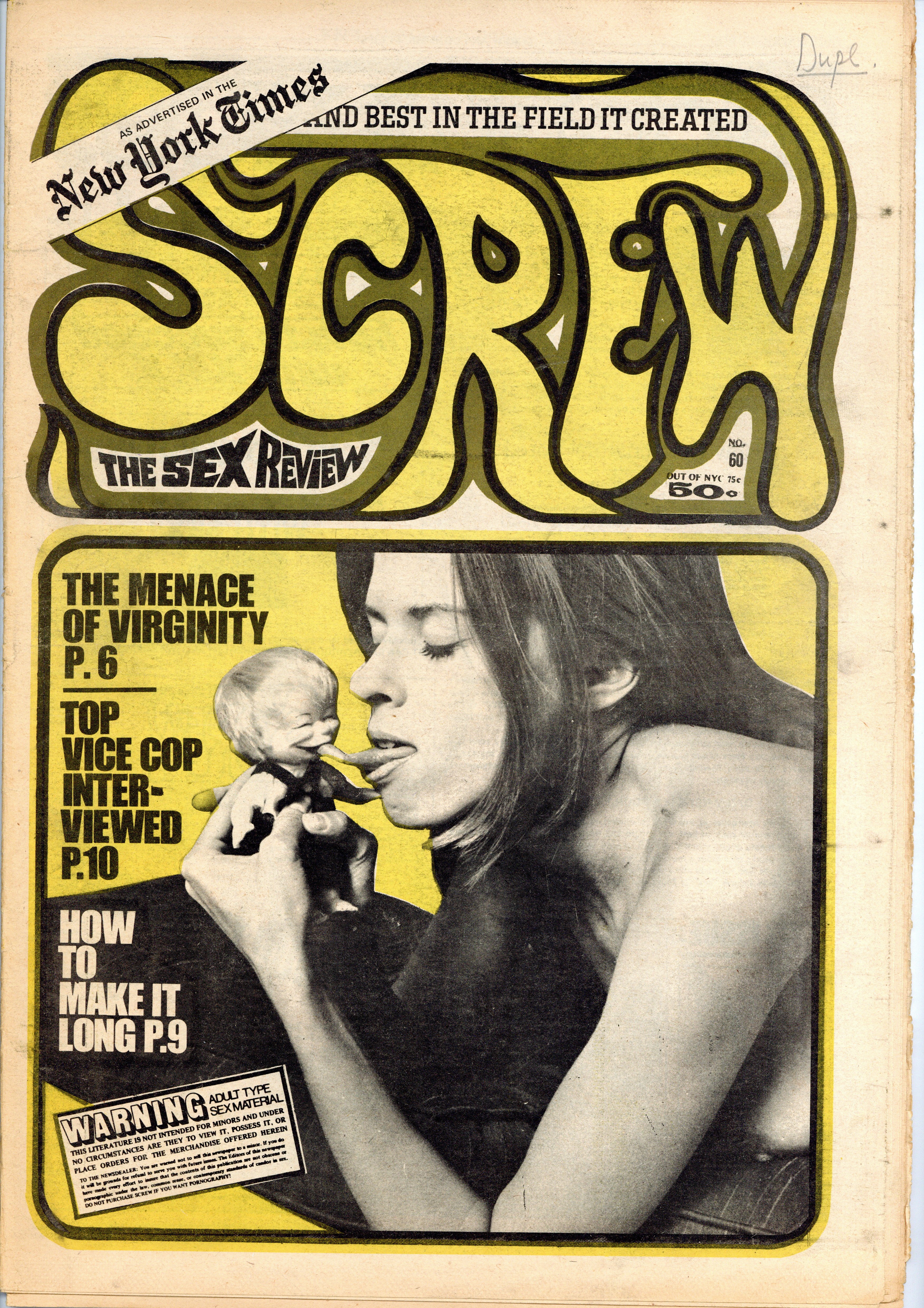 Published Apr 1970 by Milky Way Productions.$7.30Screw was a weekly tabloid newspaper published and edited by Al Goldstein and his Milky Way Productions. This New York based publication was notable for being a pioneer in bringing hardcore pornography into the American mainstream during the late 1960s and early 1970s. Tabloid format, 11.5" x 16.75", 32 pages, B&W. ADULT MATERIAL Cover price $0.50.