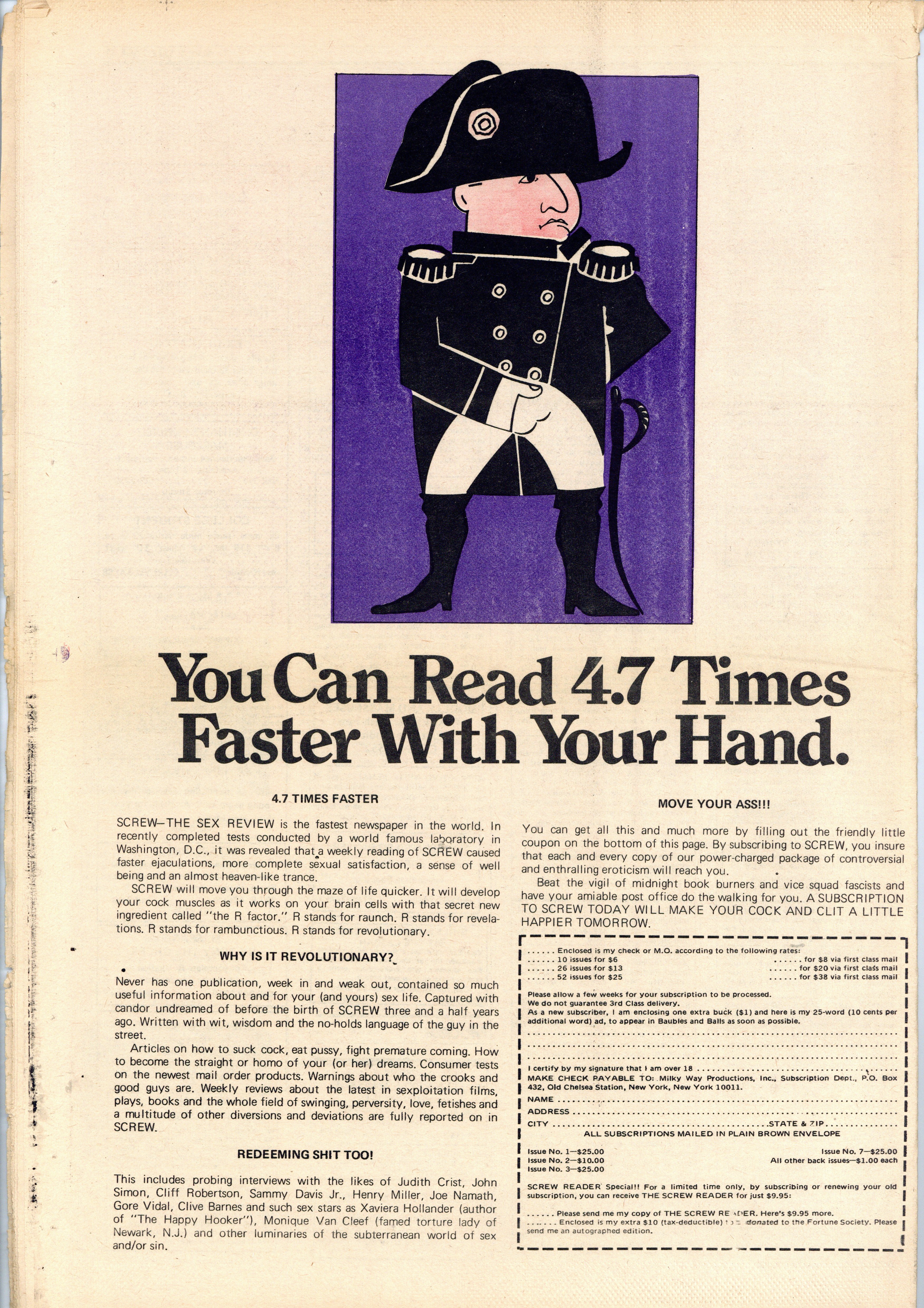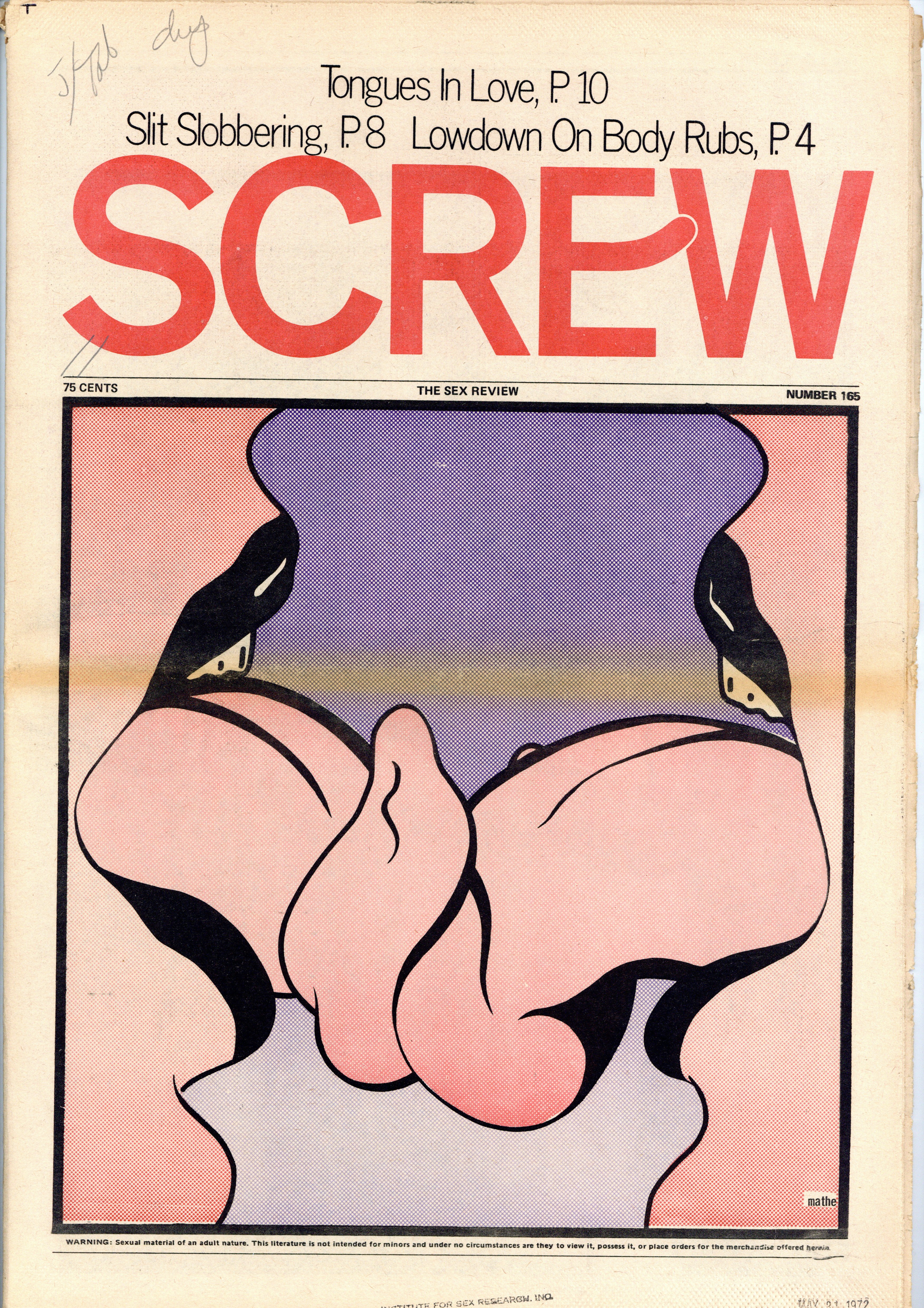 Published May 1972 by Milky Way Productions.$4.20Screw was a weekly tabloid newspaper published and edited by Al Goldstein and his Milky Way Productions. This New York based publication was notable for being a pioneer in bringing hardcore pornography into the American mainstream during the late 1960s and early 1970s. Cover by Mathe. Tabloid format, 11.5" x 16.75", 32 pages, B&W. ADULT MATERIAL Cover price $0.50.