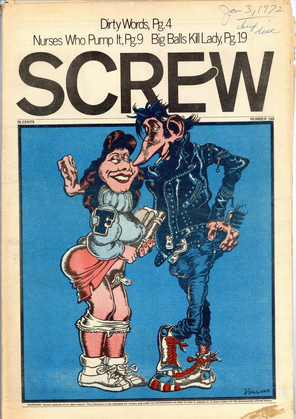 Published Jan 1972 by Milky Way Productions.$2.65Screw was a weekly tabloid newspaper published and edited by Al Goldstein and his Milky Way Productions. This New York based publication was notable for being a pioneer in bringing hardcore pornography into the American mainstream during the late 1960s and early 1970s. Cover by Holland. Tabloid format, 11.5" x 16.75", 36 pages, B&W. ADULT MATERIAL Cover price $0.75.