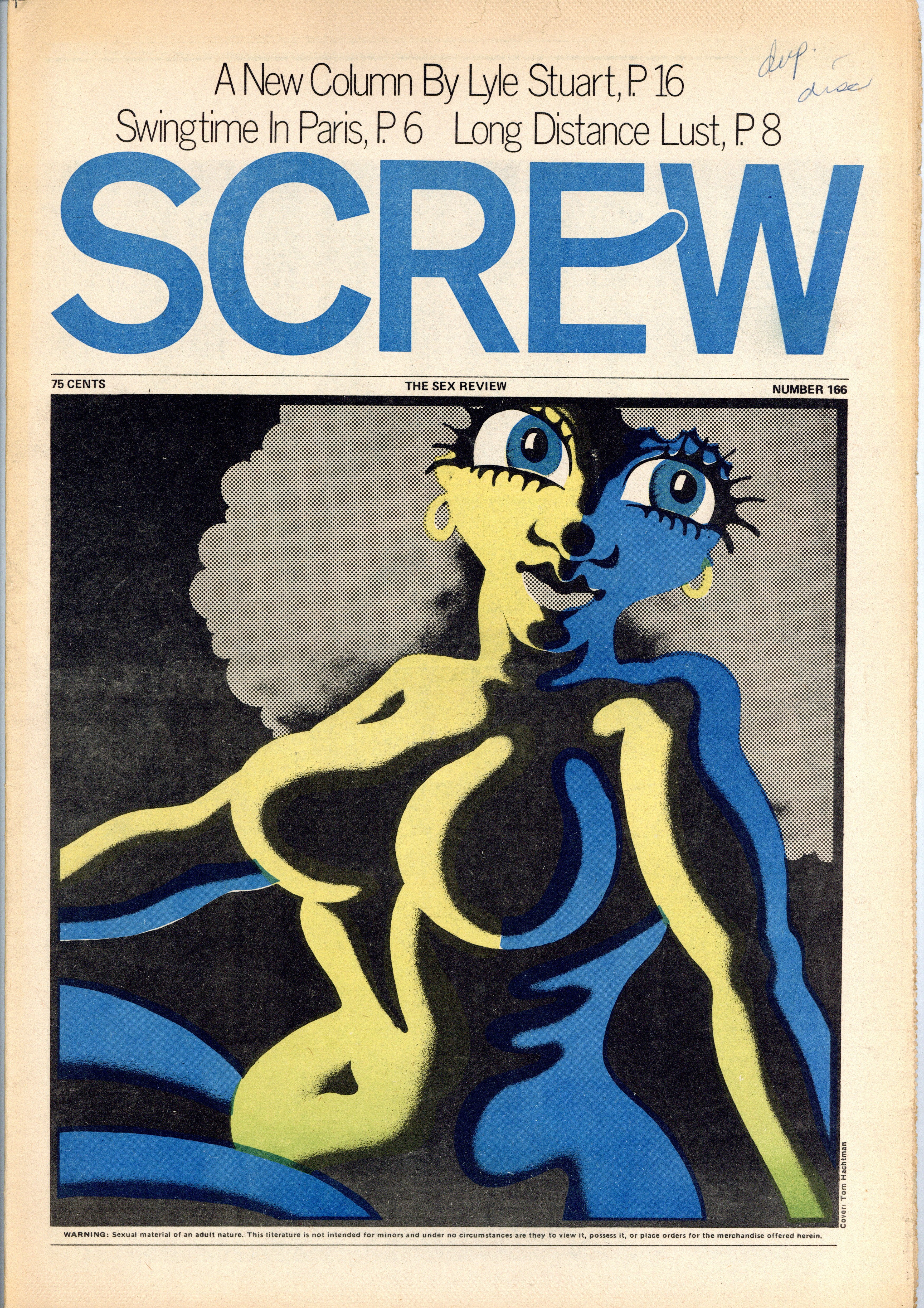 Published May 1972 by Milky Way Productions.$9.90Screw was a weekly tabloid newspaper published and edited by Al Goldstein and his Milky Way Productions. This New York based publication was notable for being a pioneer in bringing hardcore pornography into the American mainstream during the late 1960s and early 1970s. Cover by Tom Hachtman. Tabloid format, 11.5" x 16.75", 36 pages, B&W. ADULT MATERIAL Cover price $0.75.
