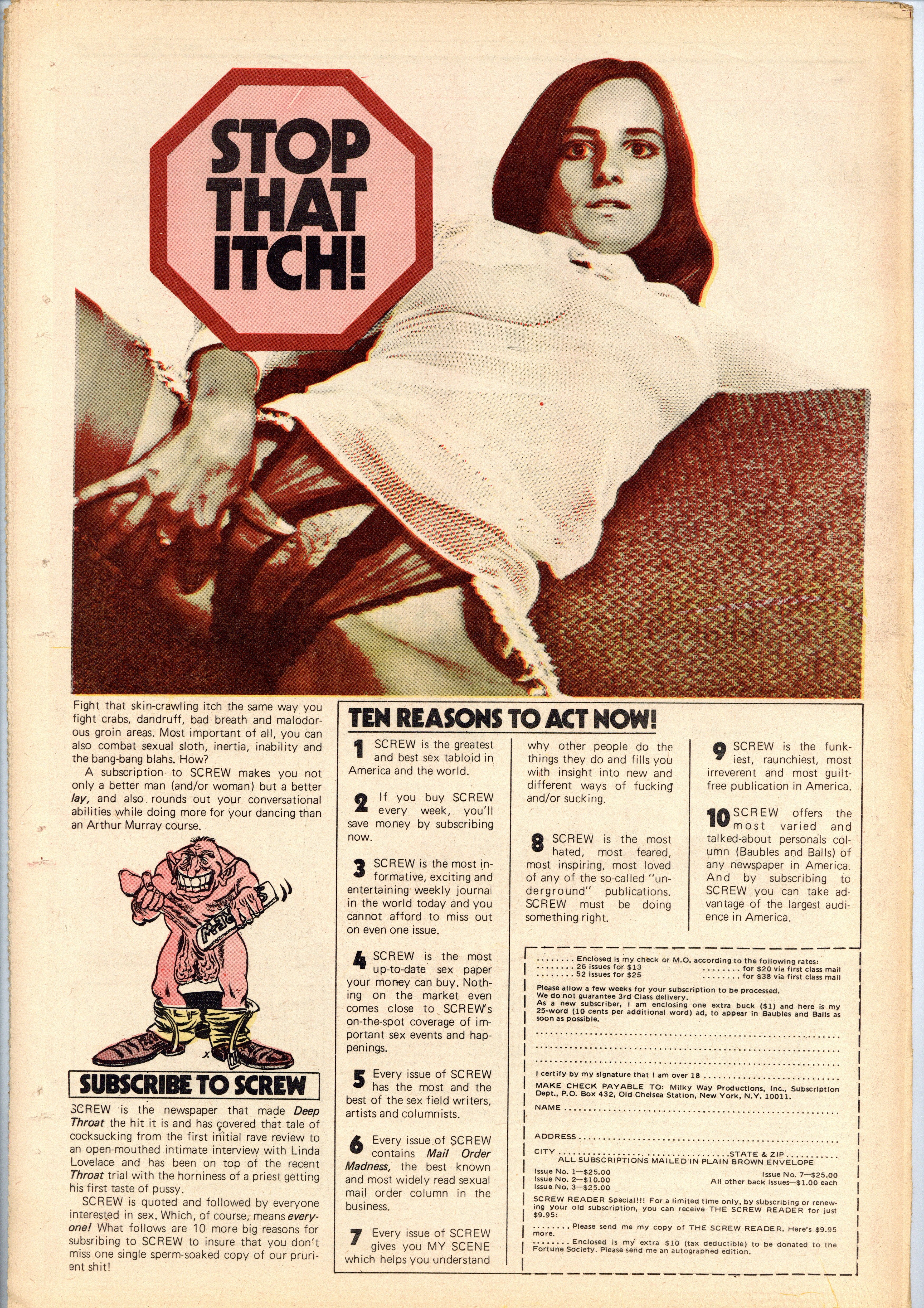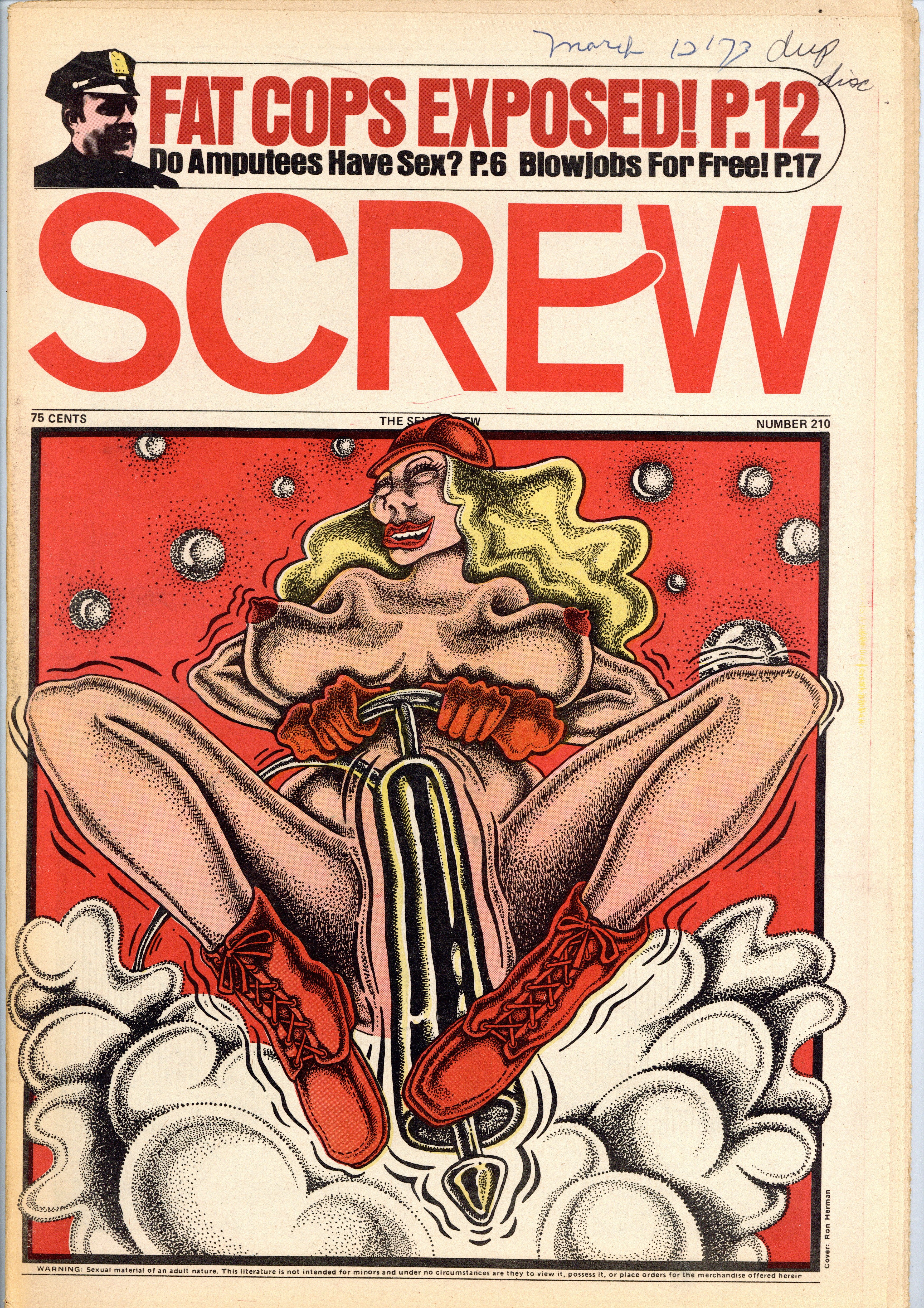 Published Mar 1973 by Milky Way Productions.$8.10Screw was a weekly tabloid newspaper published and edited by Al Goldstein and his Milky Way Productions. This New York based publication was notable for being a pioneer in bringing hardcore pornography into the American mainstream during the late 1960s and early 1970s. Cover by Ron Herman. Tabloid format, 11.5" x 16.75", 40 pages, B&W. ADULT MATERIAL Cover price $0.75.