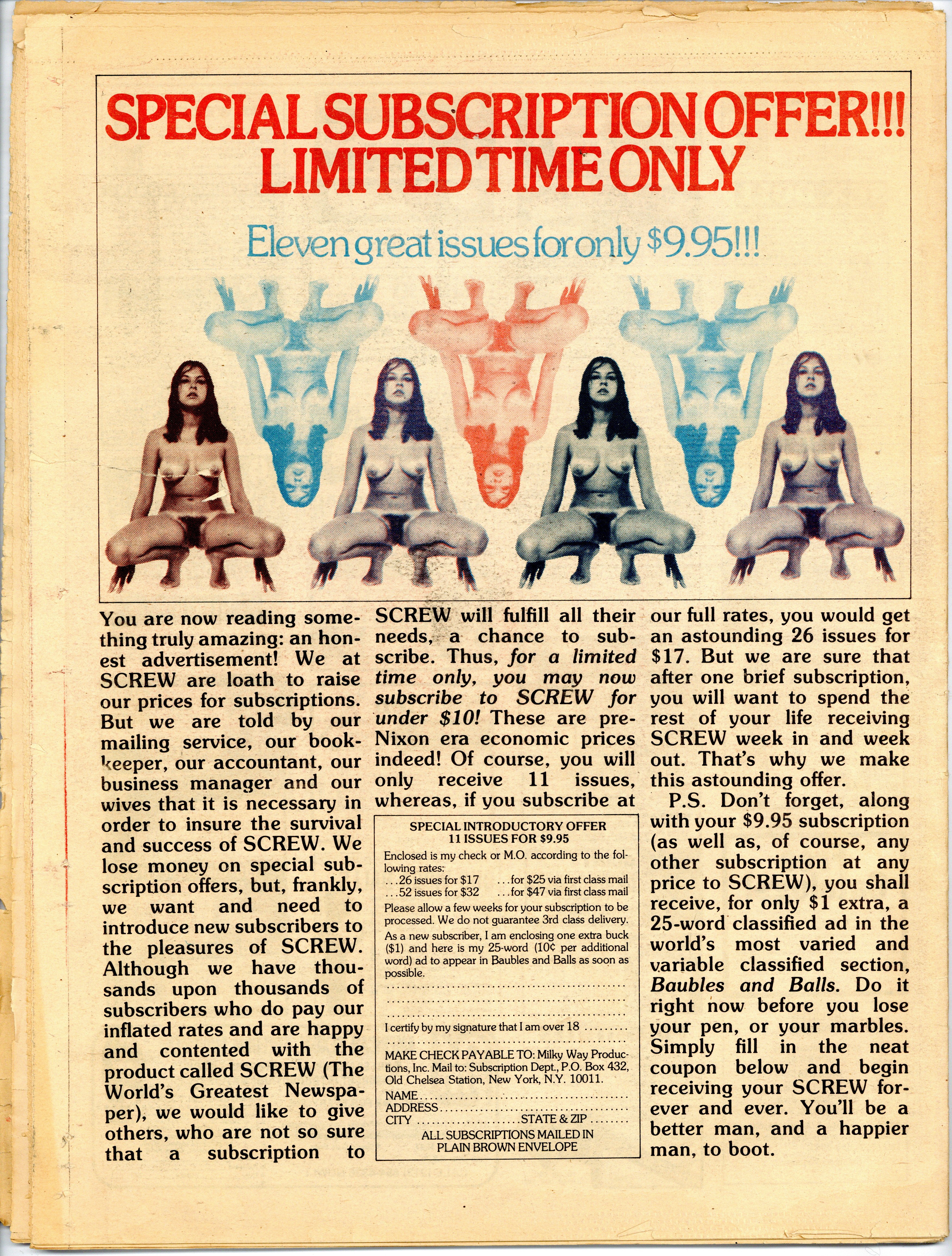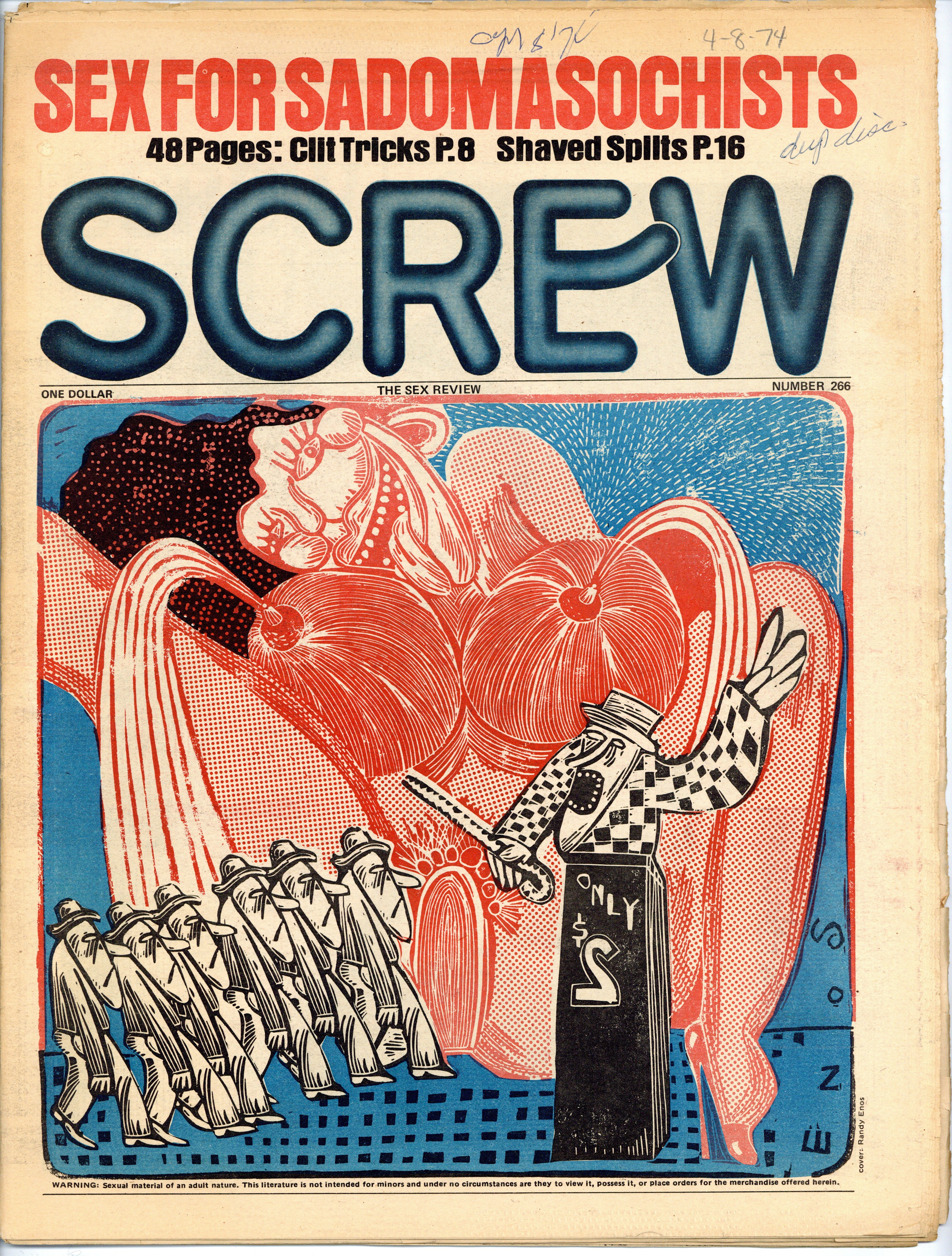 Published Apr 1974 by Milky Way Productions.$4.20Screw was a weekly tabloid newspaper published and edited by Al Goldstein and his Milky Way Productions. This New York based publication was notable for being a pioneer in bringing hardcore pornography into the American mainstream during the late 1960s and early 1970s. Cover by Randy Enos. Tabloid format, 11.5" x 14.75", 48 pages, B&W. ADULT MATERIAL Cover price $1.00.