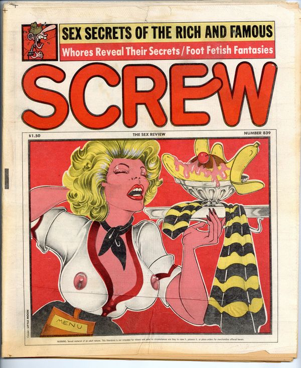 Published Apr 1985 by Milky Way Productions.$6.00Screw was a weekly tabloid newspaper published and edited by Al Goldstein and his Milky Way Productions. This New York based publication was notable for being a pioneer in bringing hardcore pornography into the American mainstream during the late 1960s and early 1970s. Cover by Little Moon. Tabloid format, 11.5" x 14.75", 56 pages, B&W. ADULT MATERIAL Cover price $1.50.