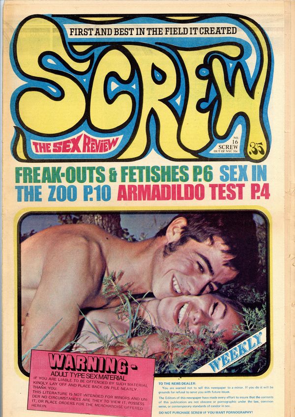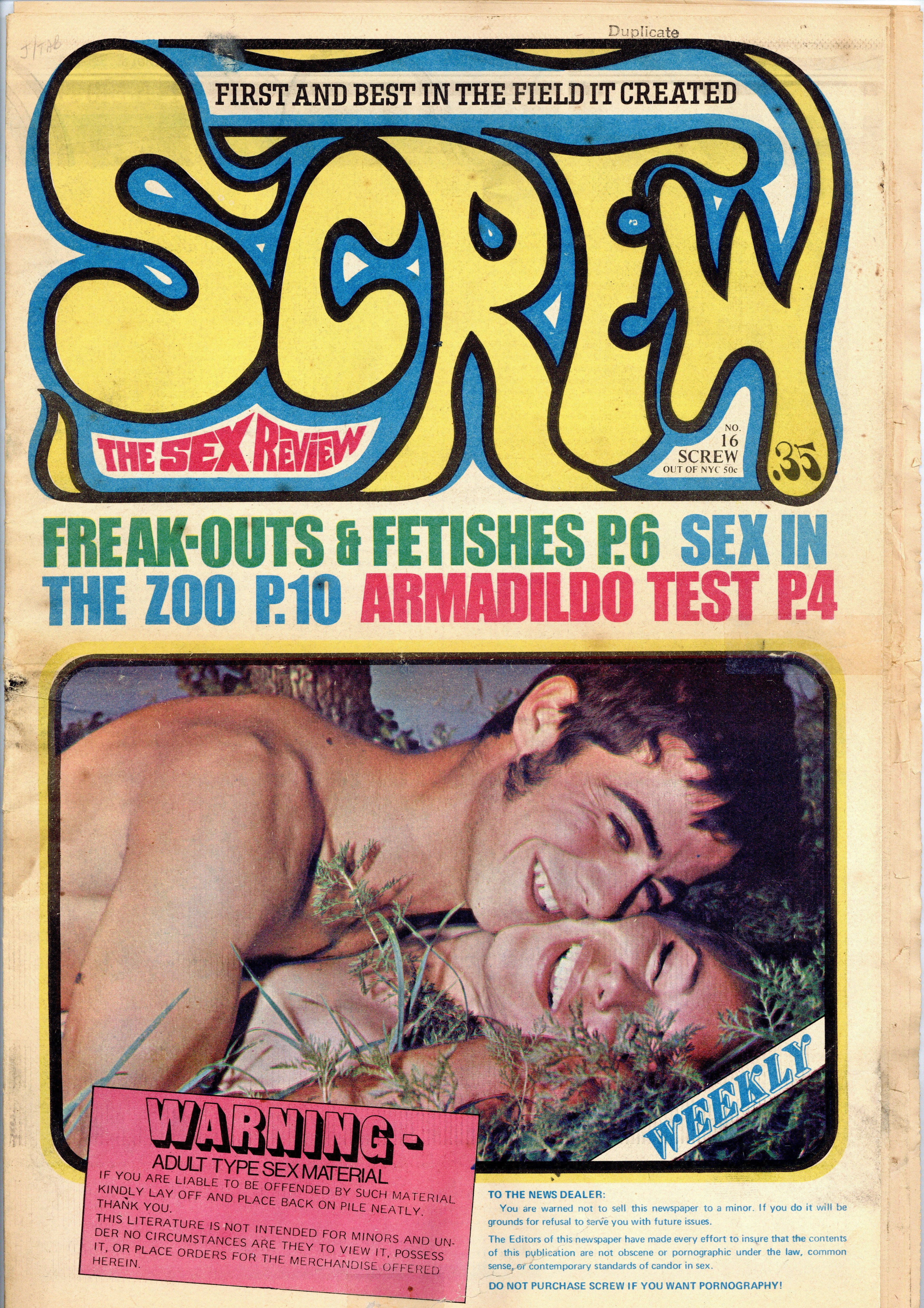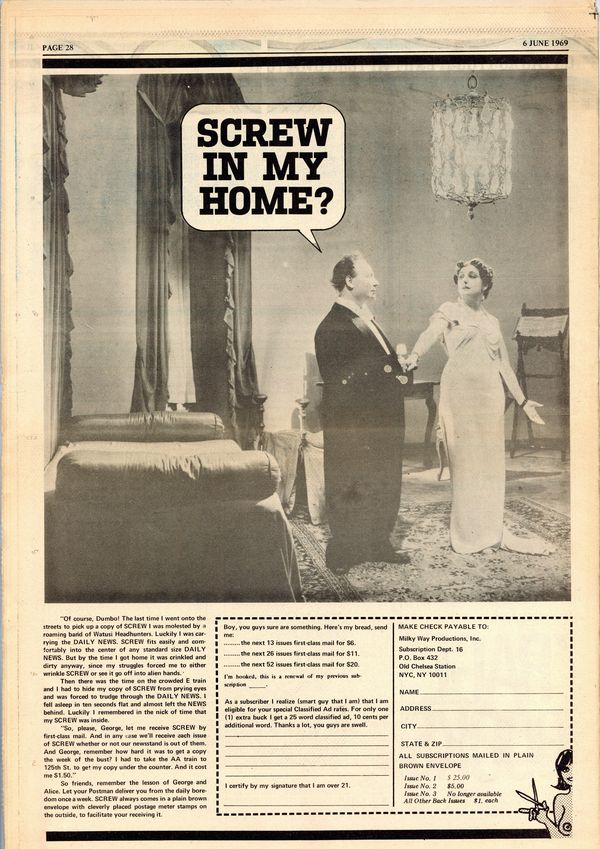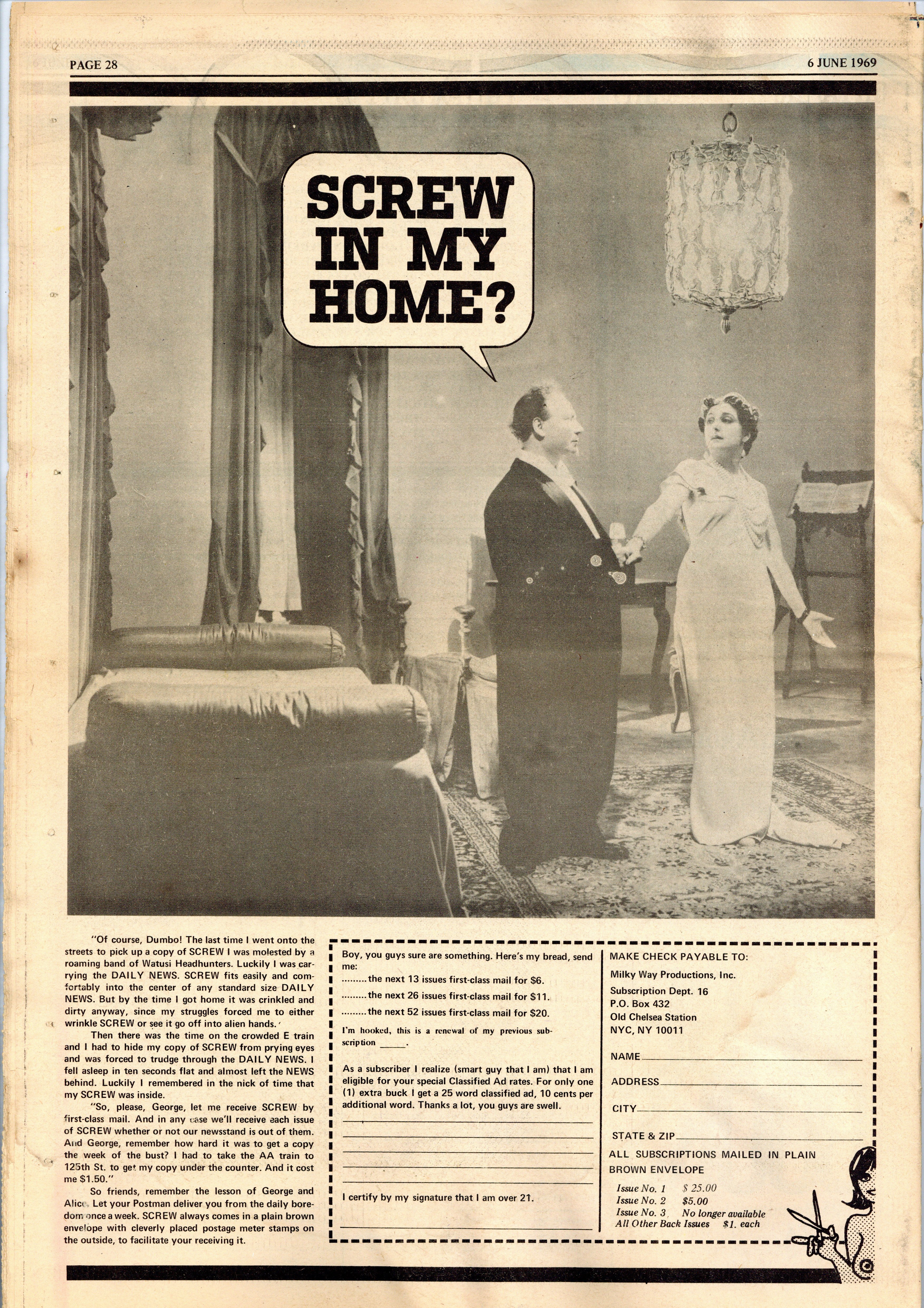 Published Jun 1969 by Milky Way Productions.$12.75Screw was a weekly tabloid newspaper published and edited by Al Goldstein and his Milky Way Productions. This New York based publication was notable for being a pioneer in bringing hardcore pornography into the American mainstream during the late 1960s and early 1970s. Tabloid format, 11.5" x 16.75", 28 pages, B&W. ADULT MATERIAL Cover price $0.35.