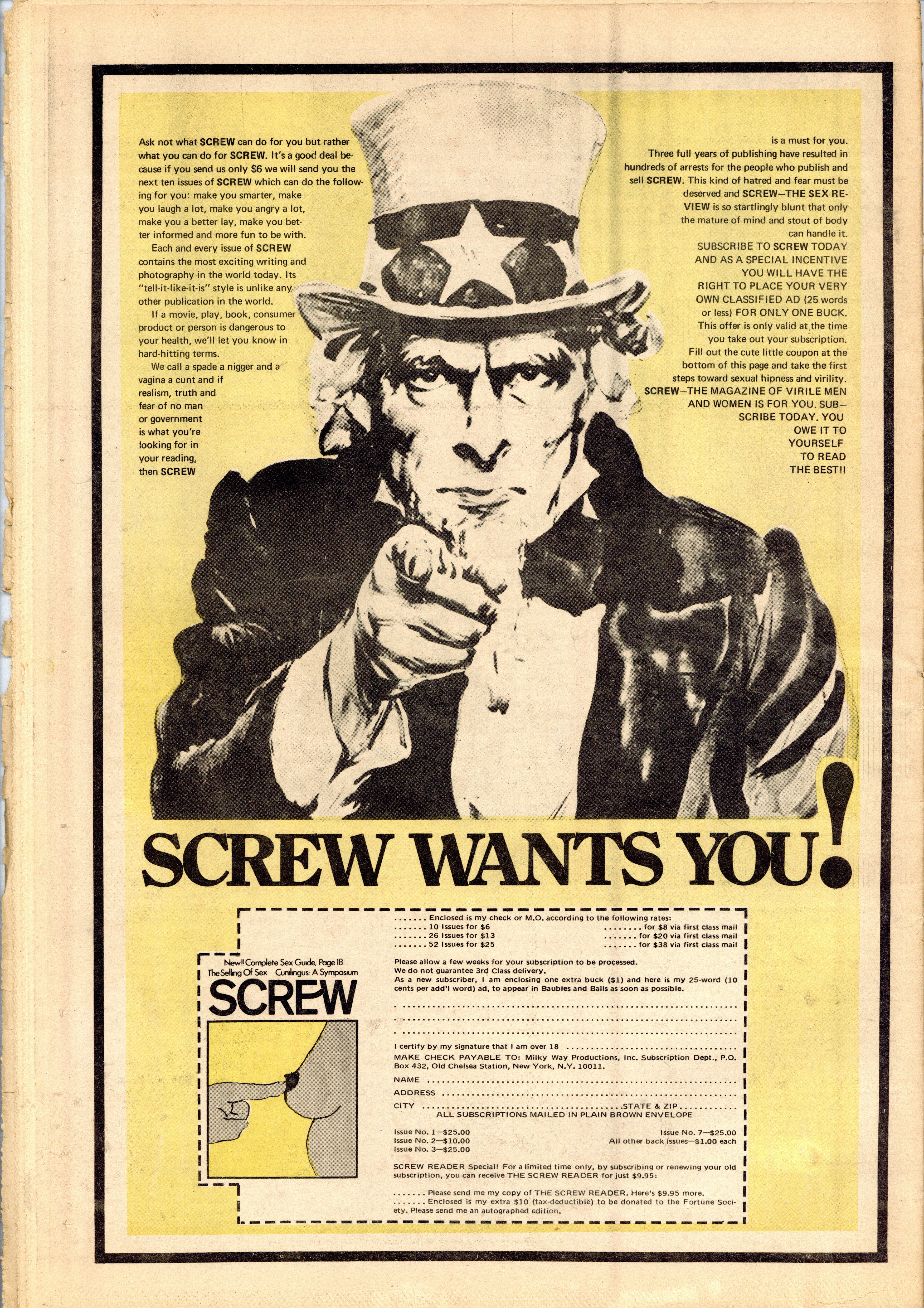 Published Nov 1971 by Milky Way Productions.$7.20Screw was a weekly tabloid newspaper published and edited by Al Goldstein and his Milky Way Productions. This New York based publication was notable for being a pioneer in bringing hardcore pornography into the American mainstream during the late 1960s and early 1970s. Tabloid format, 11.5" x 16.75", 40 pages, B&W. ADULT MATERIAL Cover price $0.75.