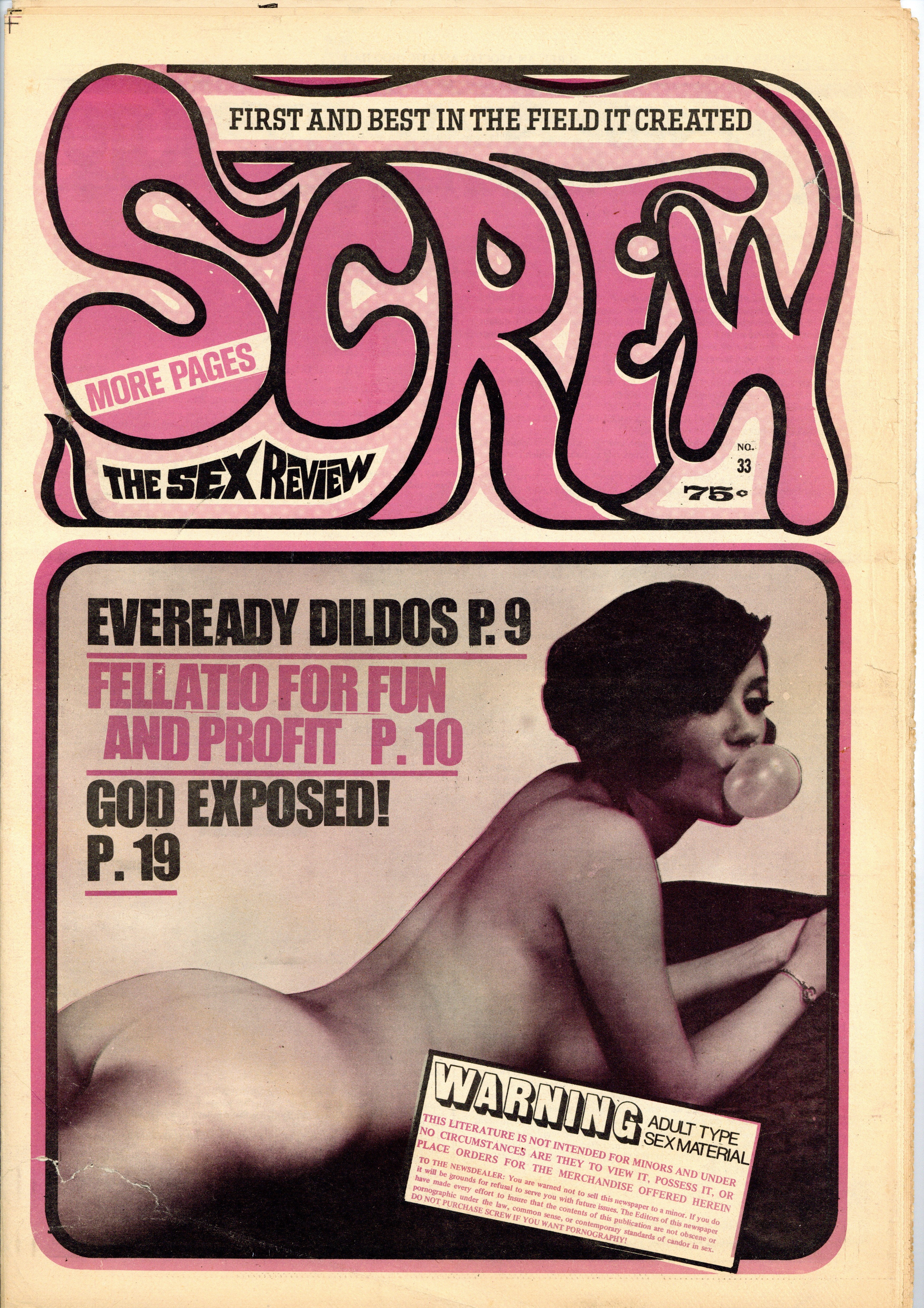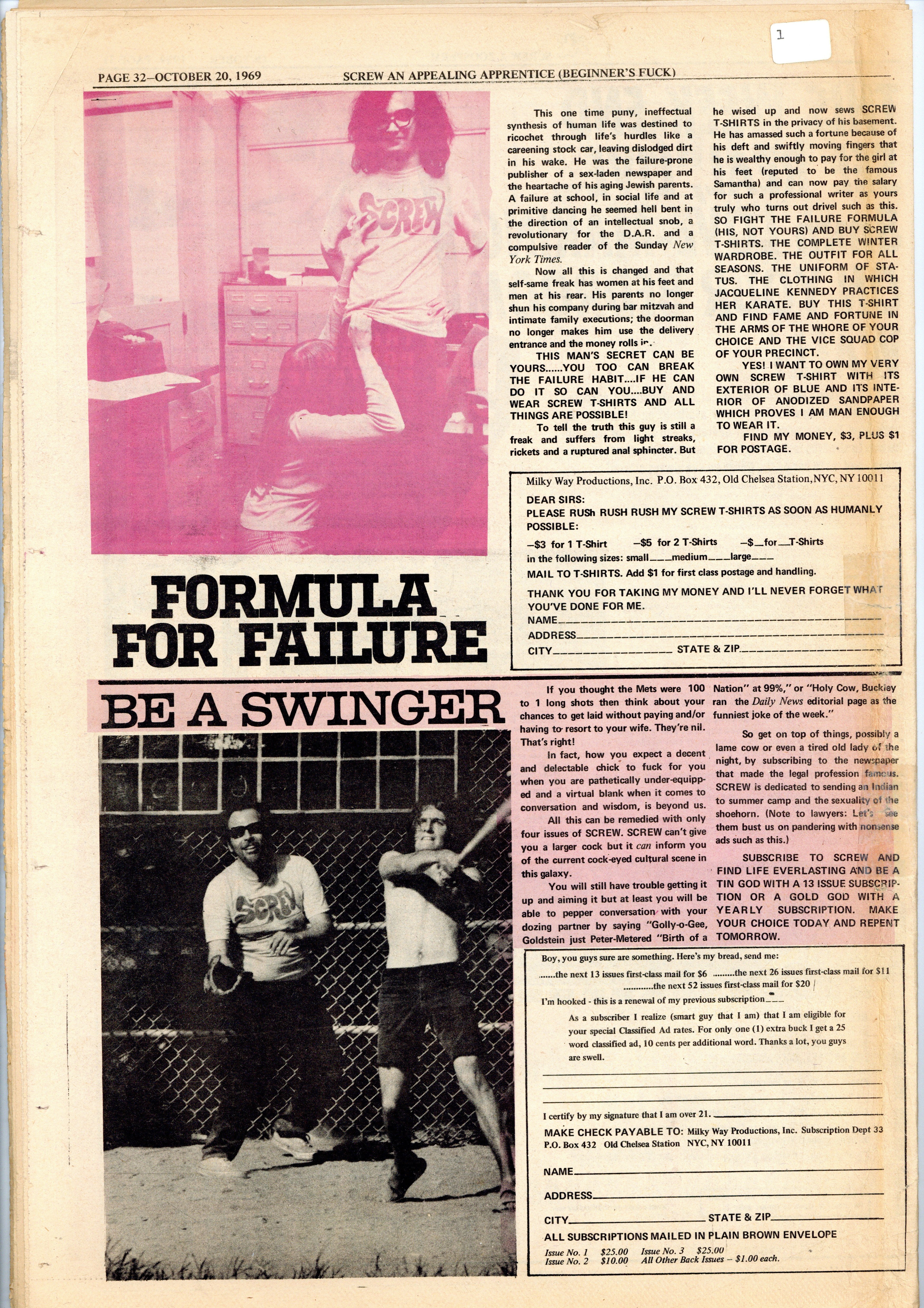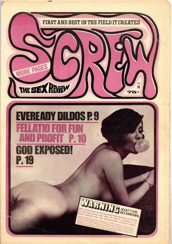 Published Oct 1969 by Milky Way Productions.$4.20Screw was a weekly tabloid newspaper published and edited by Al Goldstein and his Milky Way Productions. This New York based publication was notable for being a pioneer in bringing hardcore pornography into the American mainstream during the late 1960s and early 1970s. Tabloid format, 11.5" x 16.75", 32 pages, B&W. ADULT MATERIAL Cover price $0.50.