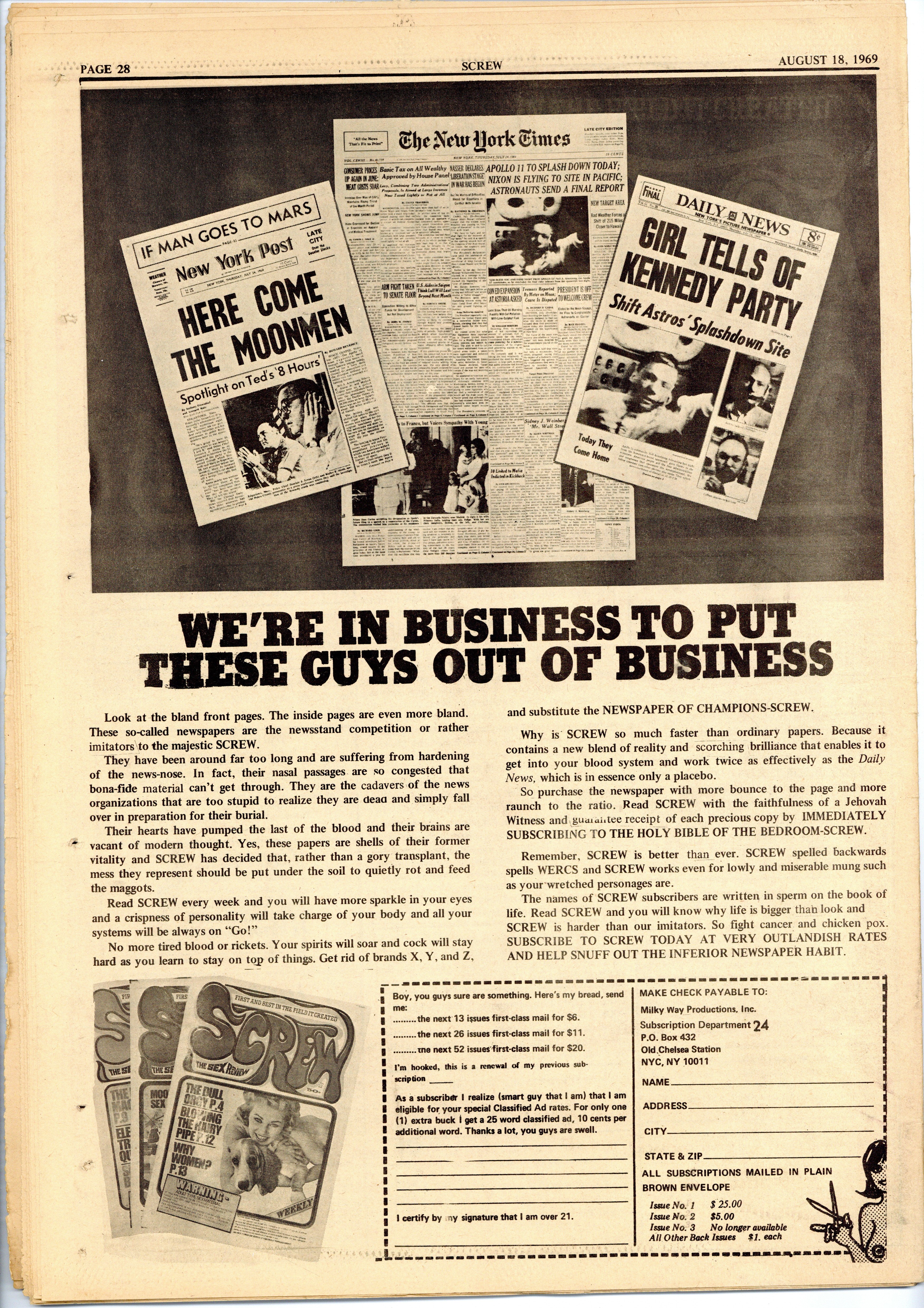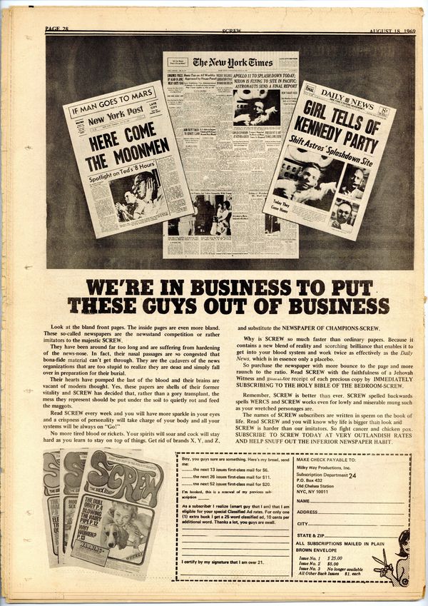 Published Aug 1969 by Milky Way Productions.$7.30Screw was a weekly tabloid newspaper published and edited by Al Goldstein and his Milky Way Productions. This New York based publication was notable for being a pioneer in bringing hardcore pornography into the American mainstream during the late 1960s and early 1970s. Tabloid format, 11.5" x 16.75", 28 pages, B&W. ADULT MATERIAL Cover price $0.50.
