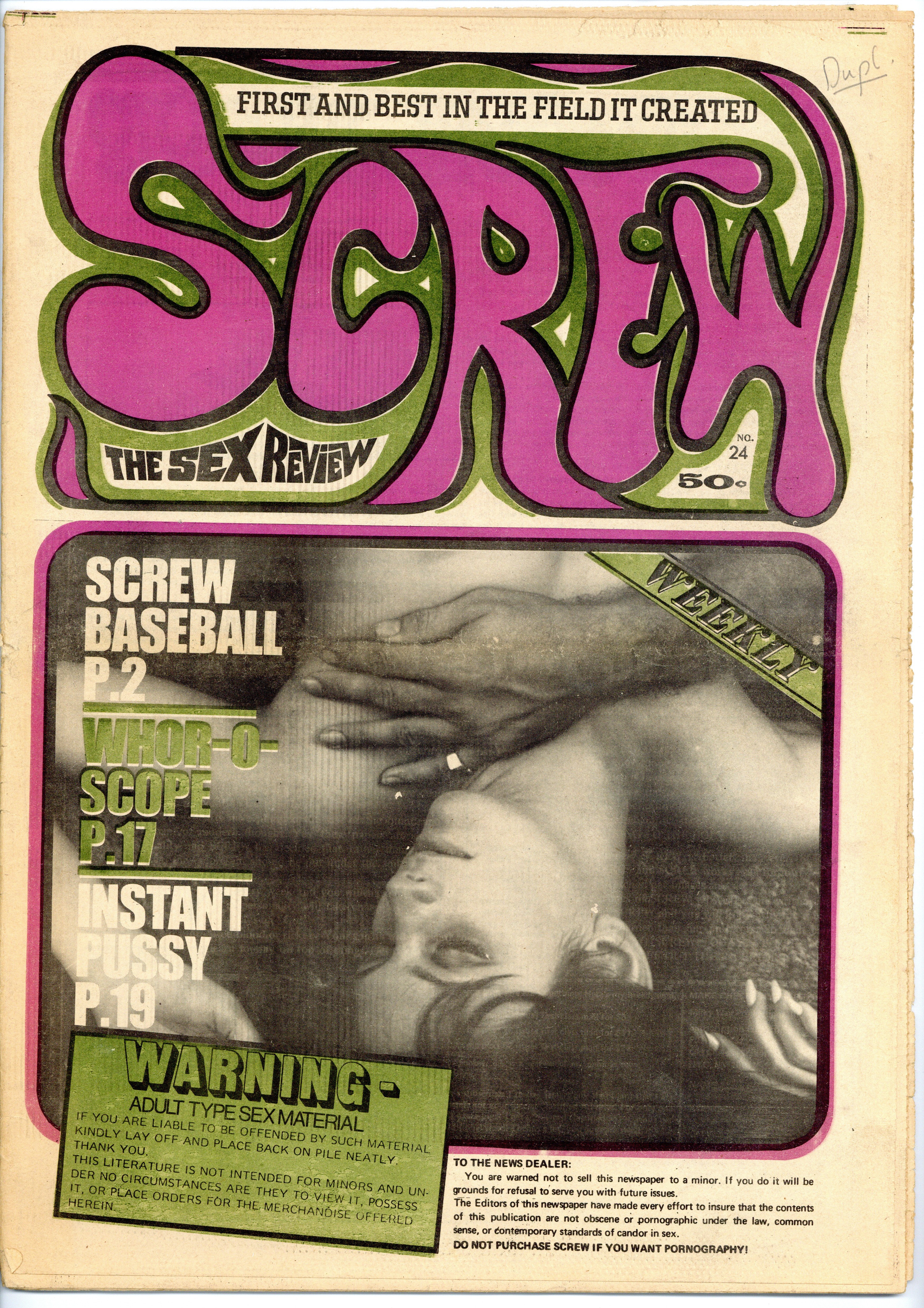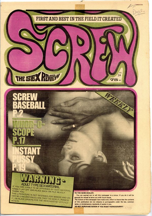 Published Aug 1969 by Milky Way Productions.$4.20Screw was a weekly tabloid newspaper published and edited by Al Goldstein and his Milky Way Productions. This New York based publication was notable for being a pioneer in bringing hardcore pornography into the American mainstream during the late 1960s and early 1970s. Tabloid format, 11.5" x 16.75", 28 pages, B&W. ADULT MATERIAL Cover price $0.50.