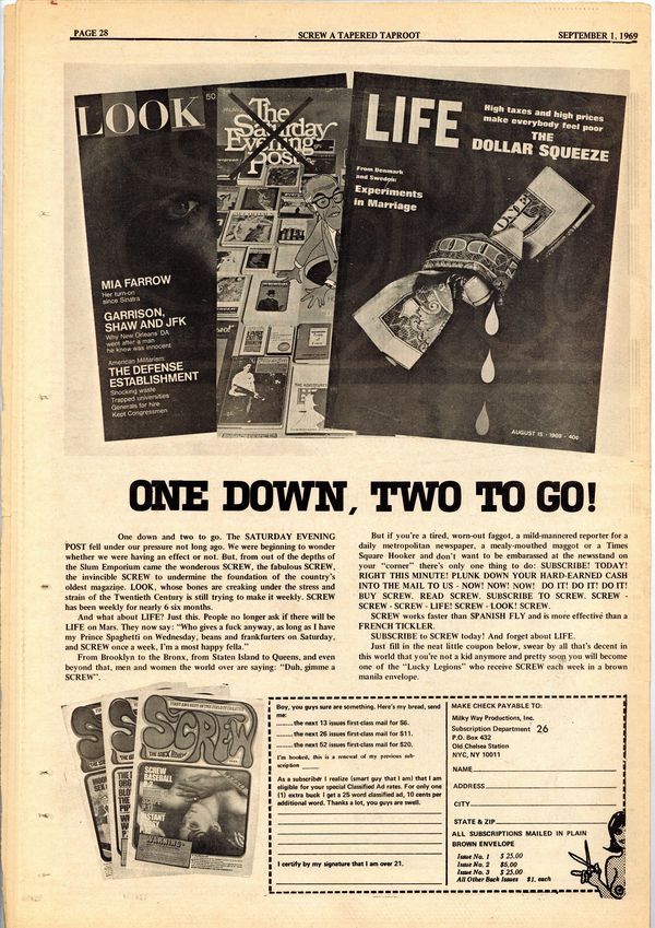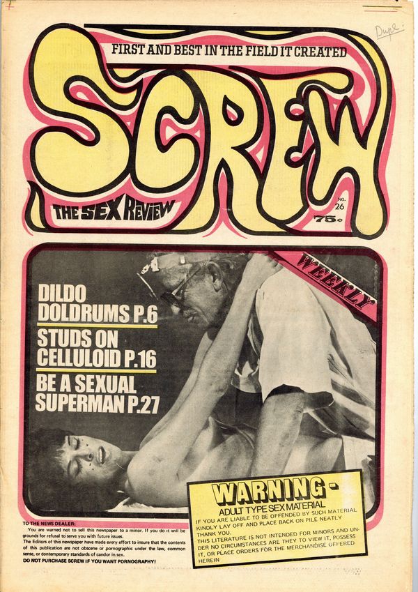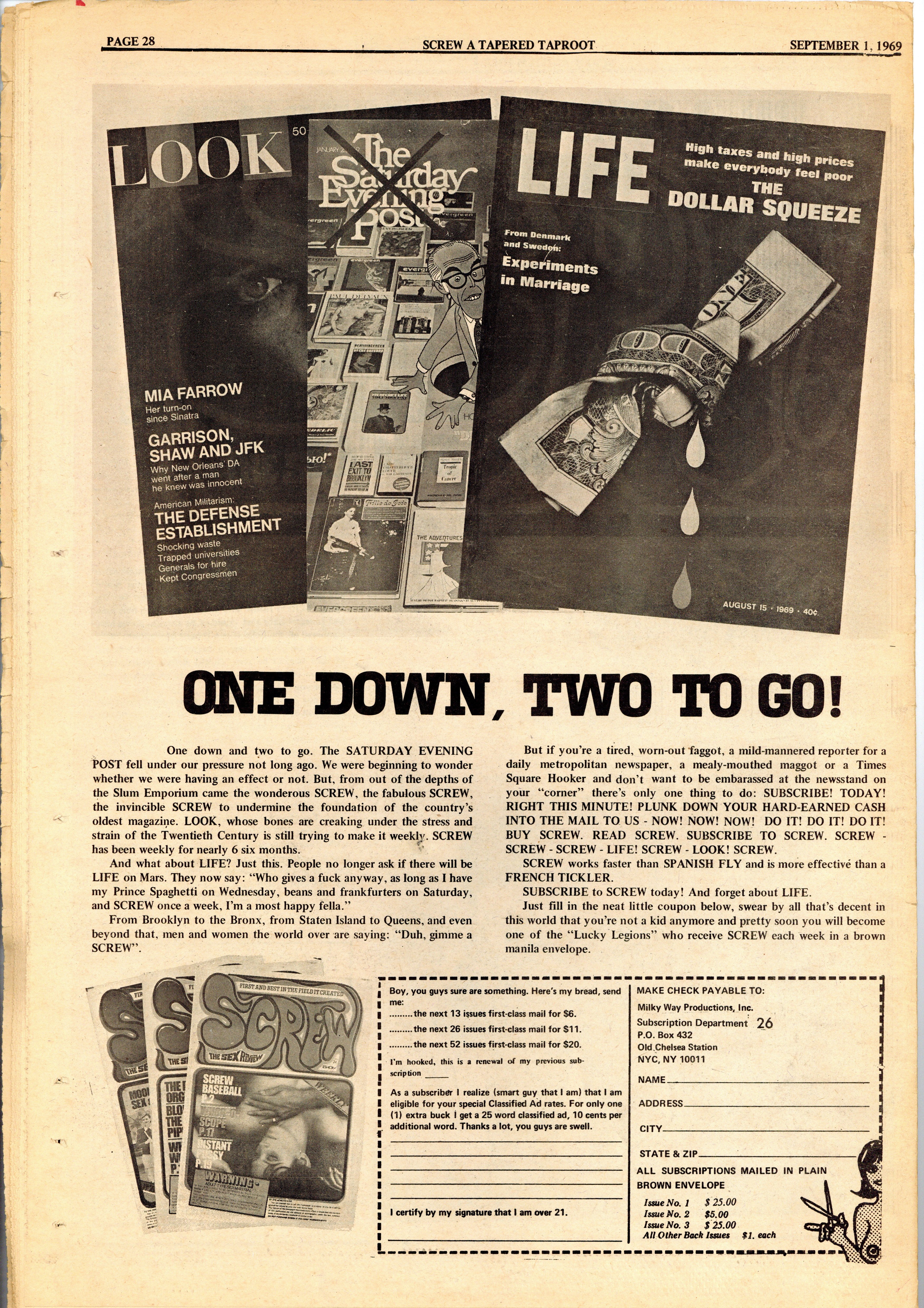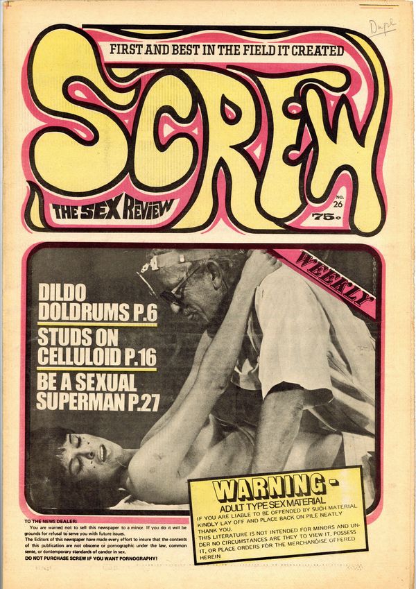 Published Sep 1969 by Milky Way Productions.$9.60Screw was a weekly tabloid newspaper published and edited by Al Goldstein and his Milky Way Productions. This New York based publication was notable for being a pioneer in bringing hardcore pornography into the American mainstream during the late 1960s and early 1970s. Tabloid format, 11.5" x 16.75", 28 pages, B&W. ADULT MATERIAL Cover price $0.75.