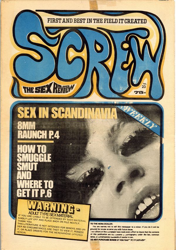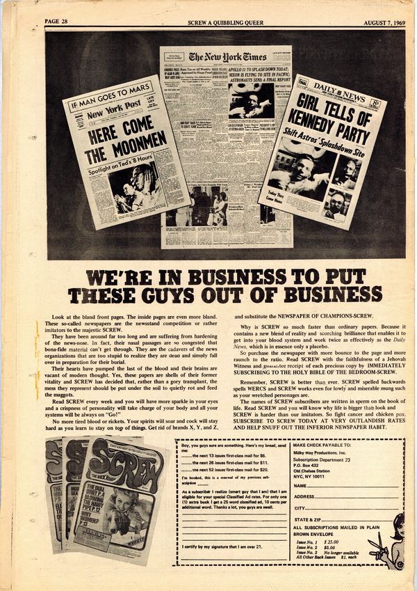 Published Aug 1969 by Milky Way Productions.$8.40Screw was a weekly tabloid newspaper published and edited by Al Goldstein and his Milky Way Productions. This New York based publication was notable for being a pioneer in bringing hardcore pornography into the American mainstream during the late 1960s and early 1970s. Tabloid format, 11.5" x 16.75", 28 pages, B&W. ADULT MATERIAL Cover price $0.75.