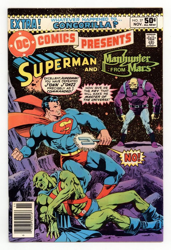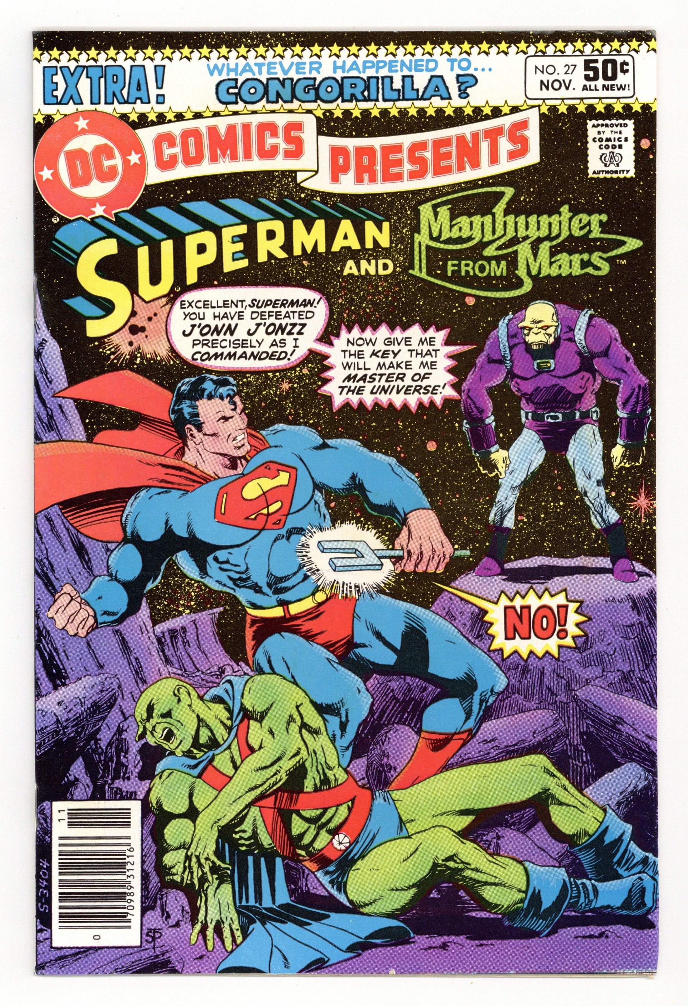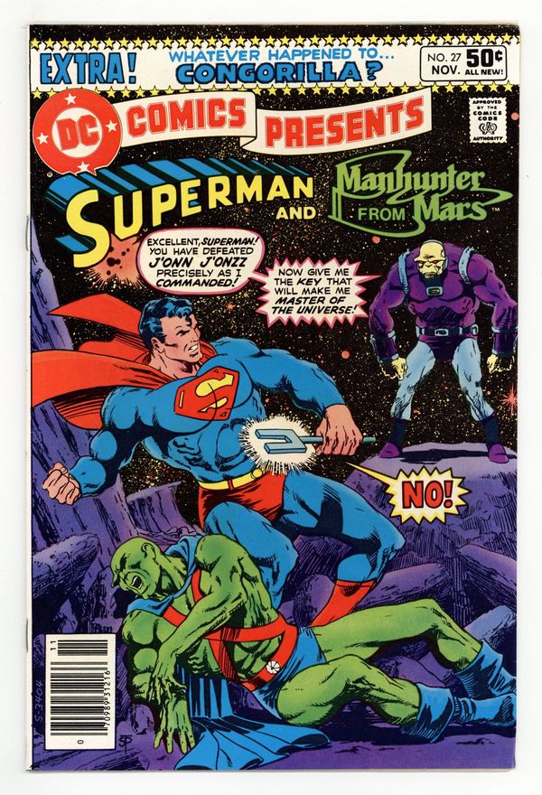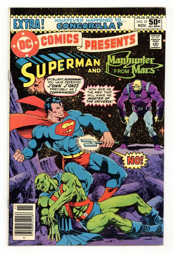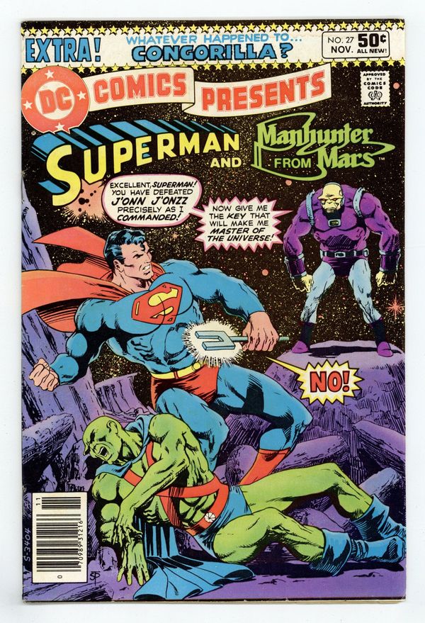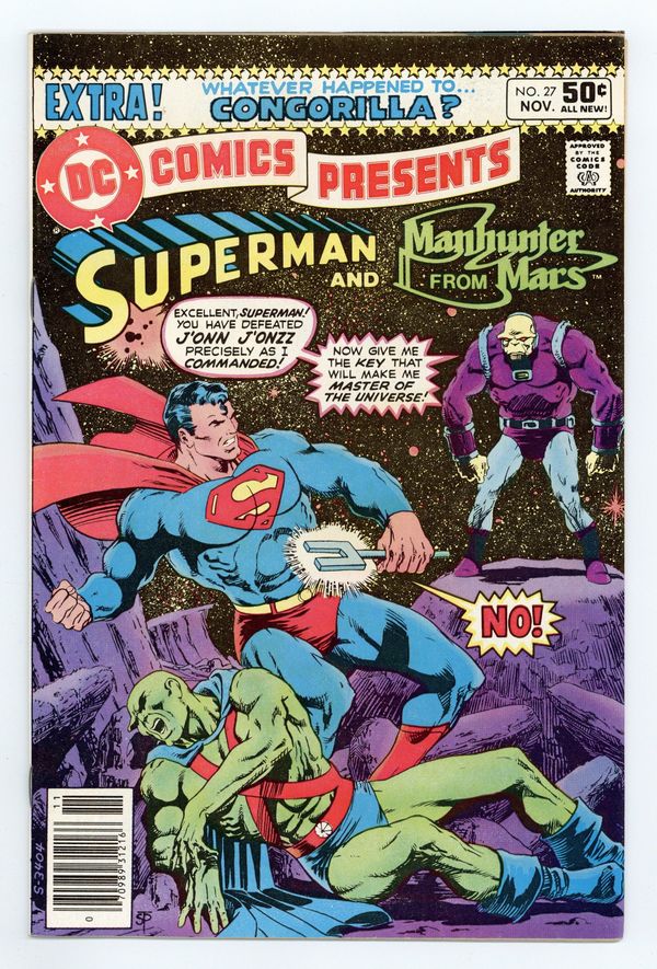 Tags: Superman$30.00Newsstand Edition. Superman and Manhunter from Mars star in "The Key That Unlocked Chaos!" First appearance of Mongul. Written by Len Wein, with art by Jim Starlin, Dick Giordano and Frank McLaughlin. Characters: Superman; Martian Manhunter [J'onn J'onzz, Manhunter from Mars]; Mongul (intro, villain); Steve Lombard; Jimmy Olsen; Lois Lane; The Warzoon (aliens, flashback); The Largas (aliens, flashback); green kryptonite. Plus: "Whatever Happened to Congorilla?" Written by Bob Rozakis, with art by Romeo Tanghal and Frank Chiaramonte. Characters: Congo Bill; Congorilla; Golden Gorilla; Janu; Mose; K'Bani (villain); Fred Cantrell (villain). Cover by Jim Starlin. Cover price $0.50.