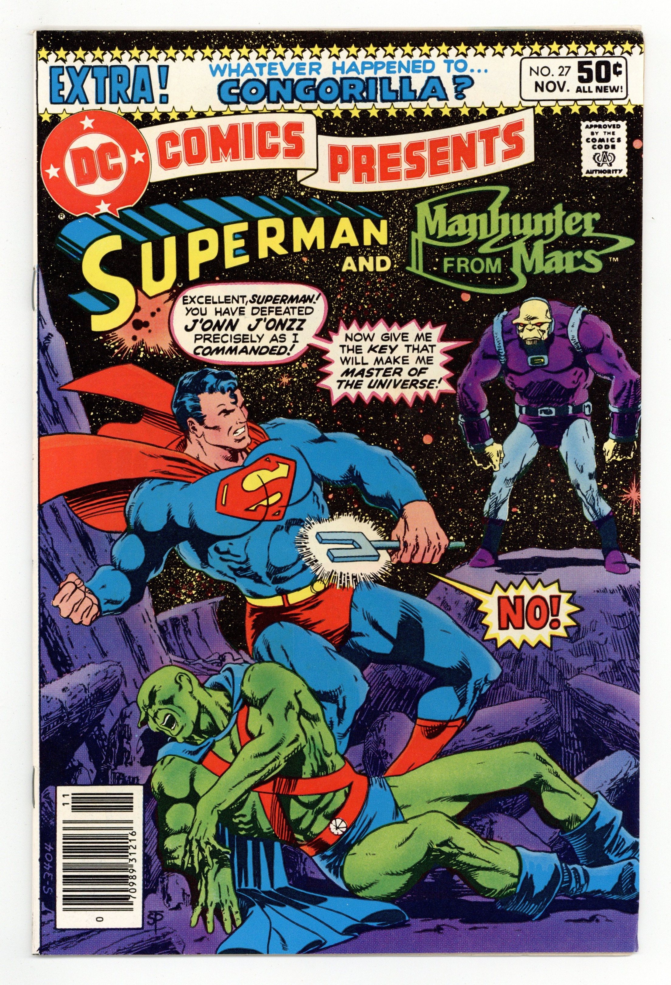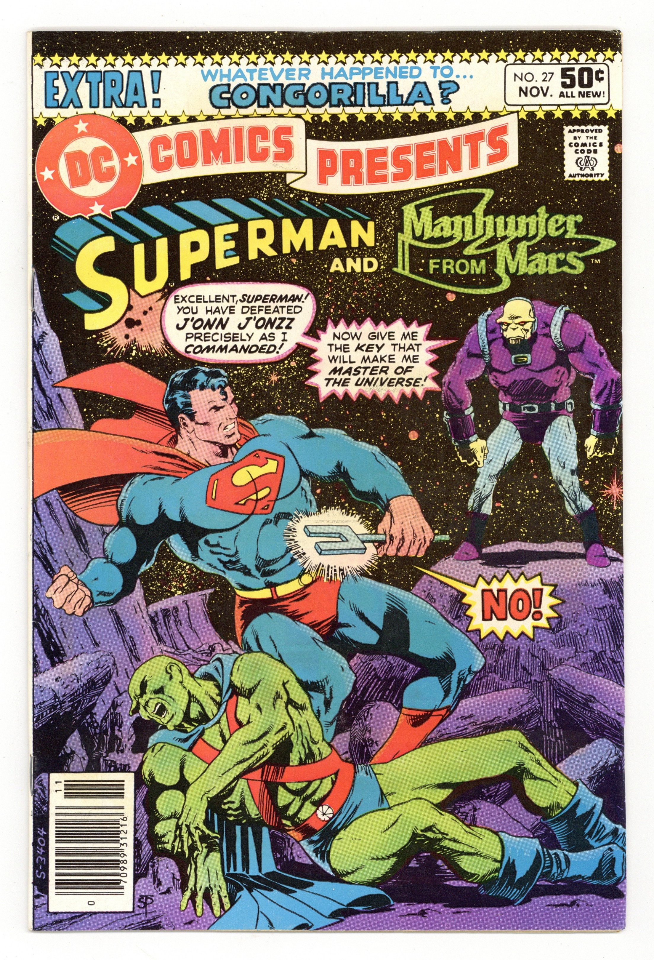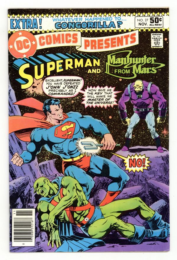 Newsstand Edition. Superman and Manhunter from Mars star in "The Key That Unlocked Chaos!" First appearance of Mongul. Written by Len Wein, with art by Jim Starlin, Dick Giordano and Frank McLaughlin. Characters: Superman; Martian Manhunter [J'onn J'onzz, Manhunter from Mars]; Mongul (intro, villain); Steve Lombard; Jimmy Olsen; Lois Lane; The Warzoon (aliens, flashback); The Largas (aliens, flashback); green kryptonite. Plus: "Whatever Happened to Congorilla?" Written by Bob Rozakis, with art by Romeo Tanghal and Frank Chiaramonte. Characters: Congo Bill; Congorilla; Golden Gorilla; Janu; Mose; K'Bani (villain); Fred Cantrell (villain). Cover by Jim Starlin. Cover price $0.50.