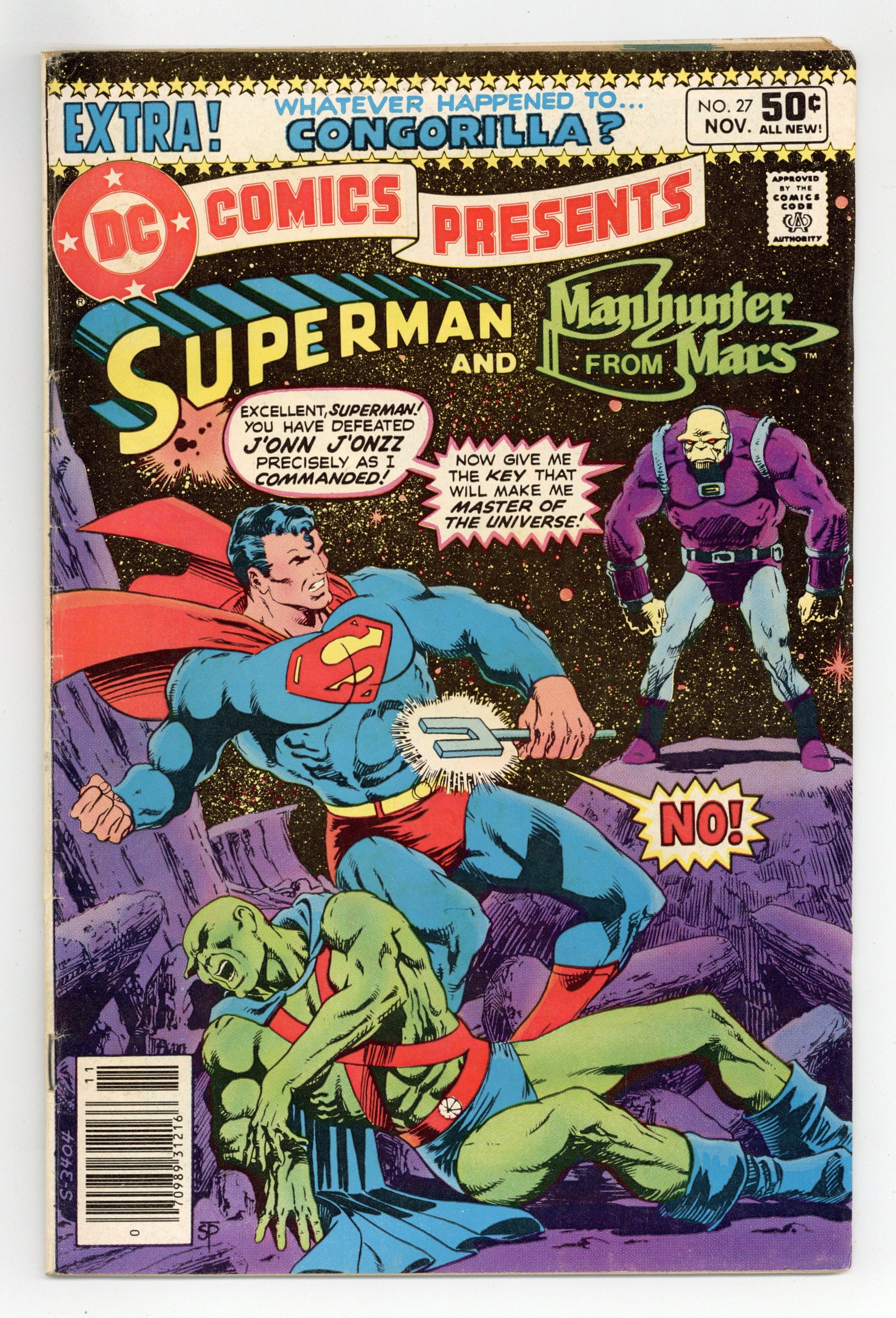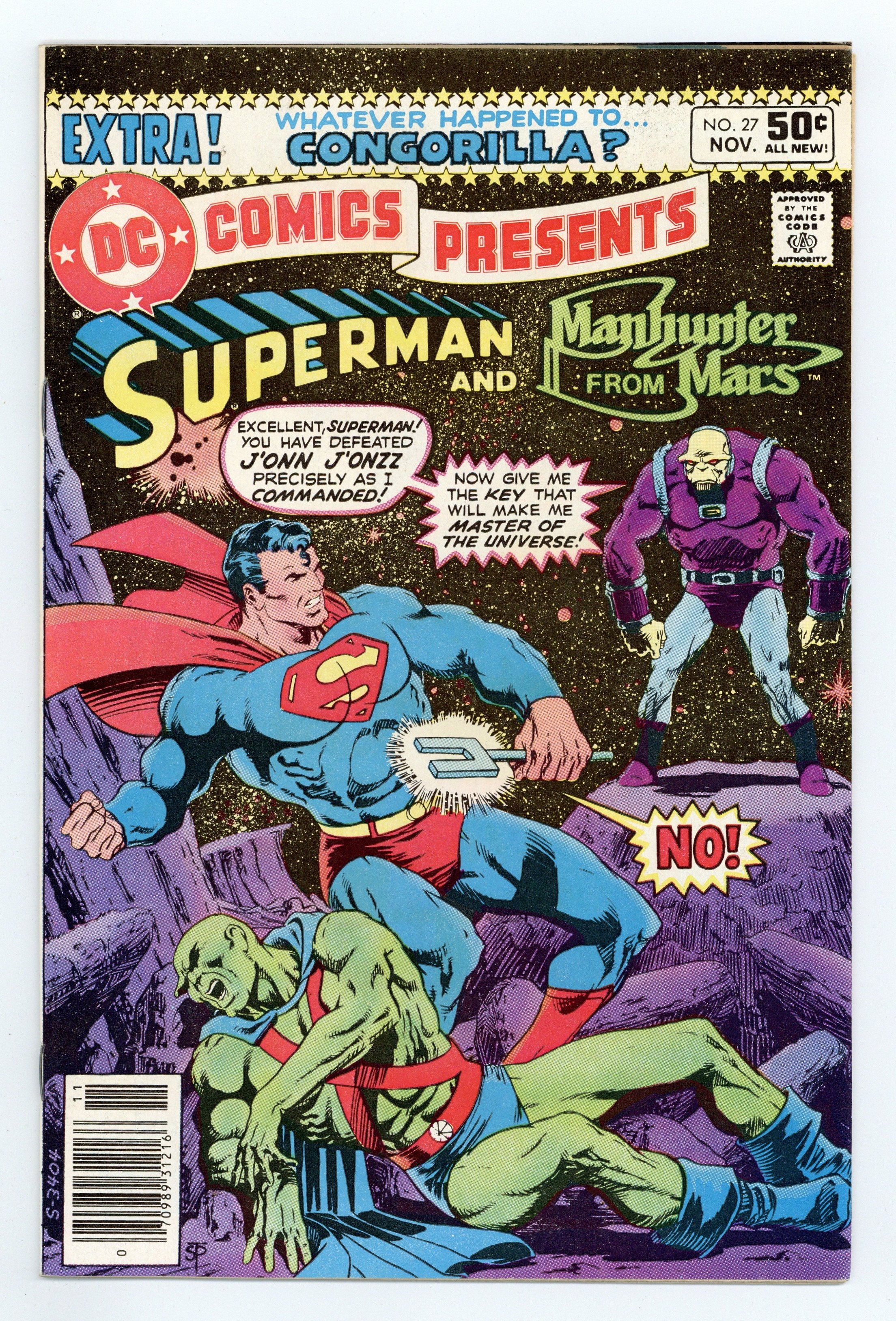 Tags: Superman$27.00Newsstand Edition. Superman and Manhunter from Mars star in "The Key That Unlocked Chaos!" First appearance of Mongul. Written by Len Wein, with art by Jim Starlin, Dick Giordano and Frank McLaughlin. Characters: Superman; Martian Manhunter [J'onn J'onzz, Manhunter from Mars]; Mongul (intro, villain); Steve Lombard; Jimmy Olsen; Lois Lane; The Warzoon (aliens, flashback); The Largas (aliens, flashback); green kryptonite. Plus: "Whatever Happened to Congorilla?" Written by Bob Rozakis, with art by Romeo Tanghal and Frank Chiaramonte. Characters: Congo Bill; Congorilla; Golden Gorilla; Janu; Mose; K'Bani (villain); Fred Cantrell (villain). Cover by Jim Starlin. Cover price $0.50.
