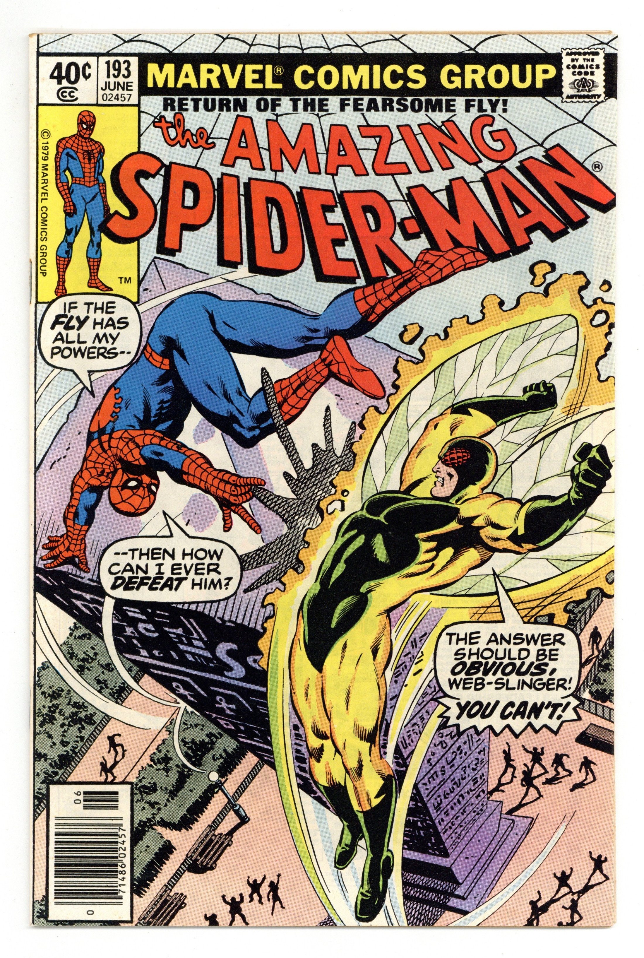 Tags: Spider-Man$17.00Newsstand Edition. "The Wings of the Fearsome Fly!" Script by Marv Wolfman. Art by Keith Pollard (layouts) and Jim Mooney (finishes). Cover by Al Milgrom and Bob McLeod. Peter Parker's life is a train wreck after surviving his recent 24-hour ordeal. In very short order Jonah fires him, Mary Jane dumps him, and Ned Leeds punches him! Oh my, where is a super-villain when Spidey really needs one? Fortunately, there is one flying around town for the web-slinger to vent his frustration upon: the Fearsome Fly! But when the wall-crawler and the Fly collide at Cleopatra's Needle, Spider-Man's day just gets worse. Meanwhile, the original burglar from Amazing Fantasy 15 is back...and still haunting (Aunt) May Parker. Cameo appearances by Mary Jane Watson, Betty Brant, and Mysterio (in civilian clothes). (Notes: The Fly appears next in Spider-Woman 30. The plot briefly crosses over with Fantastic Four 207. Other than a cameo appearance in issue 201, Mary Jane Watson exits the Amazing Spider-Man series for the next 4 years.) 36 pages. Cover price $0.40.