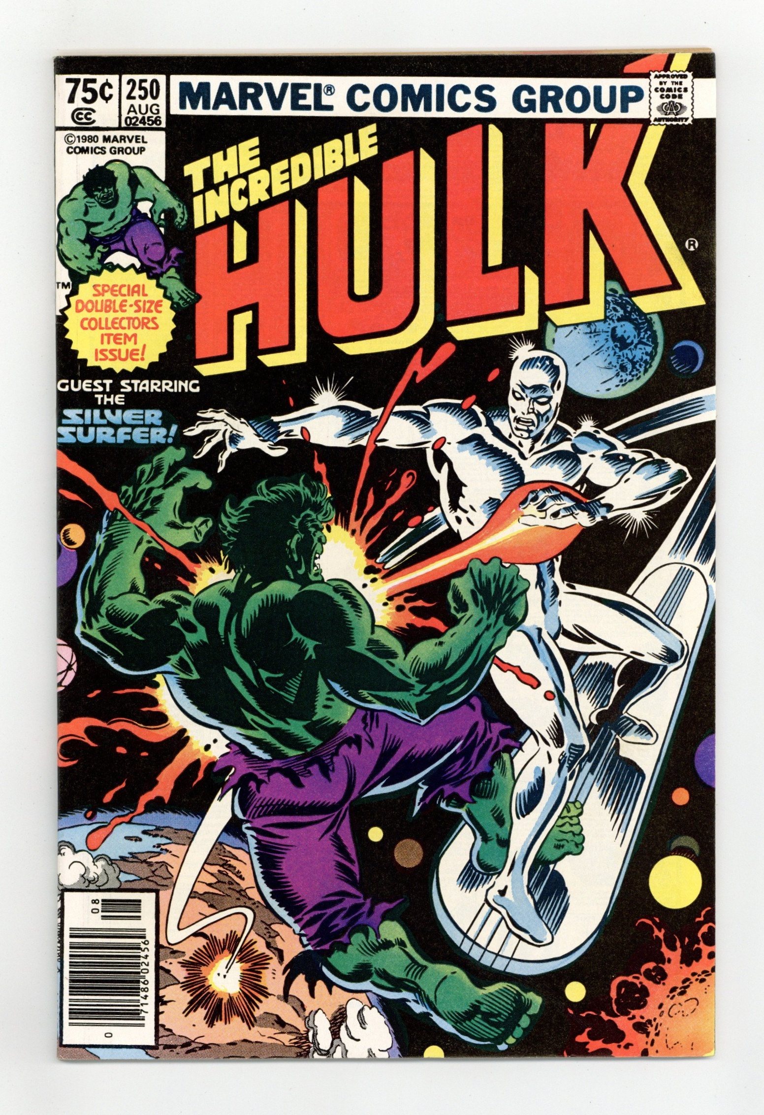 Newsstand Edition. Special giant-sized issue. Guest-starring Silver Surfer. A 250th celebration brought to you by Bill Mantlo and Sal Buscema. The Earth trembles when titans clash. It's the nigh unstoppable Incredible Hulk vs. the former Herald of Galactus, the Silver Surfer. Imprisoned on Earth by his former master, the Silver Surfer intends to add the immeasurable power of the Hulk to his own and break the barrier that keeps him from his home Zenn-La and his beloved. The only problem is, the Hulk has never been known for his generosity. 52 pages. Cover price $0.75.