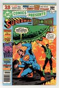 Tags: Superman$54.00Newsstand Edition. 1st appearance of the New Teen Titans in preview story; 1st appearances of Raven, Cyborg and Starfire. Cover by Jim Starlin. Stories by Jim Starlin, Marv Wolfman and Bob Rozakis. Art by Jim Starlin, George Pérez, José Delbo, Steve Mitchell, Dick Giordano and Kim DeMulder. N'Gon is attempting to gain power by taking it from other super-beings, but Superman and Green Lantern combine forces to imprison N'Gon in "Between Friend and Foe!" by Jim Starlin (plot and pencils), Marv Wolfman (script) and Steve Mitchell (inks). Characters in this story: Green Lantern [Hal Jordan]; Superman [Clark Kent]; Green Lantern [Archon Z'Gmora]; N'Gon (villain); Archie Jones. Plus: Raven uses her powers to enter Dick Grayson's dreams to show him a scene from the not-too-distant future of the new Teen Titans team battling to save the world from an other-dimensional protoplasmic creature in "Where Nightmares Begin!" by Marv Wolfman, George Pérez and Dick Giordano. Characters in this story: Teen Titans [Changeling [Garfield Logan] (introduction as Changeling); Cyborg [Victor Stone] (introduction); Kid Flash [Wally West]; Raven (introduction); Robin [Dick Grayson]; Starfire [Koriand'r] (introduction); Wonder Girl [Donna Troy]]; Silas Stone (introduction); an other-dimensional protoplasm (villain). Story continues in New Teen Titans (1980) (Tales of ...) #1. Also: The Matter Master attempts to steal the Ruby of Life but Sargon stops him in the back-up story "Whatever Happened to Sargon the Sorcerer?" by Bob Rozakis, José Delbo and Kim DeMulder. Characters in this story: Justice League of America [The Atom [Ray Palmer] (flashback); Batman [Bruce Wayne] (flashback); The Flash [Barry Allen] (flashback); Green Arrow [Oliver Queen] (flashback); Hawkman [Katar Hol/Carter Hall] (flashback); Superman [Clark Kent] (flashback); Wonder Woman [Diana Prince] (flashback)]; The Matter Master [Mark Mandrill] (villain); Sargon the Sorcerer [John Sargent]. And: Hawkman vs. Golden Raven in 1-page Hostess Fruit Pies ad "She's No Angel" with pencils by Curt Swan. 48 pages, full color. Cover price $0.50.