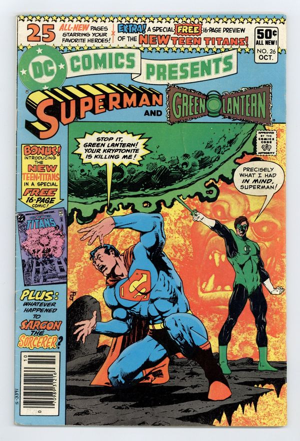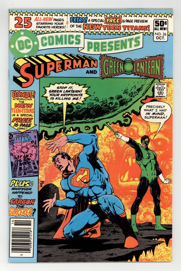 Newsstand Edition. 1st appearance of the New Teen Titans in preview story; 1st appearances of Raven, Cyborg and Starfire. Cover by Jim Starlin. Stories by Jim Starlin, Marv Wolfman and Bob Rozakis. Art by Jim Starlin, George Pérez, José Delbo, Steve Mitchell, Dick Giordano and Kim DeMulder. N'Gon is attempting to gain power by taking it from other super-beings, but Superman and Green Lantern combine forces to imprison N'Gon in "Between Friend and Foe!" by Jim Starlin (plot and pencils), Marv Wolfman (script) and Steve Mitchell (inks). Characters in this story: Green Lantern [Hal Jordan]; Superman [Clark Kent]; Green Lantern [Archon Z'Gmora]; N'Gon (villain); Archie Jones. Plus: Raven uses her powers to enter Dick Grayson's dreams to show him a scene from the not-too-distant future of the new Teen Titans team battling to save the world from an other-dimensional protoplasmic creature in "Where Nightmares Begin!" by Marv Wolfman, George Pérez and Dick Giordano. Characters in this story: Teen Titans [Changeling [Garfield Logan] (introduction as Changeling); Cyborg [Victor Stone] (introduction); Kid Flash [Wally West]; Raven (introduction); Robin [Dick Grayson]; Starfire [Koriand'r] (introduction); Wonder Girl [Donna Troy]]; Silas Stone (introduction); an other-dimensional protoplasm (villain). Story continues in New Teen Titans (1980) (Tales of ...) #1. Also: The Matter Master attempts to steal the Ruby of Life but Sargon stops him in the back-up story "Whatever Happened to Sargon the Sorcerer?" by Bob Rozakis, José Delbo and Kim DeMulder. Characters in this story: Justice League of America [The Atom [Ray Palmer] (flashback); Batman [Bruce Wayne] (flashback); The Flash [Barry Allen] (flashback); Green Arrow [Oliver Queen] (flashback); Hawkman [Katar Hol/Carter Hall] (flashback); Superman [Clark Kent] (flashback); Wonder Woman [Diana Prince] (flashback)]; The Matter Master [Mark Mandrill] (villain); Sargon the Sorcerer [John Sargent]. And: Hawkman vs. Golden Raven in 1-page Hostess Fruit Pies ad "She's No Angel" with pencils by Curt Swan. 48 pages, full color. Cover price $0.50.
