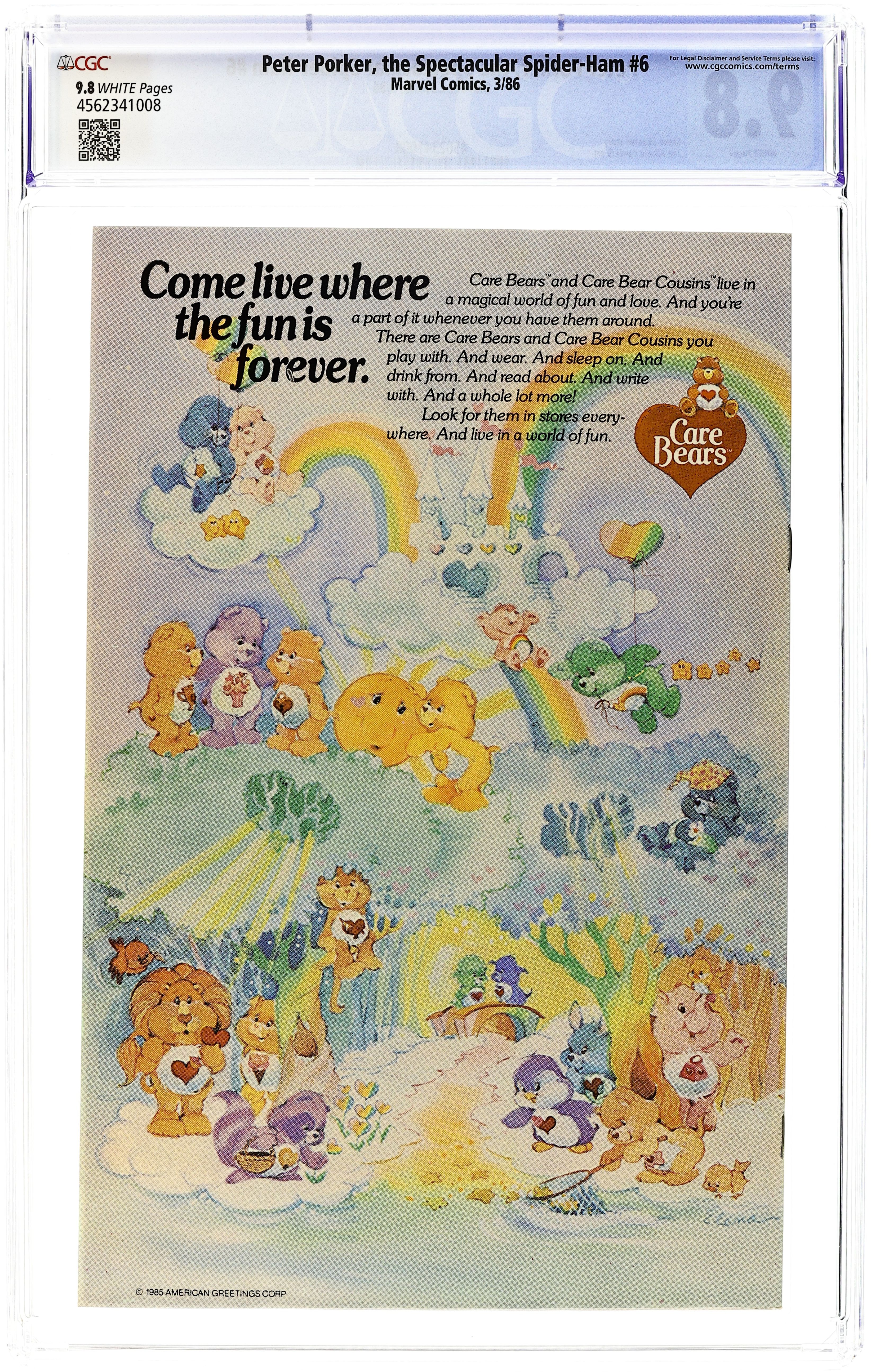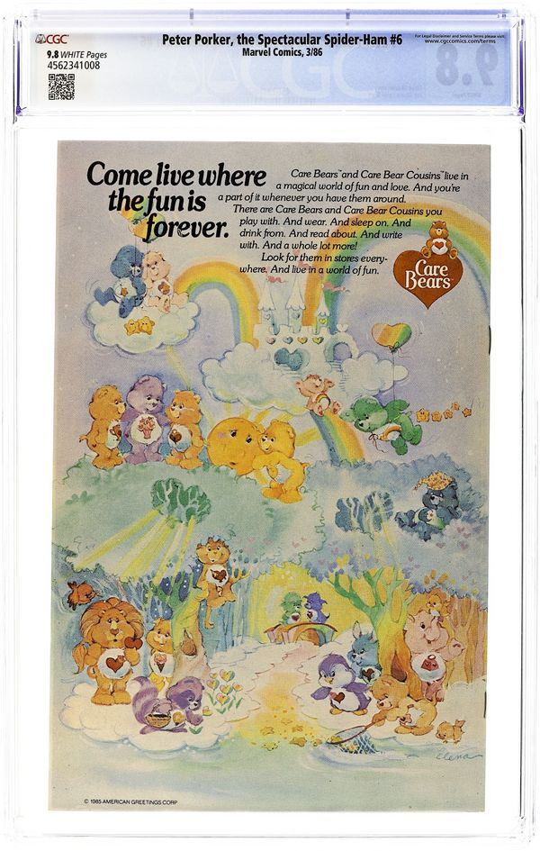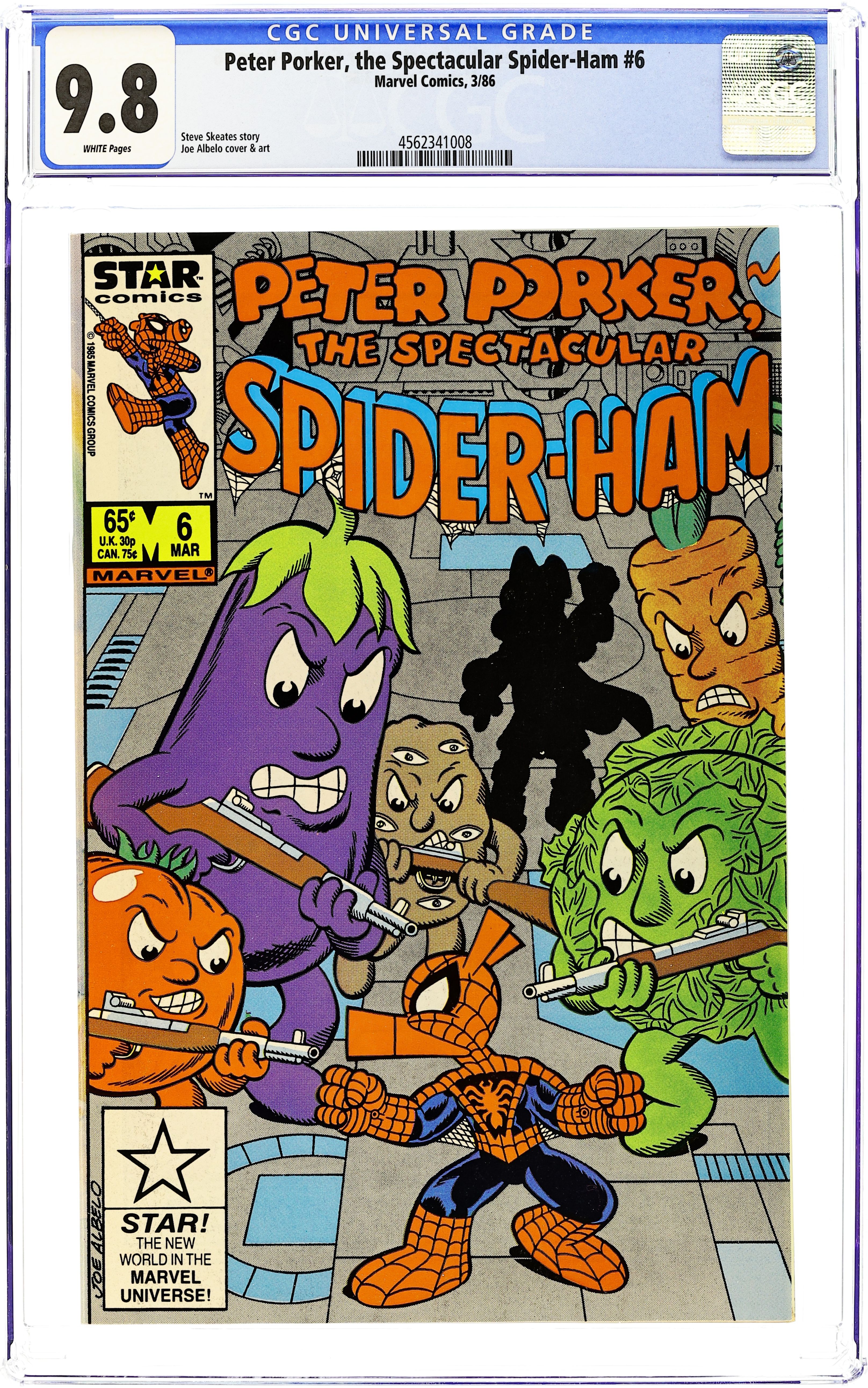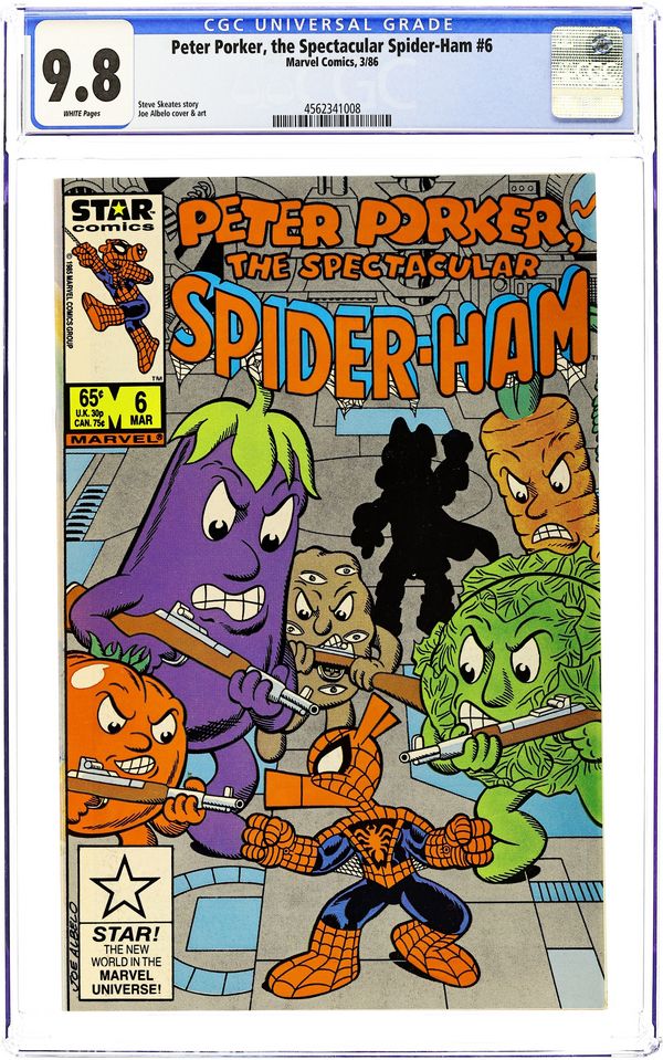 Direct Edition. Last 65-cent cover price. Cover by Joe Albelo. "Salad Daze," script by Steve Skeates, art by Joe Albelo; After spoiling a jewel robbery, Spider-Ham returns home, and surprises Aunt May, who falls into a coma; A robbery at the hospital puts him on the trail of the Master Conniver, who turns out to be Ducktor Doom, and the three interns on the trail of Spider-Ham; He battles gun-toting giant vegetables, Doom escapes, and a vegetable-to-May transfusion saves her. "Awful Flight," script by Steve Skeates, art by Steve Mellor; Snow-Youse awakens from a bad dream and finds herself in Walrus's home, where they are joined by Aroma, Trinket, and Hockeypuck. Heading out to fight acid rain, the team ponders their fate, finds a US Dollar, and spends it on root beer. Letter from comics artist Todd Nauck. 36 pgs., full color. $0.65. Cover price $0.65.
