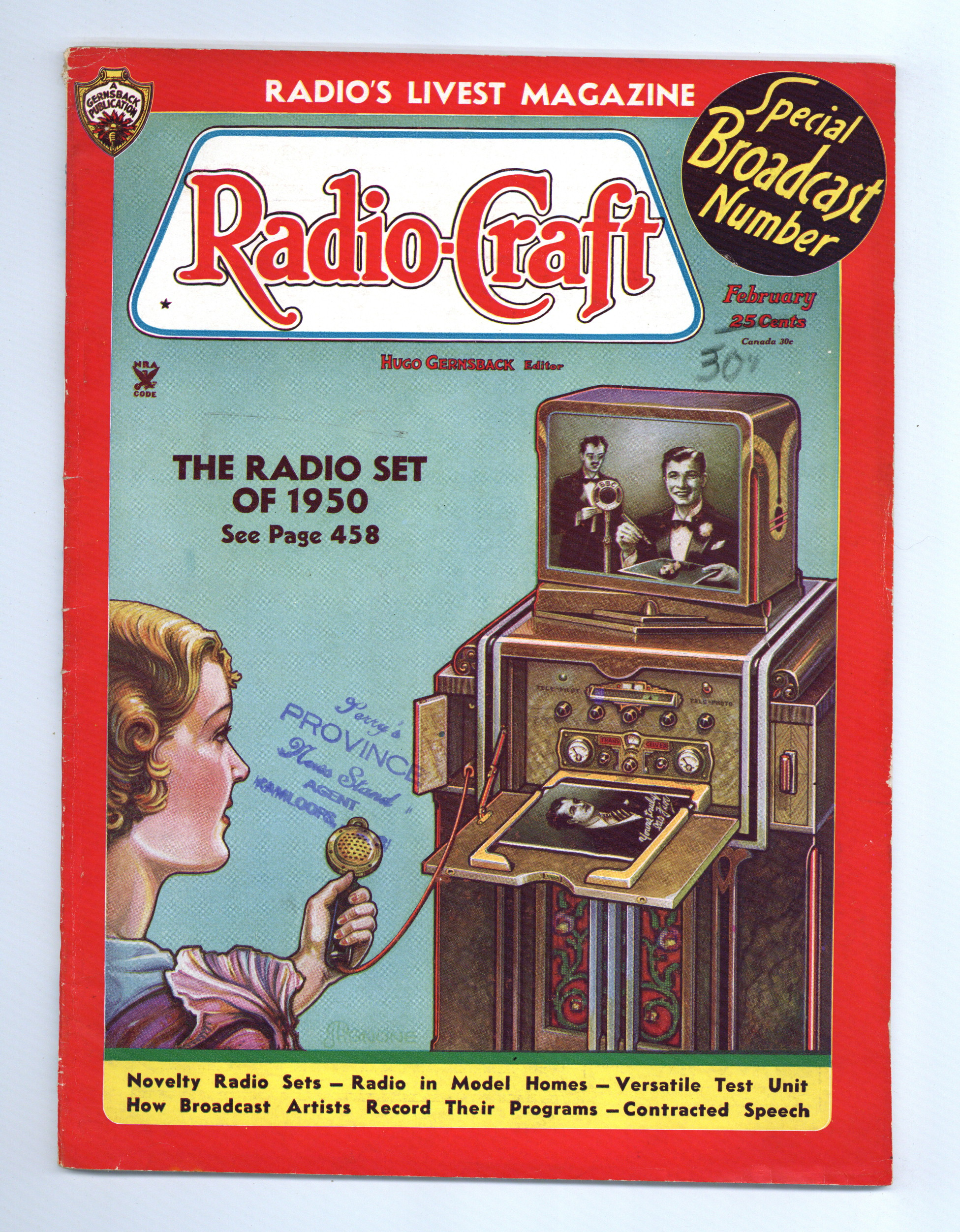 Published Feb 1935 by Radcraft Publications.$15.50Published by Hugo Gernsback, considered the father of science-fiction. This issue is centered around the new medium of television with Gernsback's editorial, "The Television Age". 8.5" x 11.5". 128 pages. Black and white. Cover price $0.25.