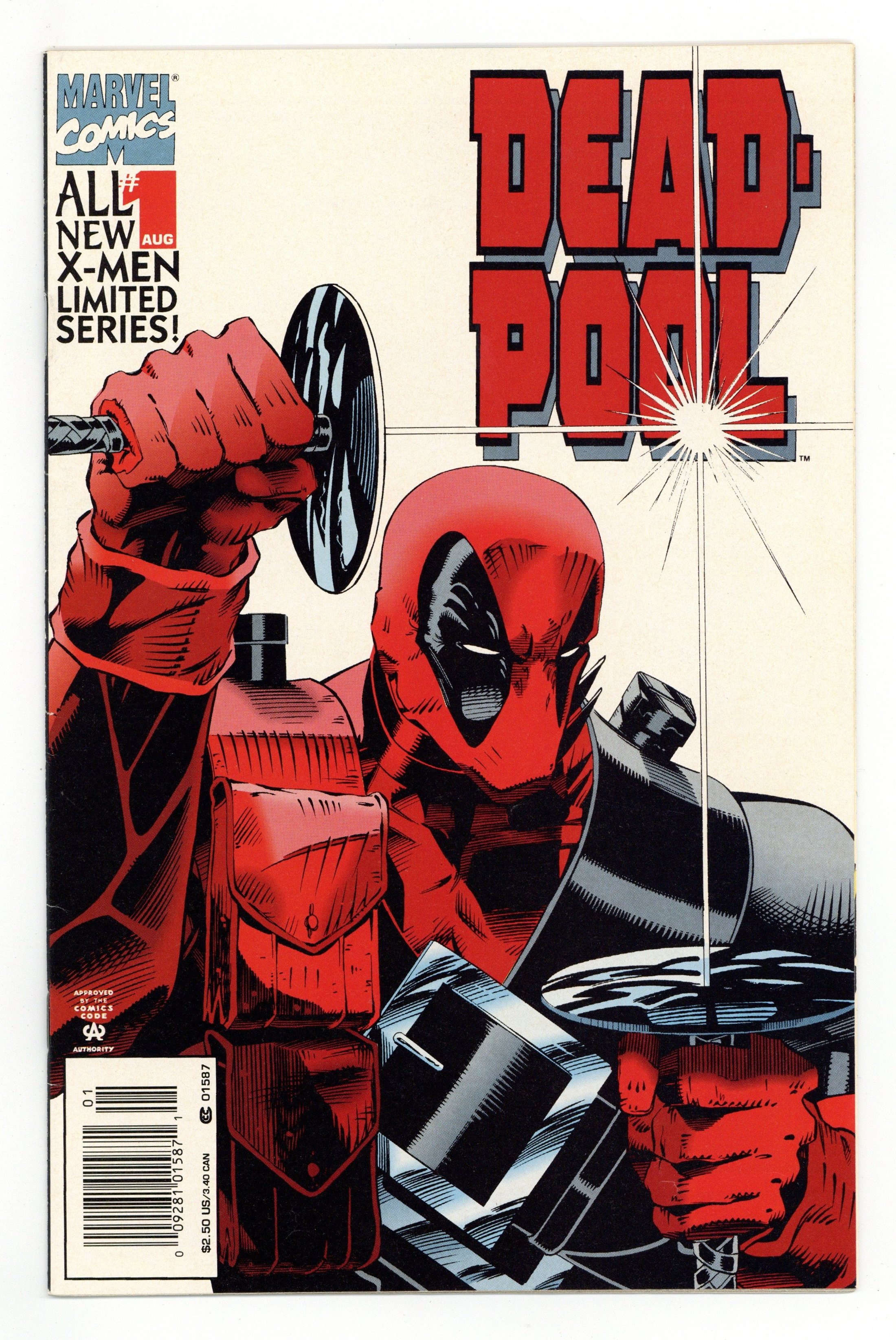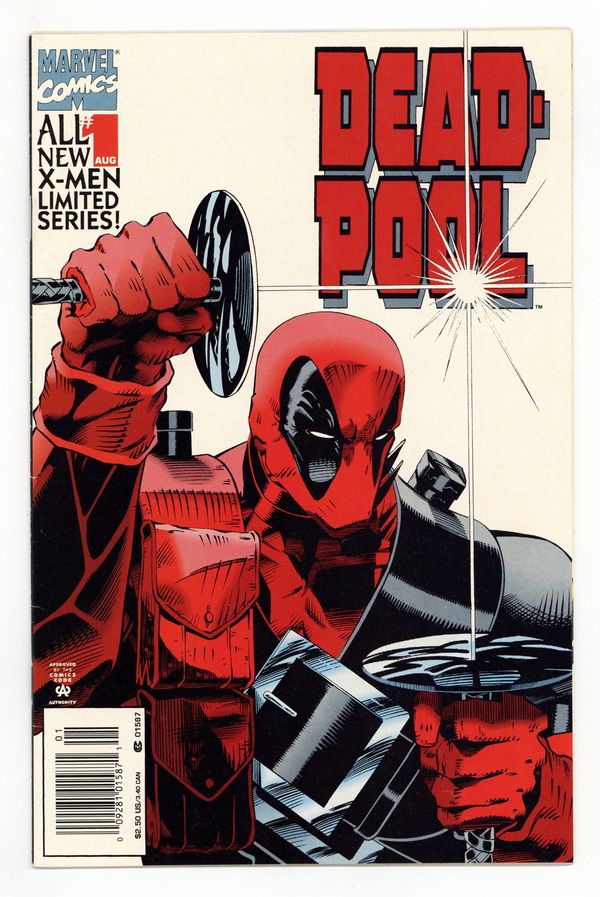 Newsstand Edition. Cover pencils by Ian Churchill. If Looks Could Kill, script by Mark Waid, pencils by Ian Churchill, inks by Jason Minor; Black Tom is dying from his wooden infection and Banshee has Dr. Killebrew, a specialist in cellular regeneration, treat him in prison; Juggernaut breaks in, rescues Tom and captures Killebrew; Deadpool is out for a quiet drink when he is assaulted by Black Tom's goons but he gets a timely assist from old pal Banshee and his daughter, Siryn; During the battle, DP's hand is cut off and he blacks out as his healing factor fails to regenerate it. Waid's 1st work for Marvel. Cover price $2.50.