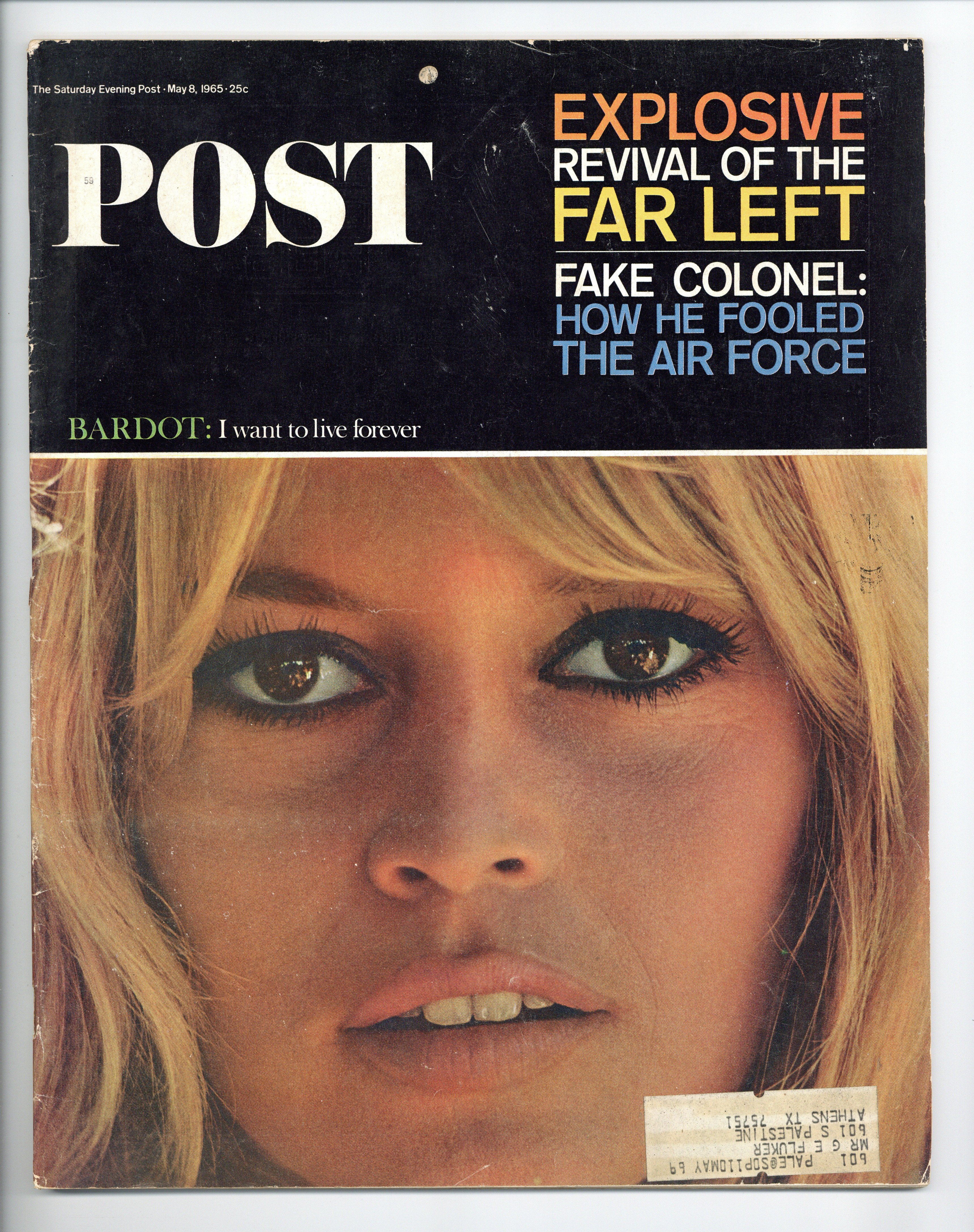 May 8, 1965. Cover and article with Brigitte Bardot. The classic magazine featuring current event articles, editorials, human interest pieces, humor, illustrations, a letter column, poetry, single-panel gag cartoons, and stories by the leading writers of the time. 10.5" x 13.5", 106 pages, PC/PB&W Cover price $0.25.