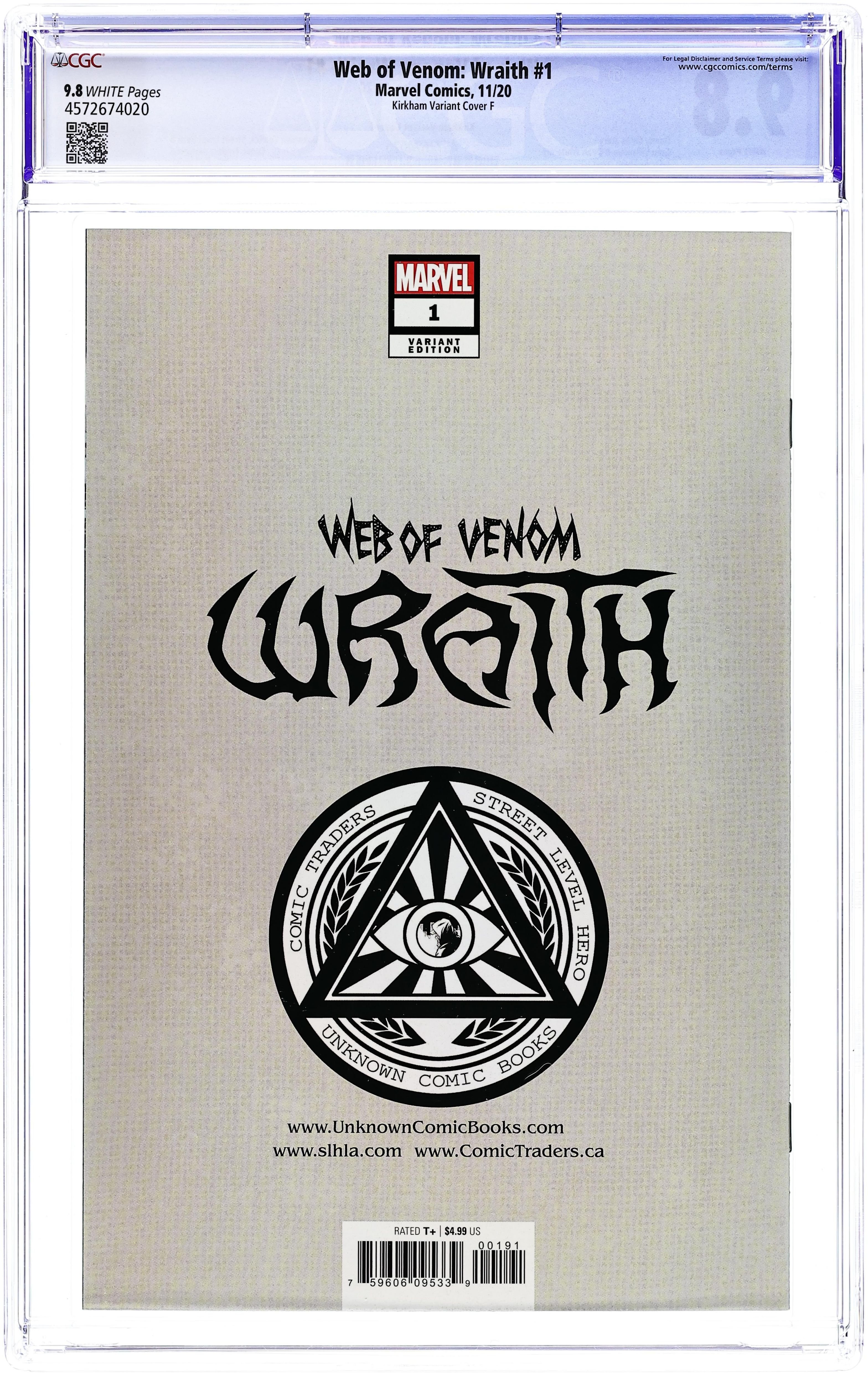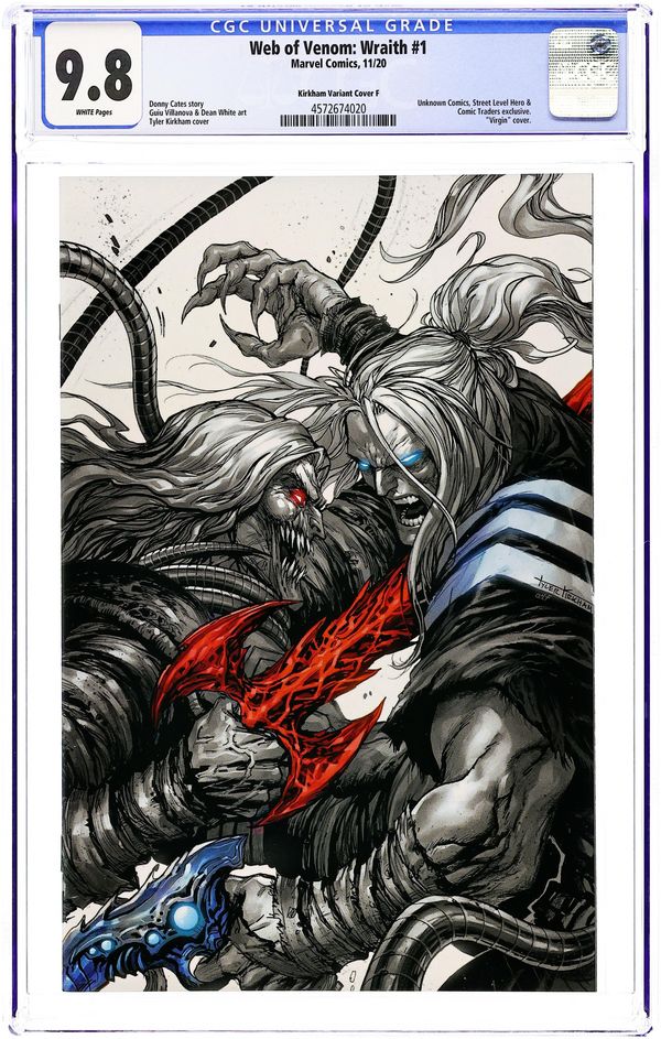 Comics Illuminati (Unknown Comics, Street Level Hero, and Comic Traders) exclusive Color Splash Edition Virgin Cover by Tyler Kirkham. Written by Donny Cates. Art by Guiu Villanova. Since his appearance in GUARDIANS OF THE GALAXY, one thing WRAITH has made perfectly clear is that he's hunting KNULL, the God of the Symbiotes. Now, in the wastelands on the outskirts of the cosmos, he'll have his chance to face him… 36 pages, full color. Rated T+ Cover price $4.99.
