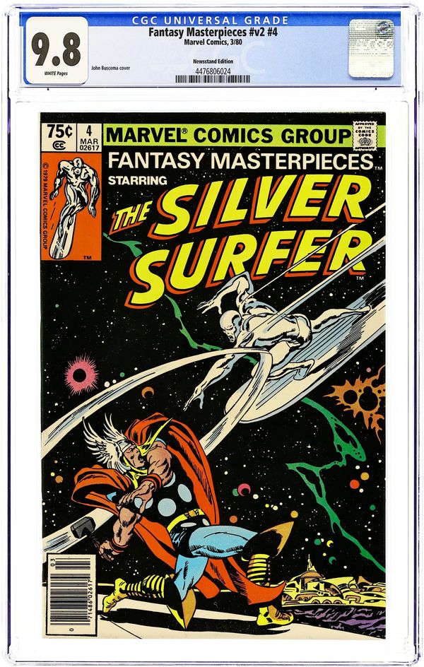 Newsstand Edition. Reprints Silver Surfer (1969 1st Series) #4. "The Good, the Bad, and the Uncanny!" Written by Stan Lee. Pencils by John Buscema. Inks by Sal Buscema. Guest-starring Thor. When the Silver Surfer ventures to fabled Asgard, home of the Norse Gods, a misunderstanding sets the Sentinel of the Spaceways against the mighty God of Thunder. It's the Power Cosmic vs. godly might. It's Thor vs. the Silver Surfer in a battle that will truly shake the heavens! Cover price $0.75.