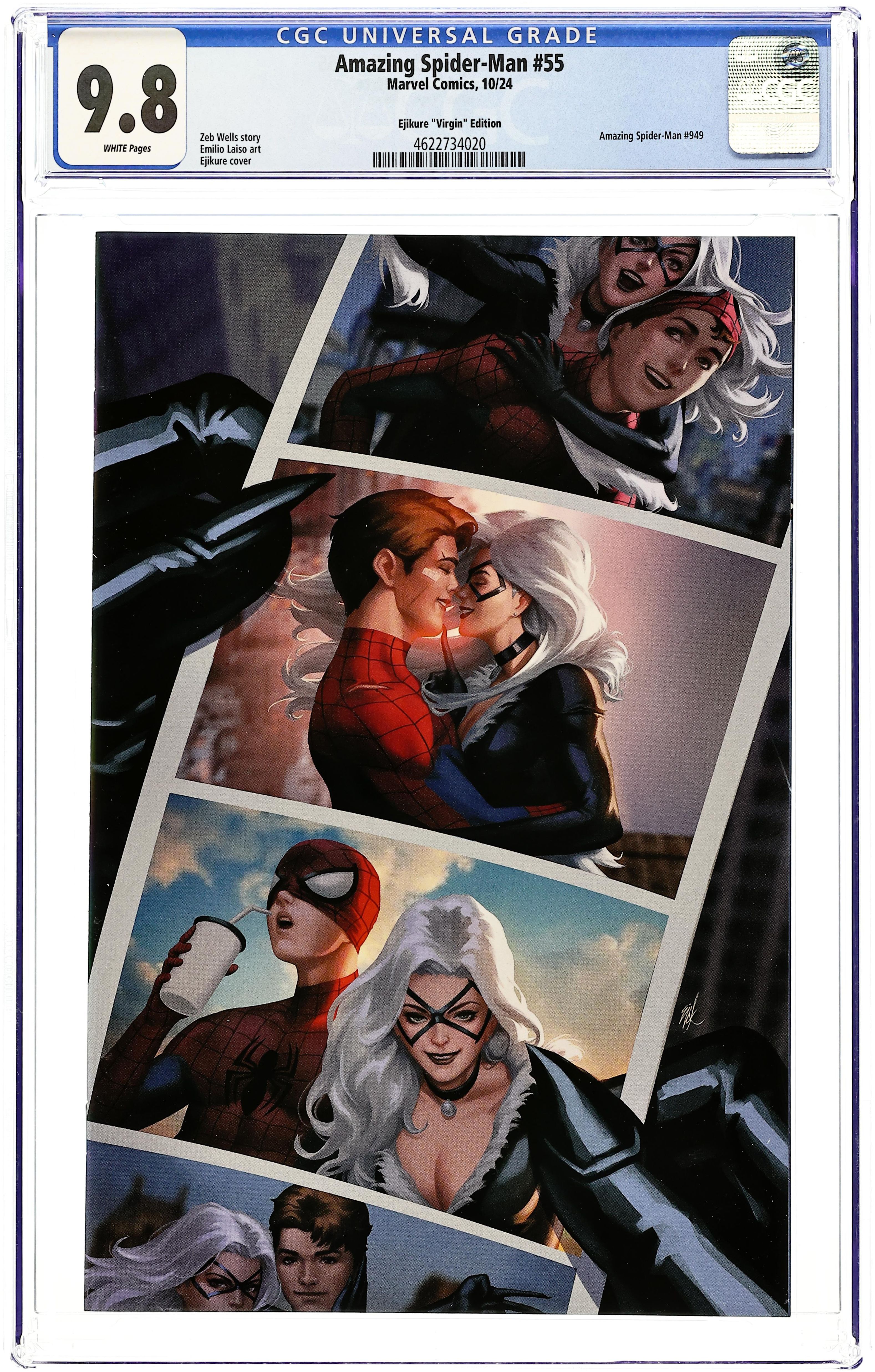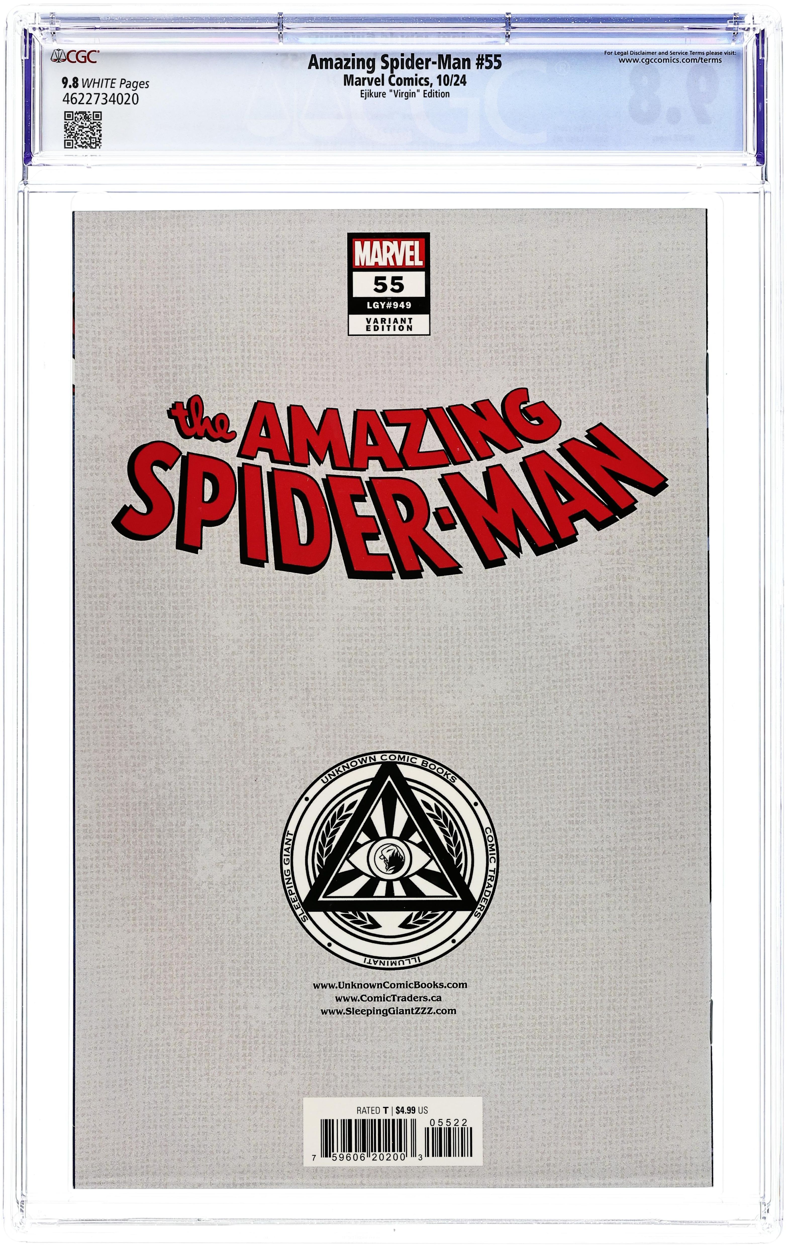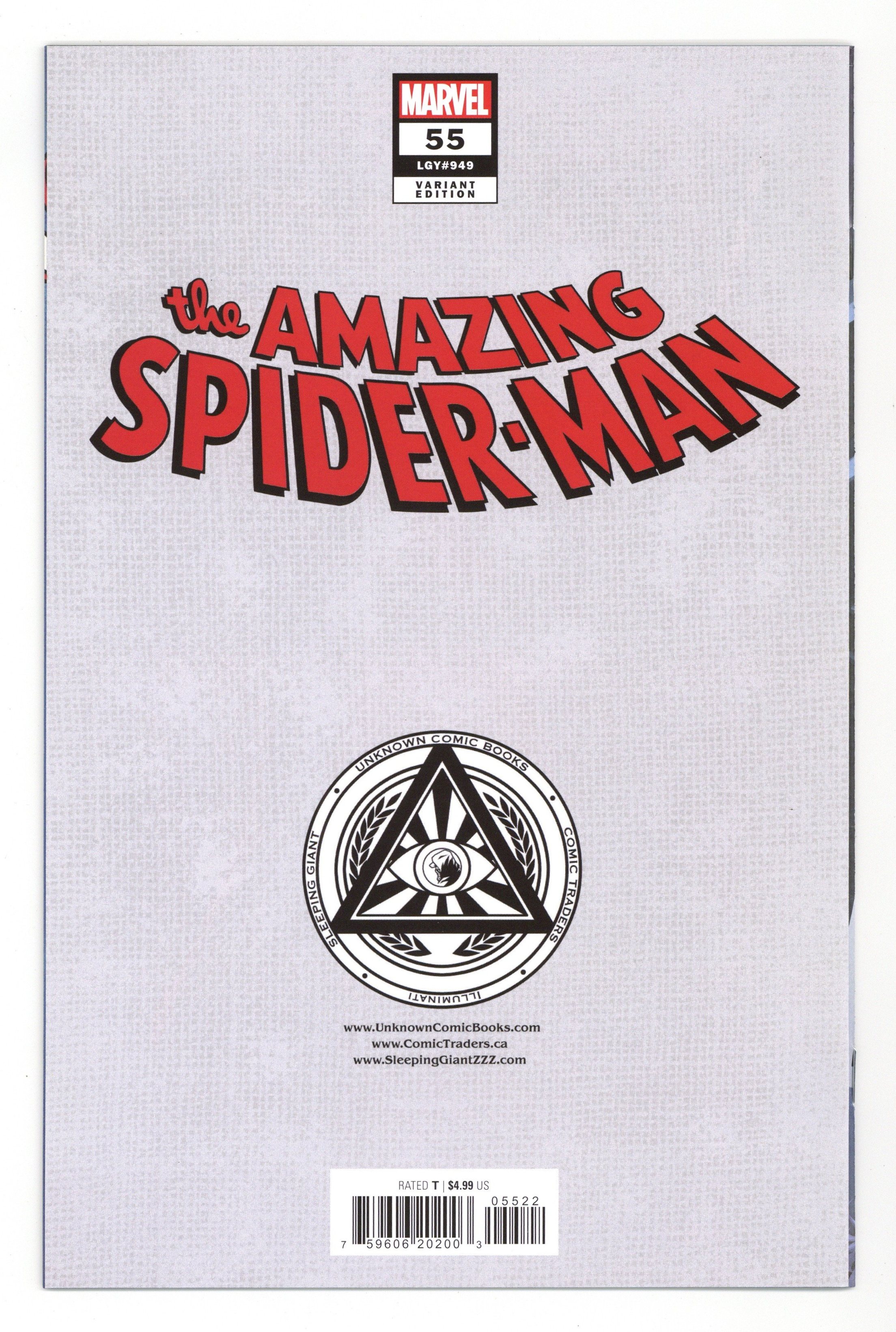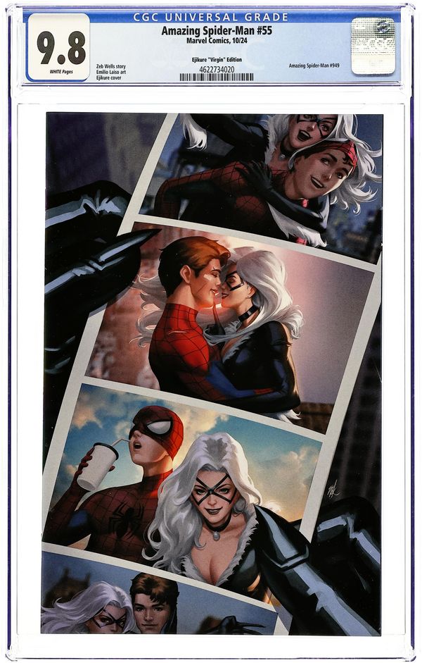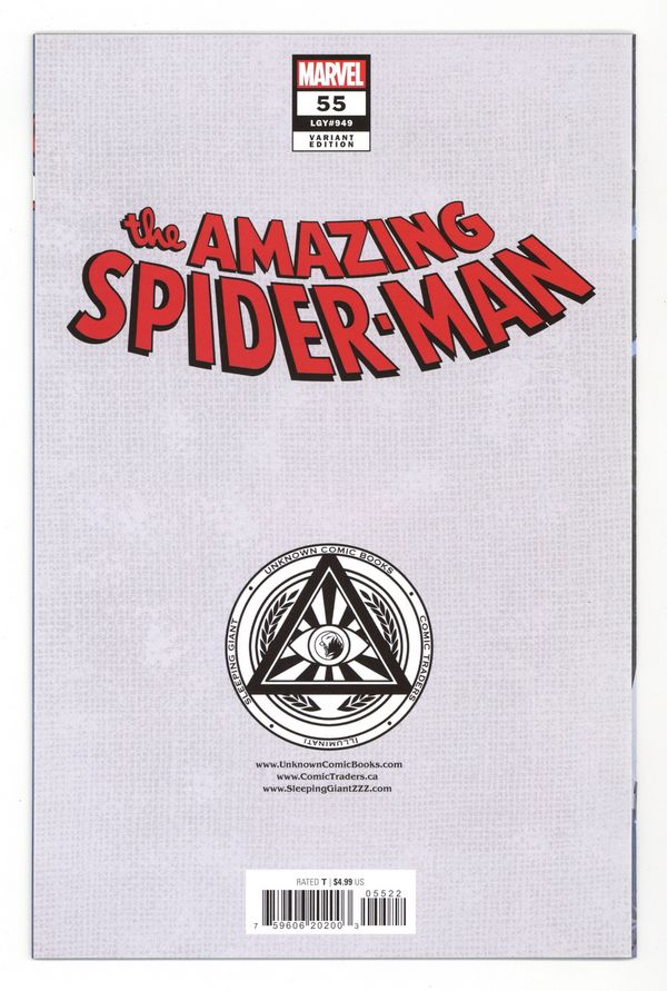 Comics Illuminati (Unknown Comics, Comic Traders, and Sleeping Giant) Exclusive Virgin Cover by Ejikure. Written by Zeb Wells. Art by Emilio Laiso. Cover by Luciano Vecchio. The last arc nearly killed Spider-Man (others weren't so lucky). Peter hopes to take a breath but gets a new challenge to face in this, the 949th legacy issue of AMAZING SPIDER-MAN! This is the last domino to fall as we head into our next big centennial! 32 pages, full color. Rated T