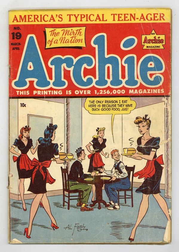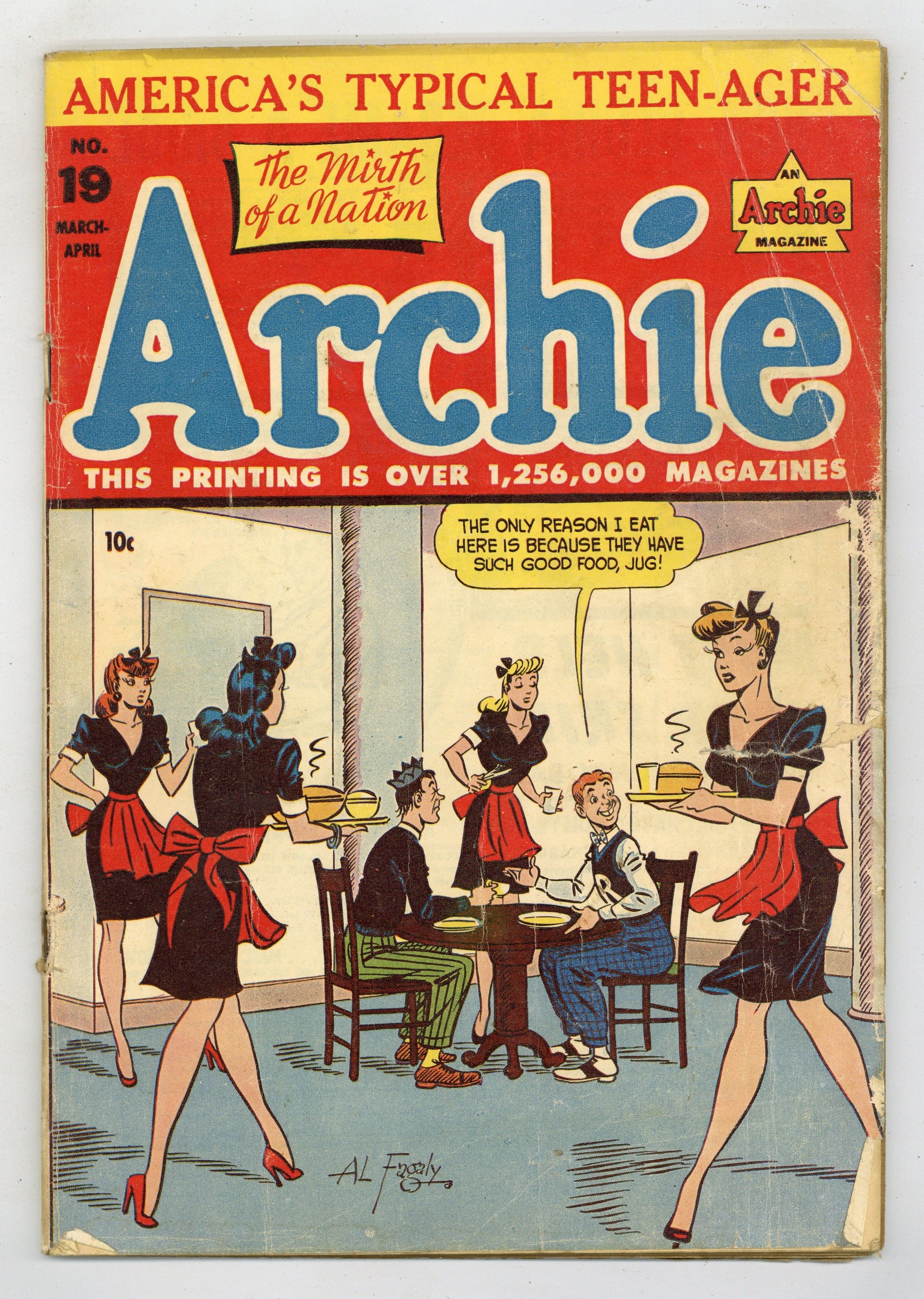 Cover by Al Fagaly. Stories by Bob Montana and unknown. Art by Bill Vigoda, Bill Woggon, Bob Montana, Pen Shumaker and unknown. Archie and Mr. Andrews try to make Mrs. Andrews a stone fireplace for her birthday, but they run into some trouble along the way in "Mom's Birthday"! Plus: Archie buys some muscle-growing pills from a quack doctor and tries to fight Reggie in "The Strong Man"; Betty and Veronica cause some trouble in the boys-only aviation training room; Reggie and Veronica try to sabotage Archie's hayride in "It Ain't Hay!"; a tale starring Dotty and Ditto; and Archie goes skiing with Veronica and ends up going down the slope backwards in the reprint "Christmas Story"! Also: Archie moves heaven and earth to scrape up $5 for Jughead in the 2-page text story "What Price Friendship!" Full color. (Note: first issue to be published under the Archie Comics brand.) Cover price $0.10.
