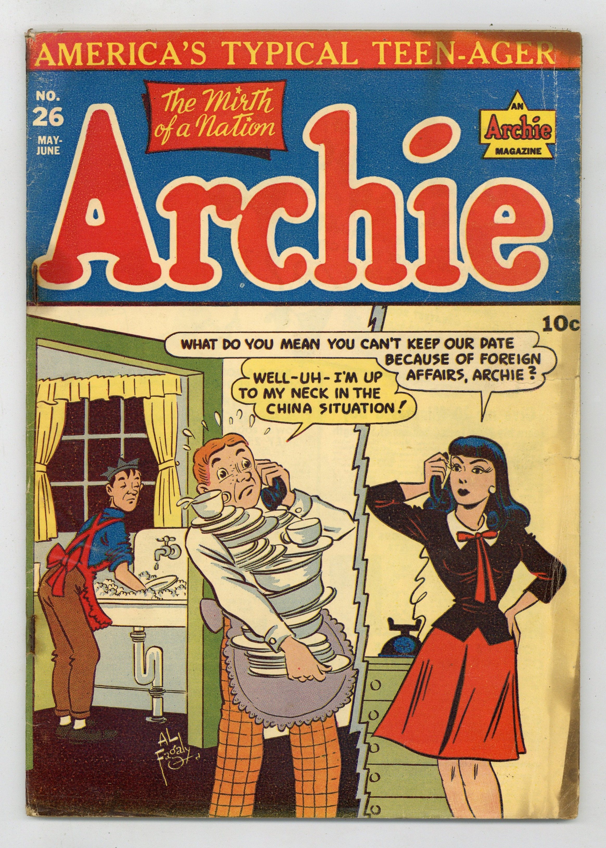 Cover by Al Fagaly. Stories by unknown. Art by Bill Vigoda and Irving Novick. Archie tries to escape an ugly girl named Esmerelda, who wants to sew her patch on him to take him to the patch hop, in the first Patch Day story "The Patch Hop"! Plus: Archie takes a skull from the school science room to practice his role in Hamlet, but causes chaos when he wears it to avoid Mr. Weatherbee in "The Play's the Thing"; Archie buys some invisible ink, but lands himself in hot water when his father mistakes it for real ink in "The Vanishing Act"; Betty and Veronica try out a ski slope inside Jonamaker's Department Store and end up wrecking the store; Archie and his father set up burglar traps around the house, just in time for rich Uncle Titus to visit, in "There Oughta Be a Law"; and Archie accidentally ends up on a ski trip that Mr. Weatherbee forbade him from attending! Also: 2-page text piece "Hollywood Tattle Tales"! And: "Archie Puzzle Page"! 48 pages, full color. Cover price $0.10.
