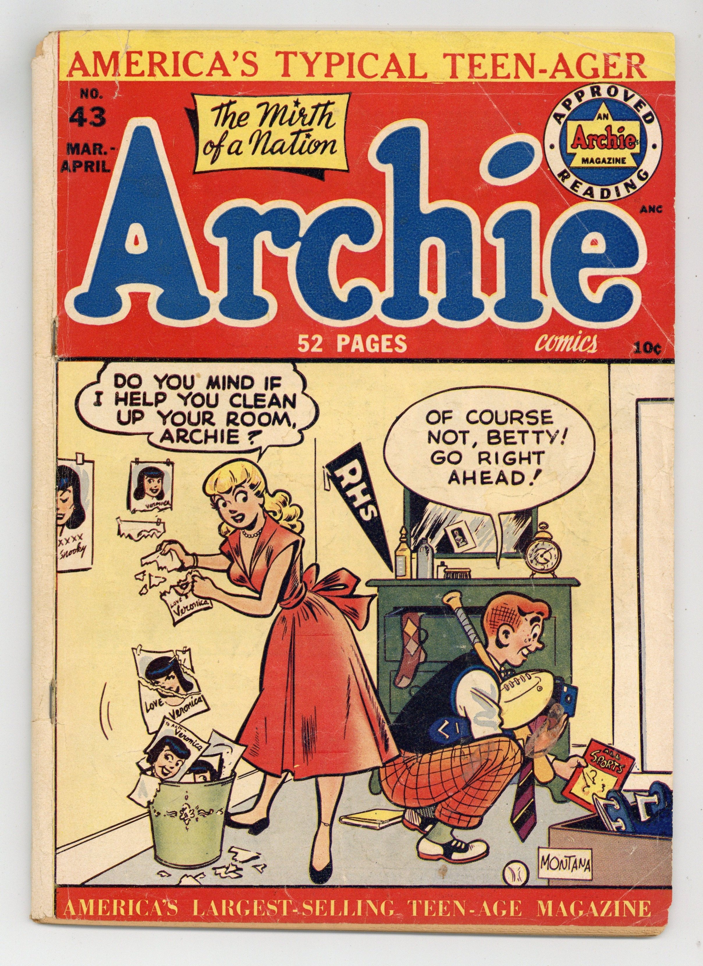 Cover by Bob Montana. Stories by unknown. Art by Bill Vigoda? and Sam Schwartz? Archie dreams of his future (like a Mort Weisinger story) in "Early To Bed"! Plus, Archie in: "Just Plain Geometry" (Miss Grundy shows she knows about love!); "The Bird Lover"; "A Paneful Experience"; "Raves and Waves" (Archie has his head shaved after the girls give him a permanent wave); and "Where There's Smoke"! Also: Jughead in "The Book Worm Turns"! And: 2-page "Hollywood Tattle Tales"! 48 pages, full color. Cover price $0.10.