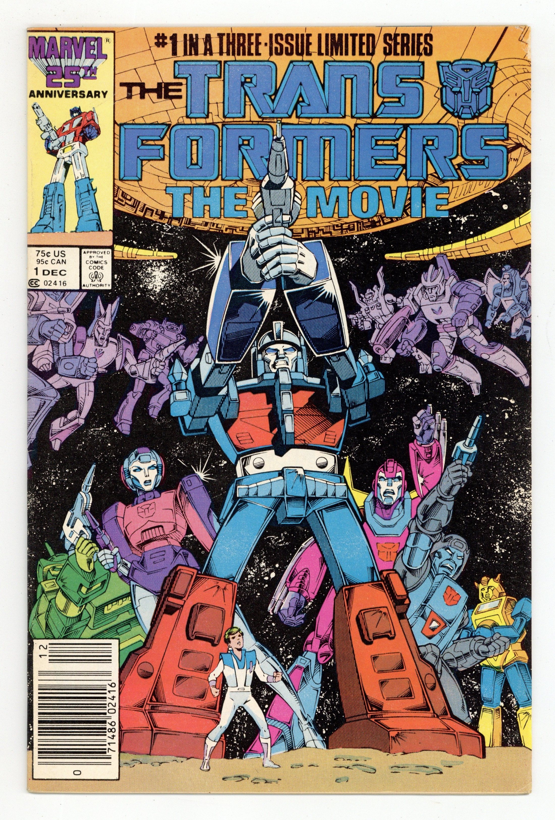 Tags: Transformers$13.50Newsstand Edition. "The Planet Eater!" Part 1 of 3. Adapted by Ralph Macchio. Art by Don Perlin, Ian Akin, and Brian Garvey. It is the near future and the millennium old war between the Autobots and the Decepticons comes to a head in an epic battle that leaves many familiar faces dead. New heroes, Ultra Magnus, Hot Rod, a small group of rebels, must do everything in their power to keep the Matrix from falling into the hands of the enemy. Plus, looming in the distance is the ever approaching planet consuming power known as Unicron. 32 pages. Cover price $0.75.
