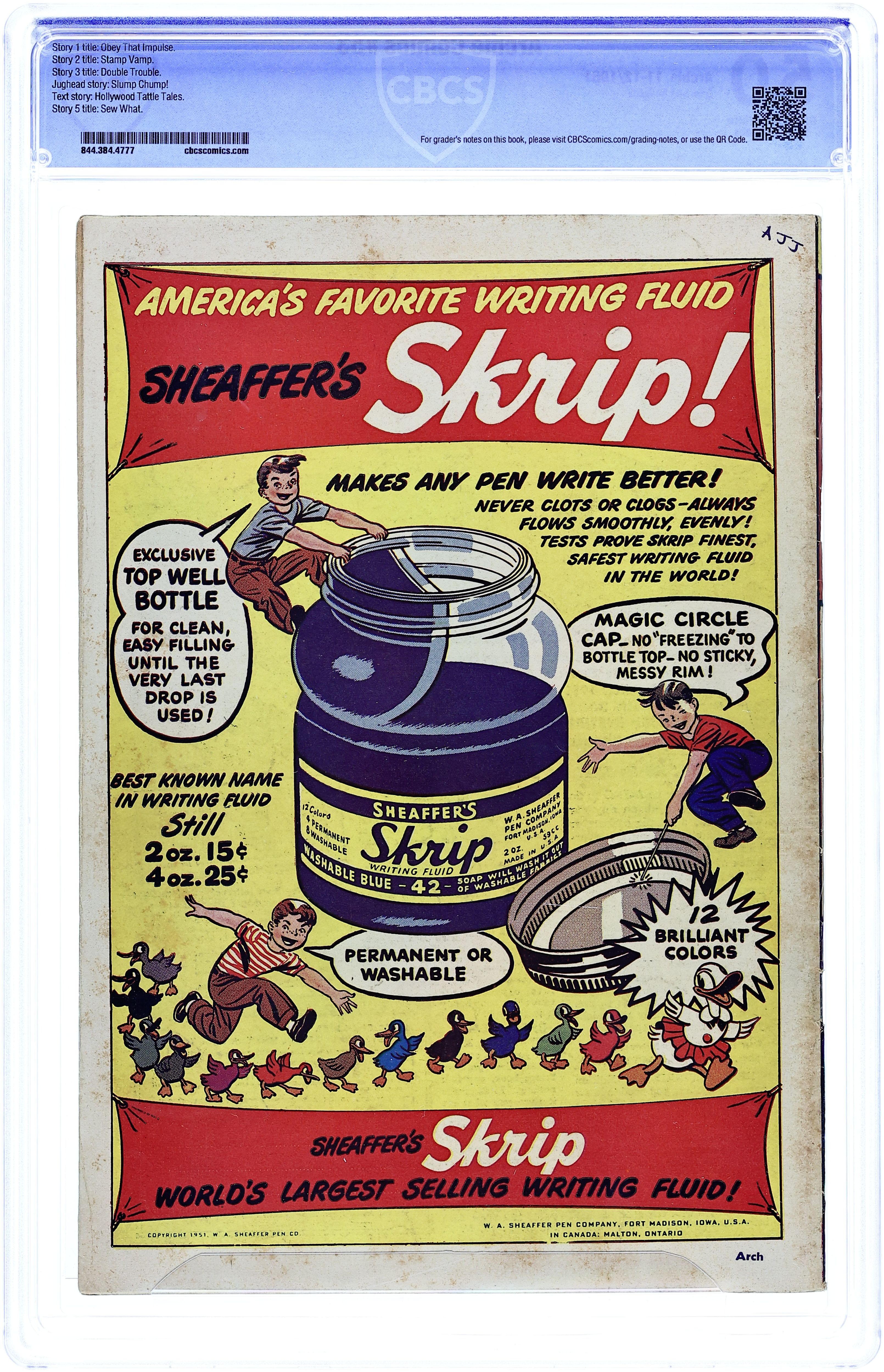 Cover by Bill Vigoda. Stories by unknown. Art by Bill Vigoda, George Frese and unknown. Mr. Weatherbee institutes Dilton's "obey your impulse" mantra throughout the school, to disastrous results, in "Obey That Impulse"! Plus: Betty takes up stamp collecting when Archie shows an interest in "Stamp Vamp"; Archie is roped into joining the football team in "The Drawback"; Archie balances simultaneous dates with Betty and Veronica in "Double Trouble"; Mr. Weatherbee takes tips on how to relax from Jughead in "Slump Chump!"; Mr. Andrews cooks a meal for Archie in the 1-pager "What's Cookin?"; and Archie tries to clean and repair Veronica's torn dress before a party in "Sew What"! Also: 2-page text piece "Hollywood Tattle Tales"! And: "Archie Fun Page"! 52 pages, full color. Cover price $0.10.