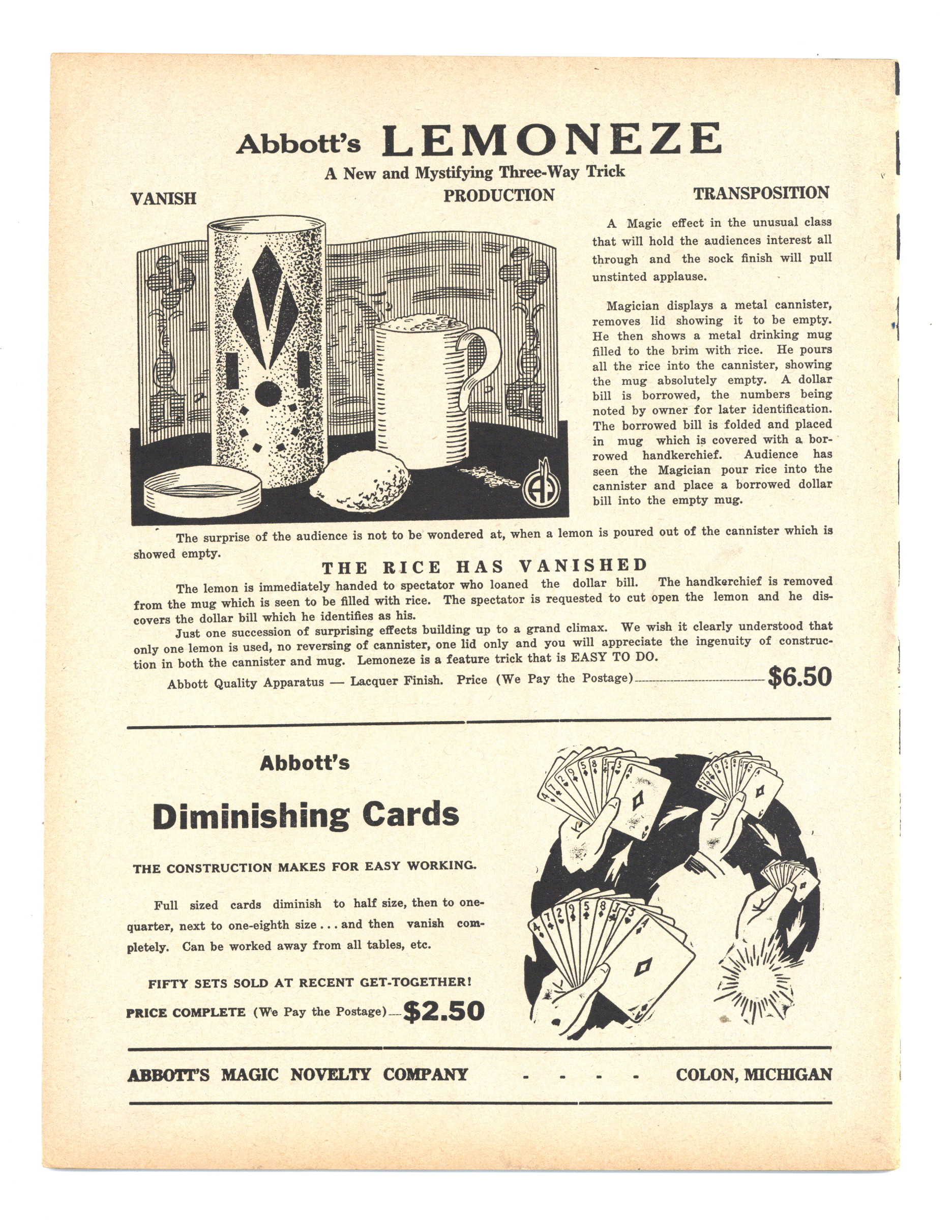 Published Aug 1945 by Abbott Magic & Novelty Co..$34.00Vol. 10, No. 8 - August , 1945. Independent magazine in which those interested in Magic may express their thoughts, ideas, and criticisms. 8.5" x 11", 28 pages, B&W. Cover price $0.25.