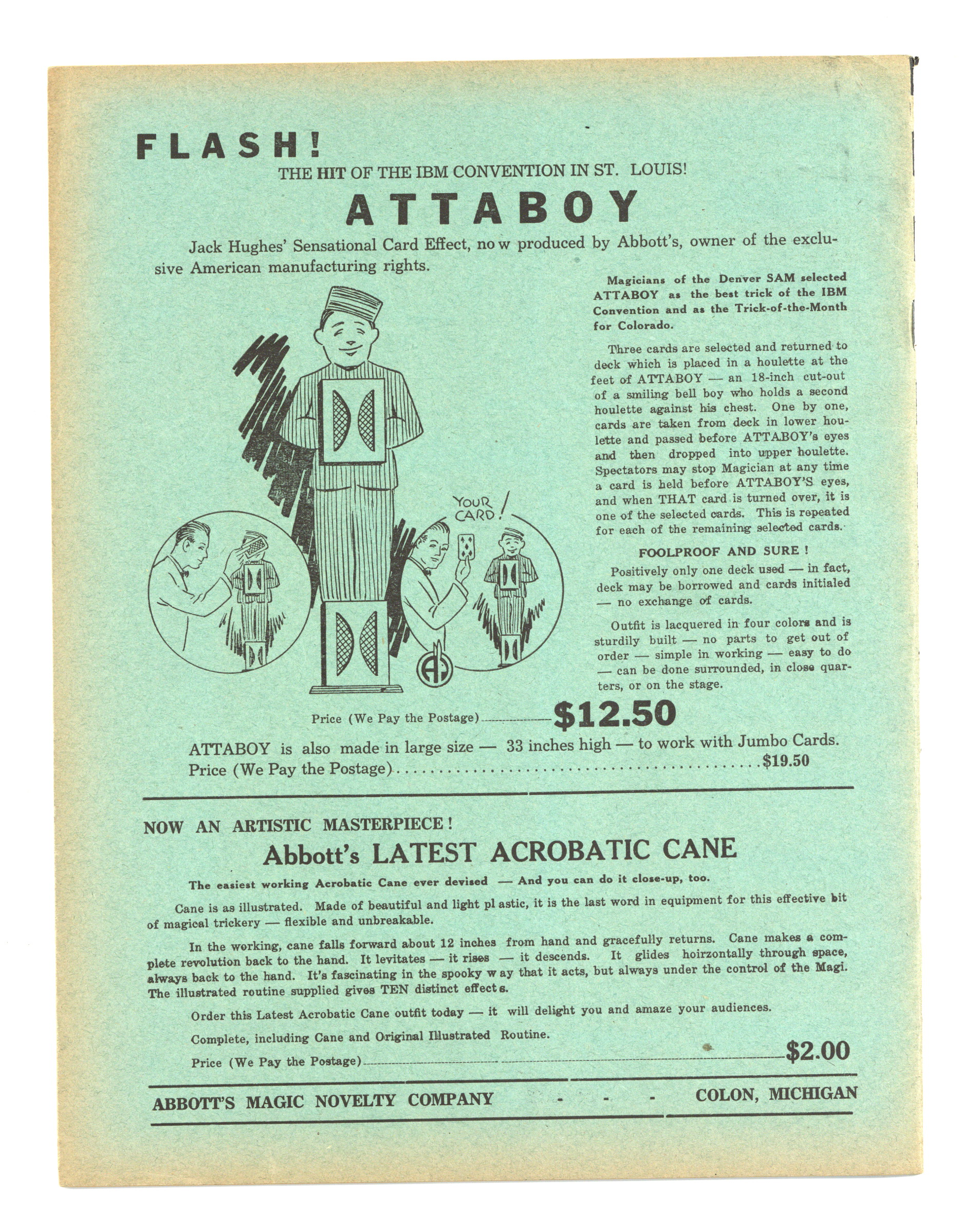 Published Sep 1946 by Abbott Magic & Novelty Co..$26.00Vol. 11, No. 9 - September , 1946. Independent magazine in which those interested in Magic may express their thoughts, ideas, and criticisms. 8.5" x 11", 28 pages, B&W. Cover price $0.25.