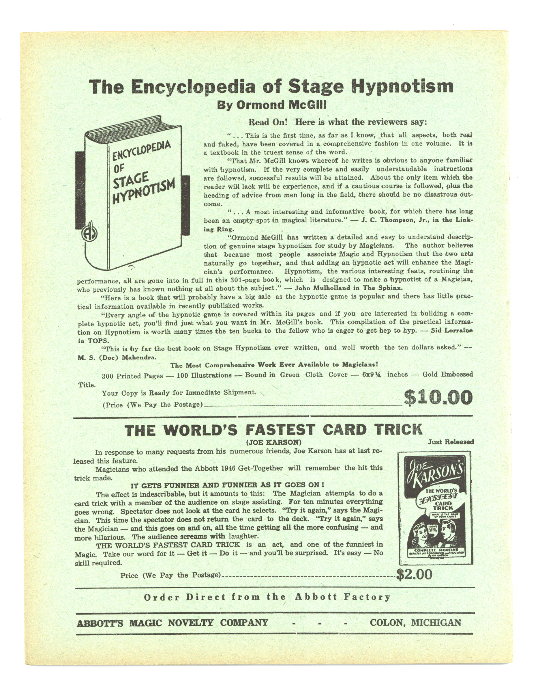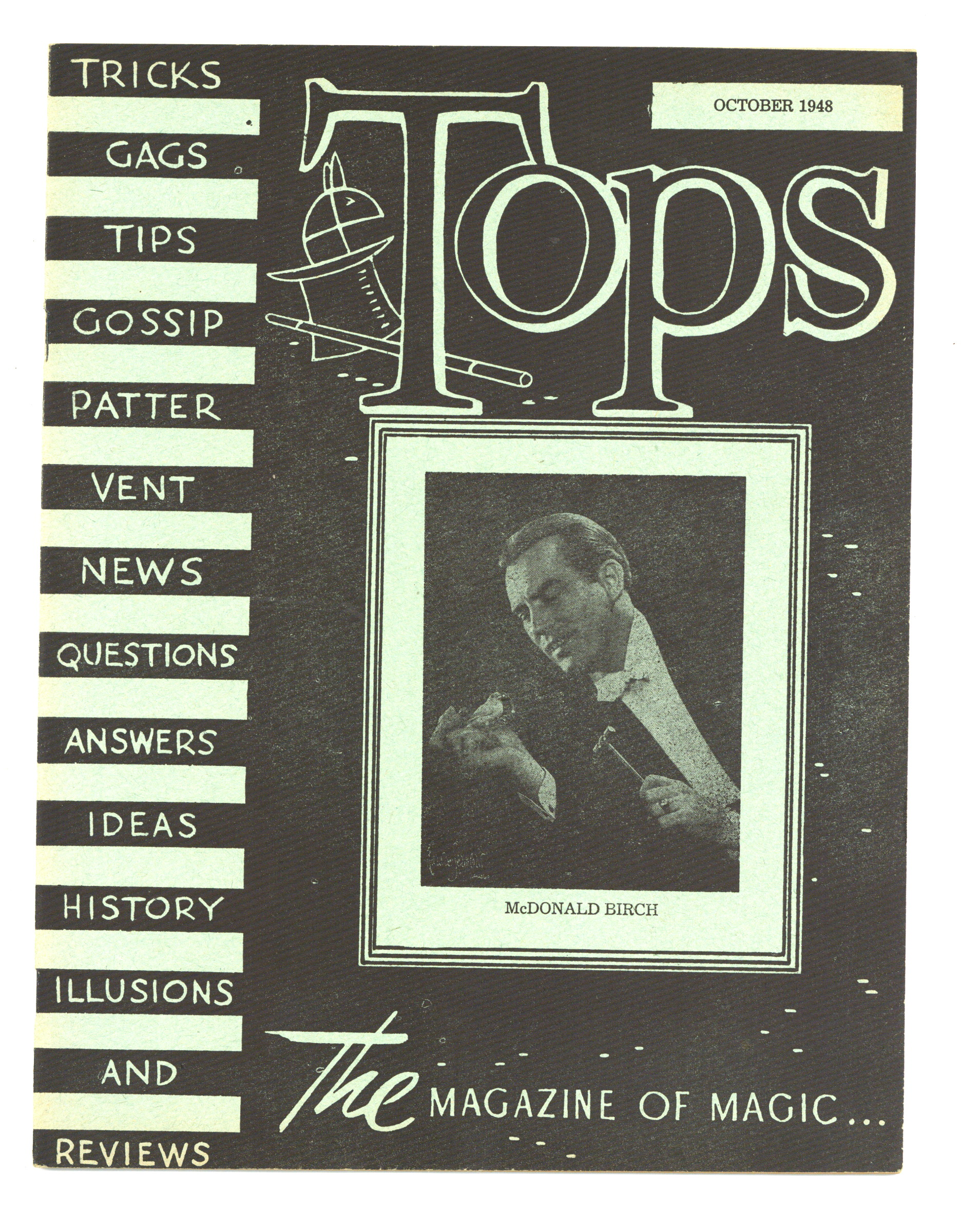 Published Oct 1948 by Abbott Magic & Novelty Co..$66.00Vol. 13, No. 10 - October , 1948. Independent magazine in which those interested in Magic may express their thoughts, ideas, and criticisms. 8.5" x 11", 28 pages, B&W. Cover price $0.25.